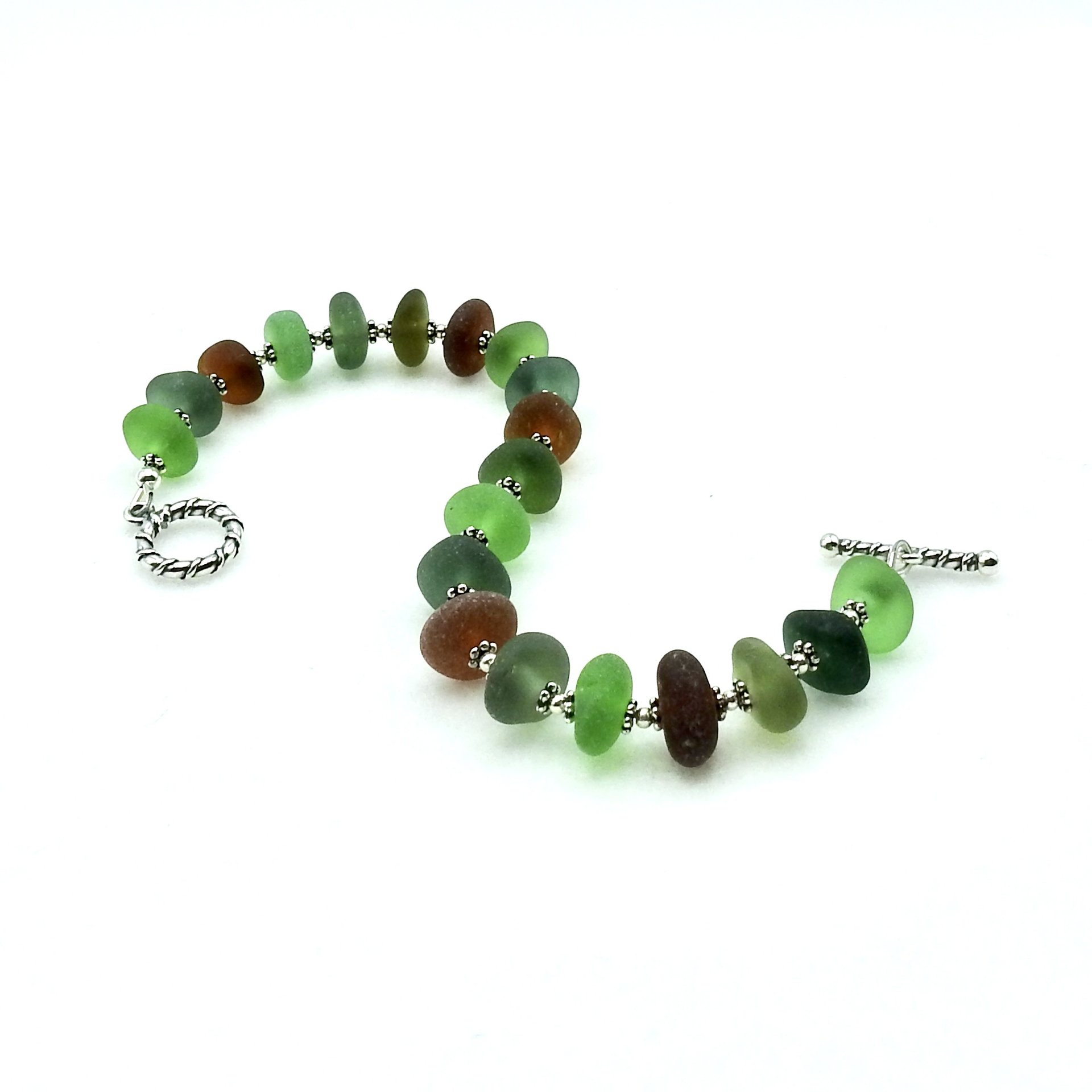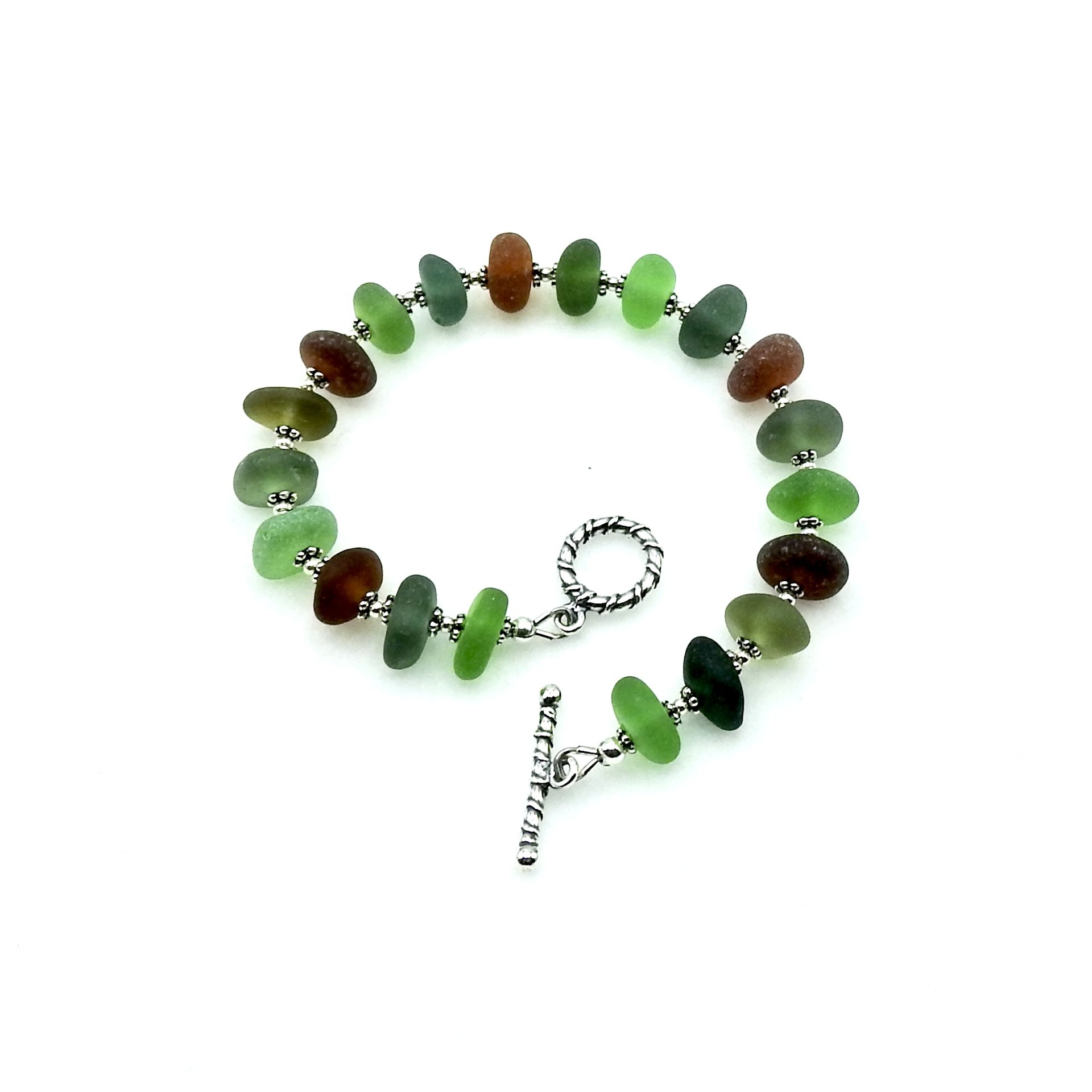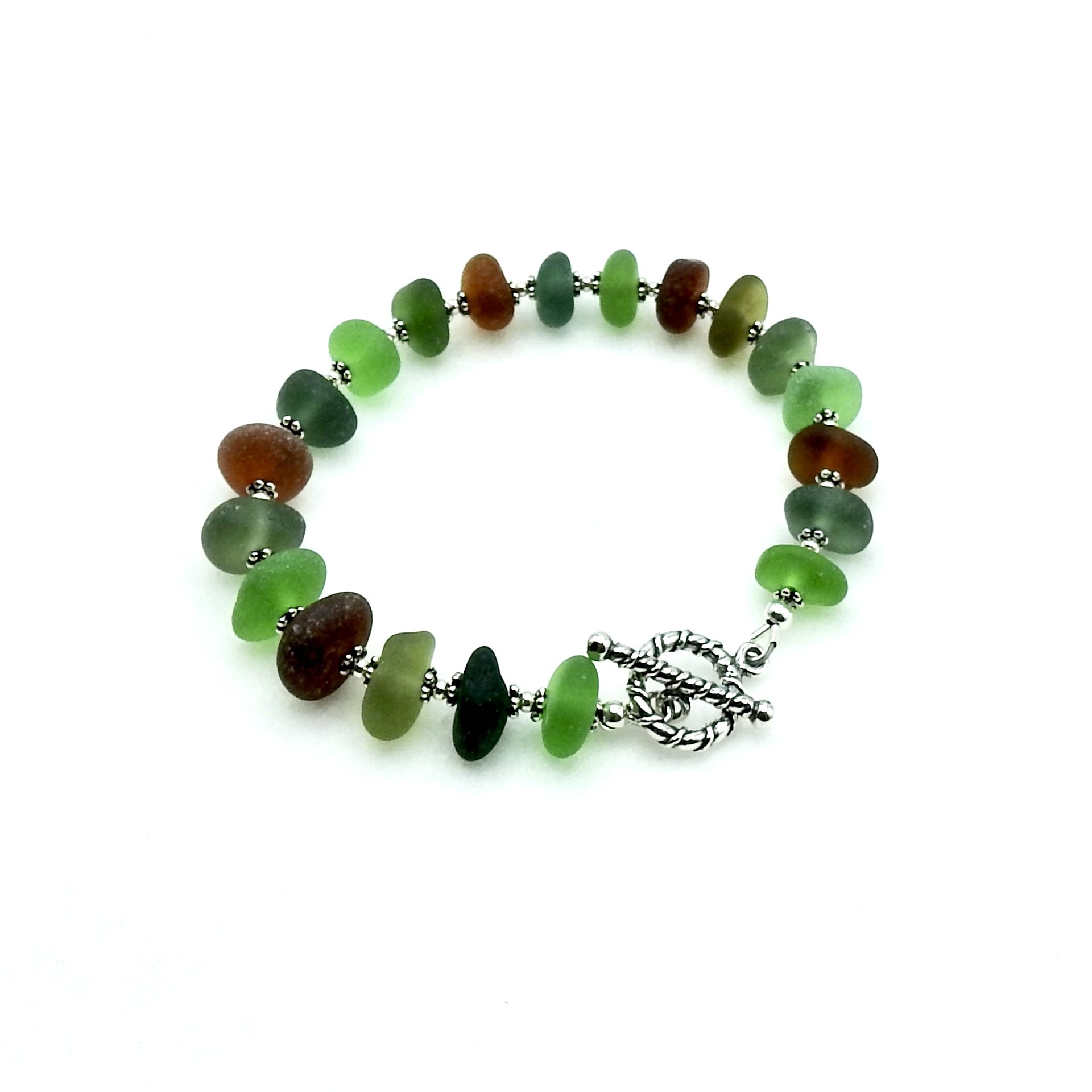 A beach themed beaded bracelet, handmade with genuine sea glass in mixed colours with a sterling silver twist design toggle clasp.