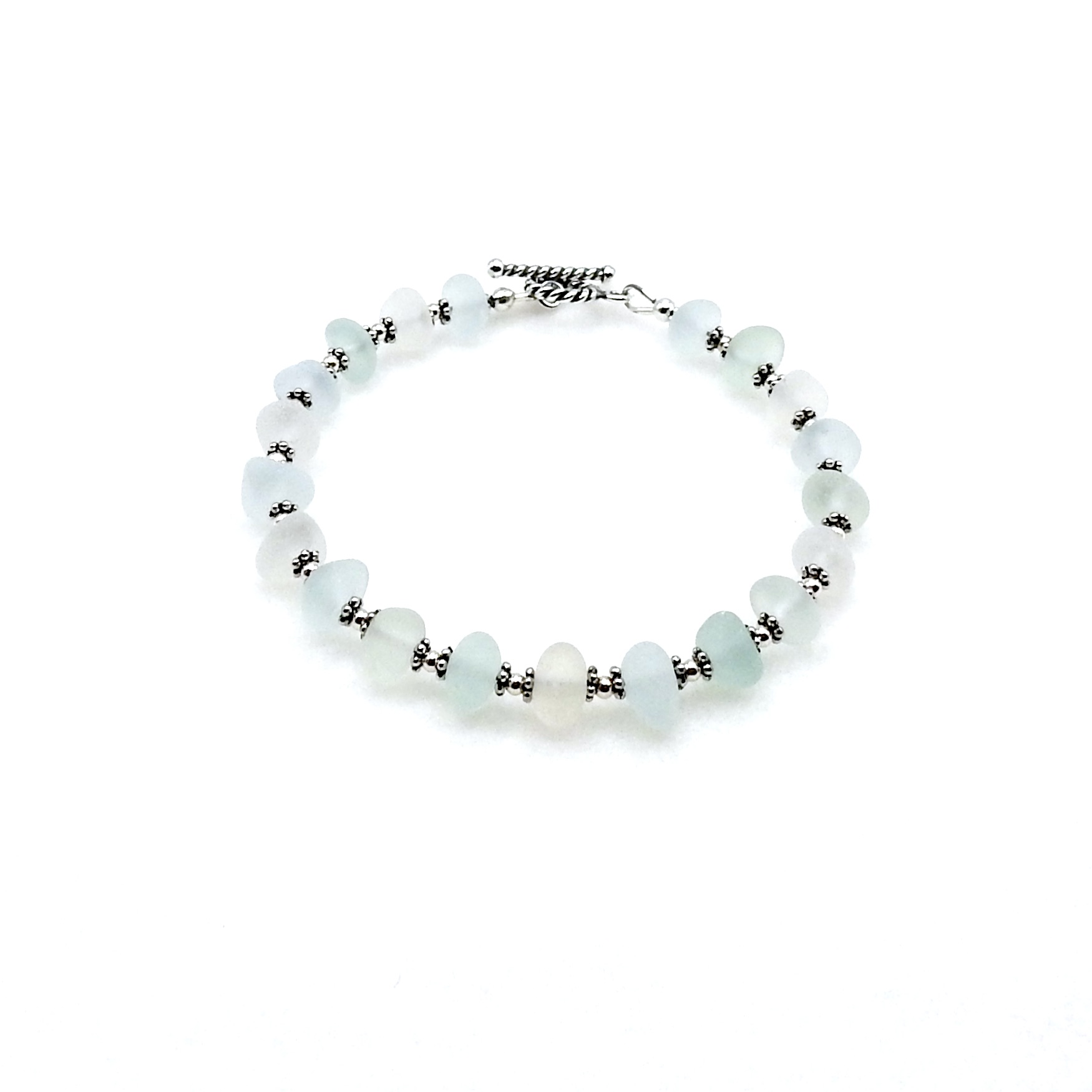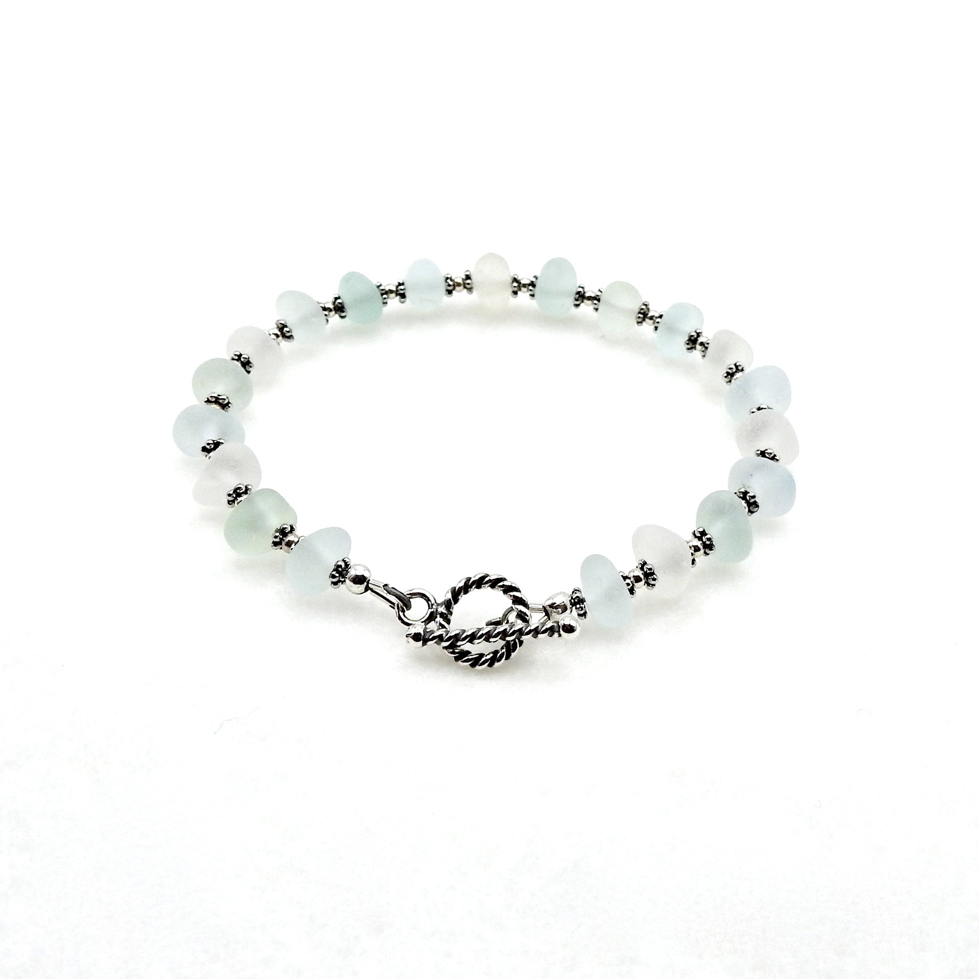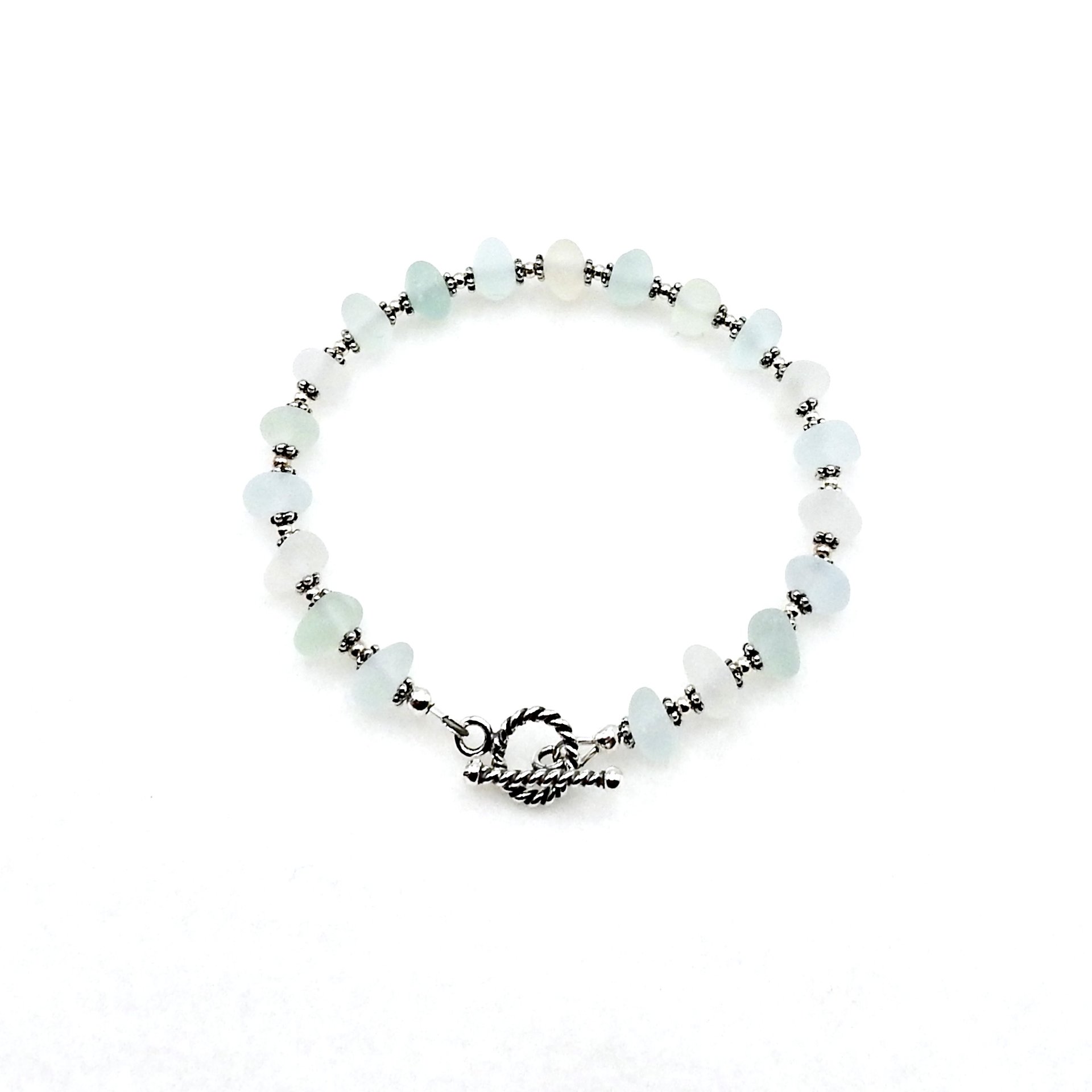 - materials - genuine sea glass (about 5/16" - 7.9cm), sterling silver toggle clasp, round beads and components, lead free silver plated pewter beads, nylon coated stainless steel stringing wire