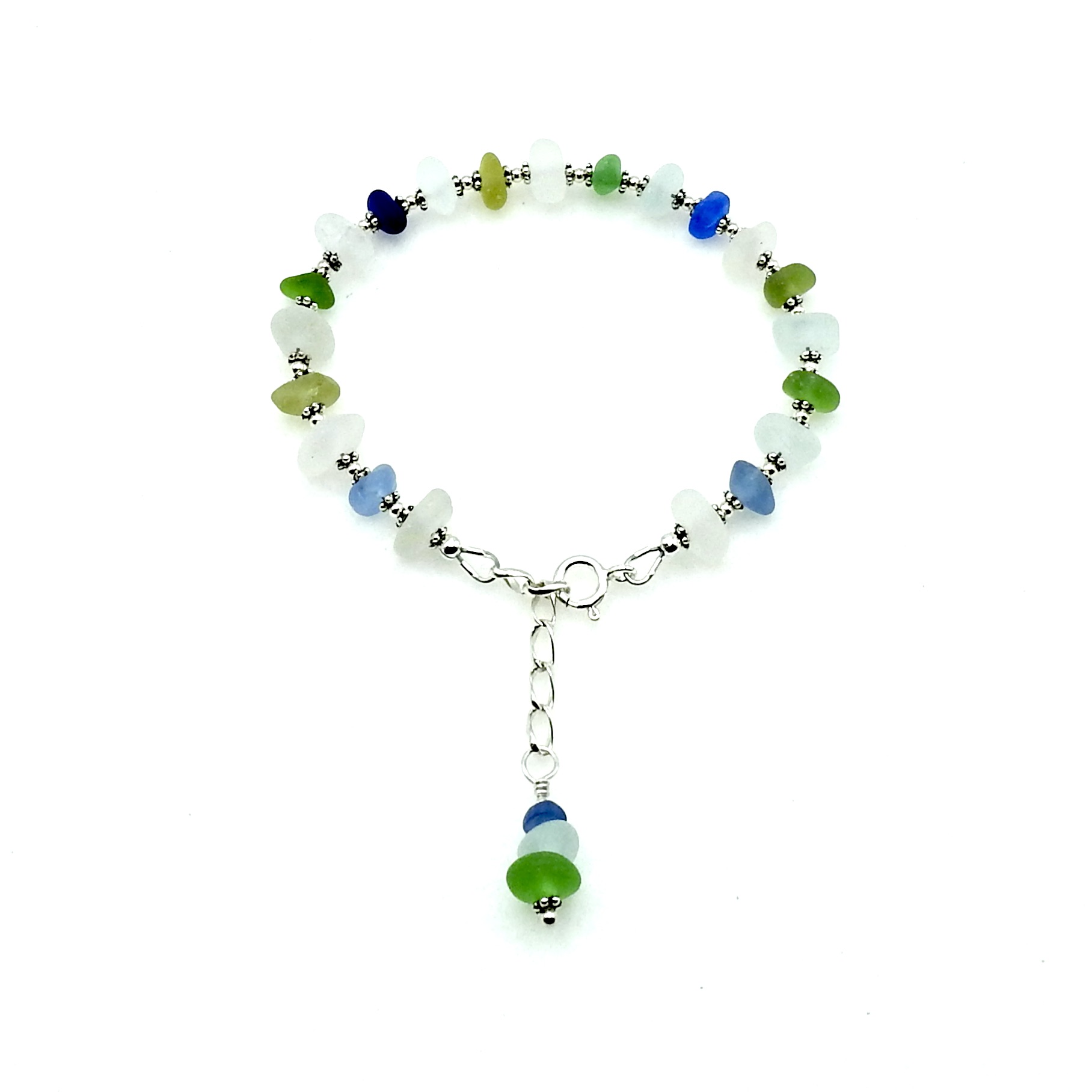 An adjustable bracelet handmade with genuine sea glass in a mix of colours with a sterling silver chain dangle.