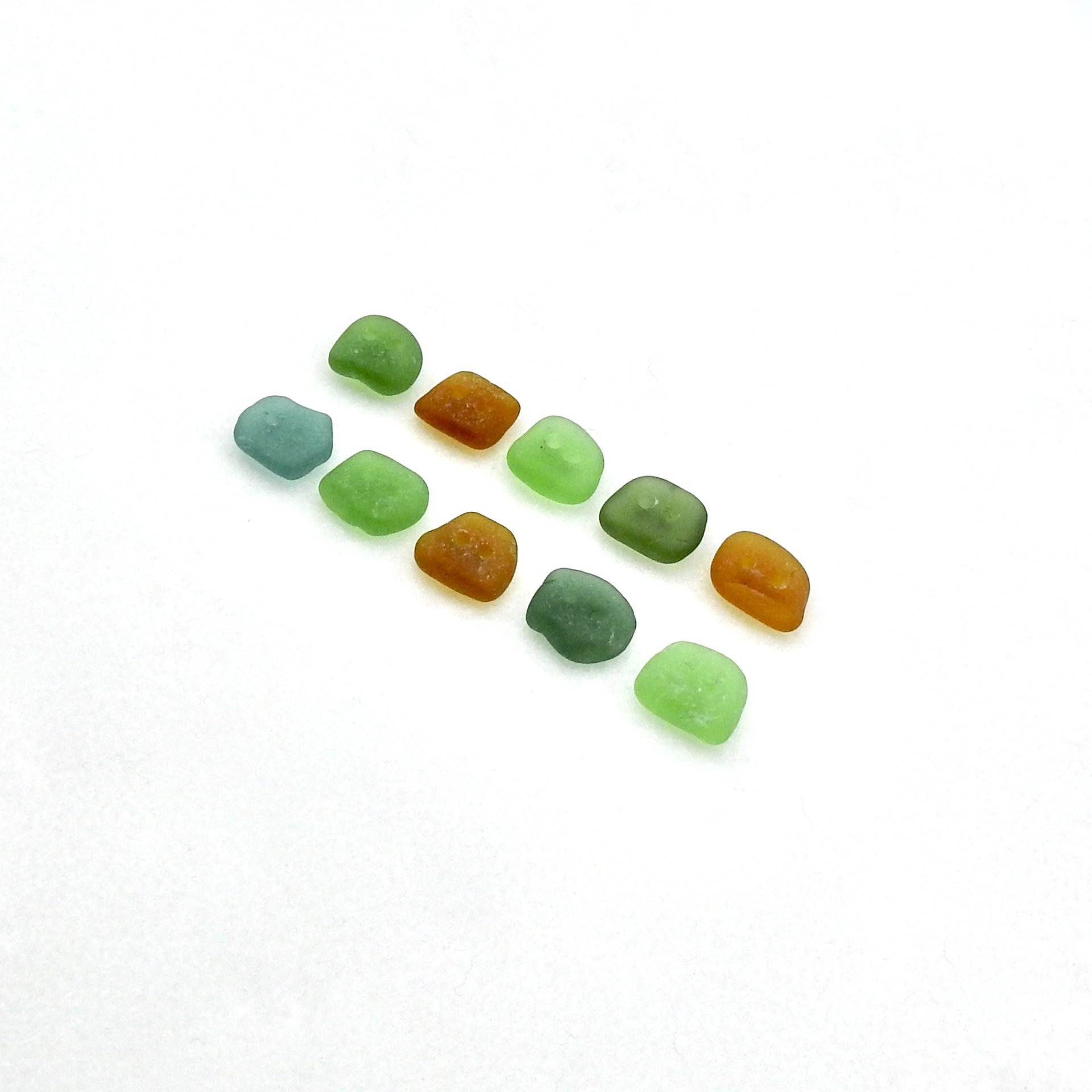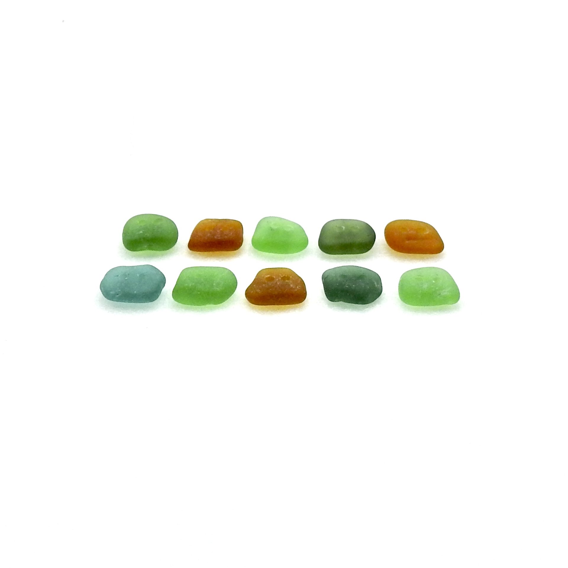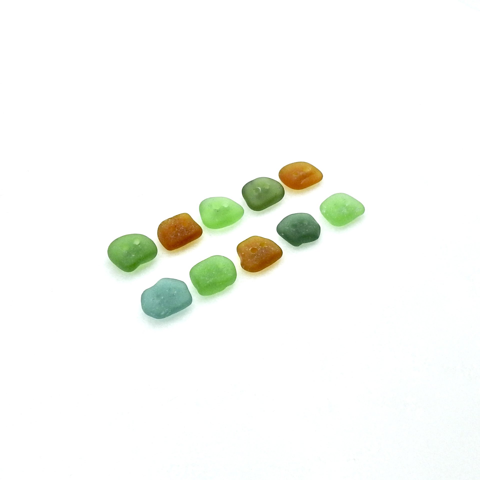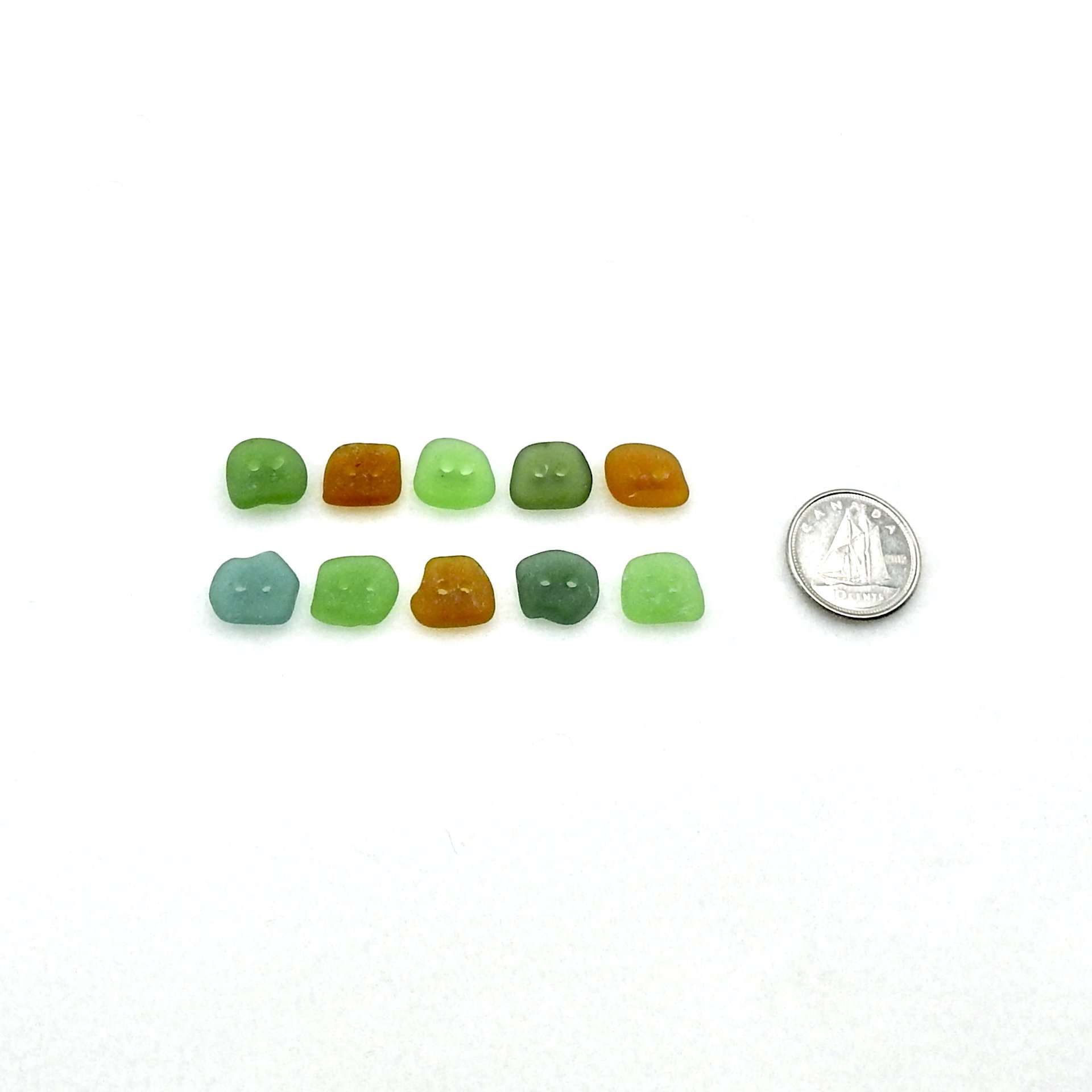 Genuine sea glass buttons, set of 10, in shades of green and brown with two drilled holes for sewing, decoration or other beach themed crafts.