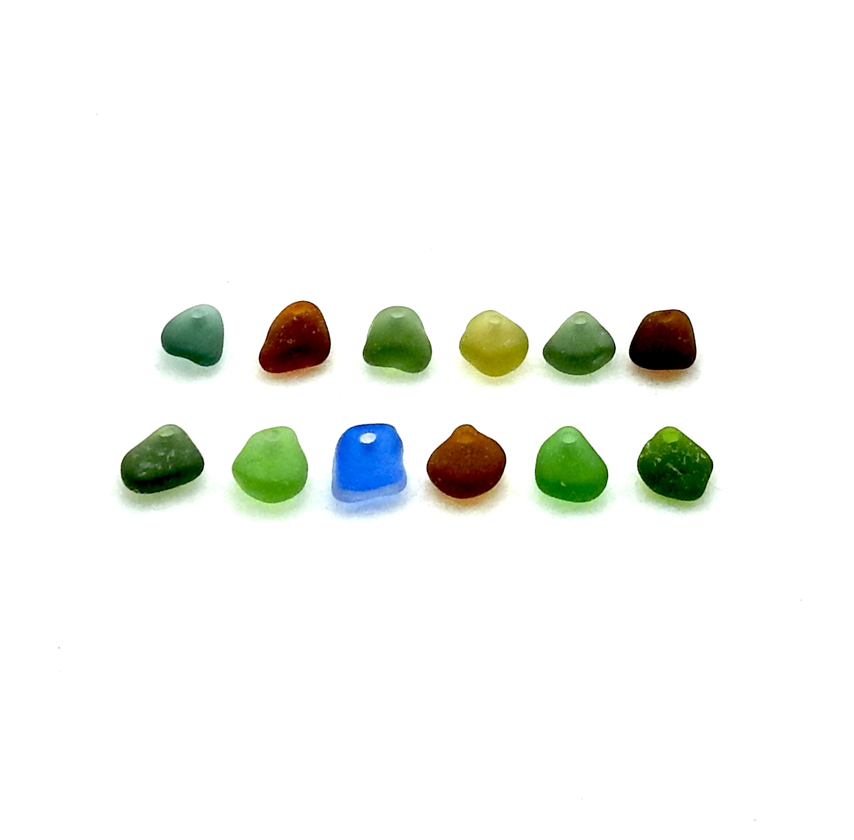 Real sea glass small charms in mixed colours, set of 12, with top drilled holes for jewelry making or other beached themed crafts.
