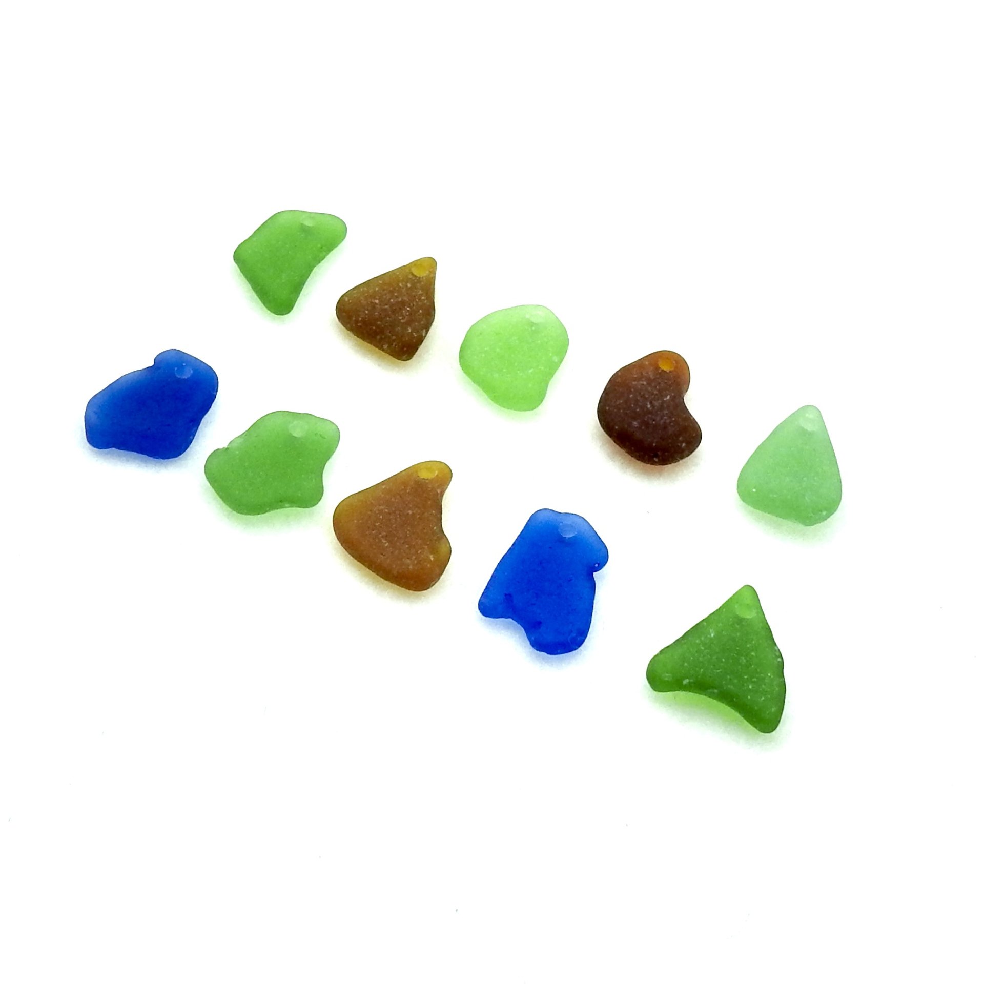 Real sea glass charms in mixed colours, set of 10, with top drilled holes for jewelry making or other beached themed crafts.