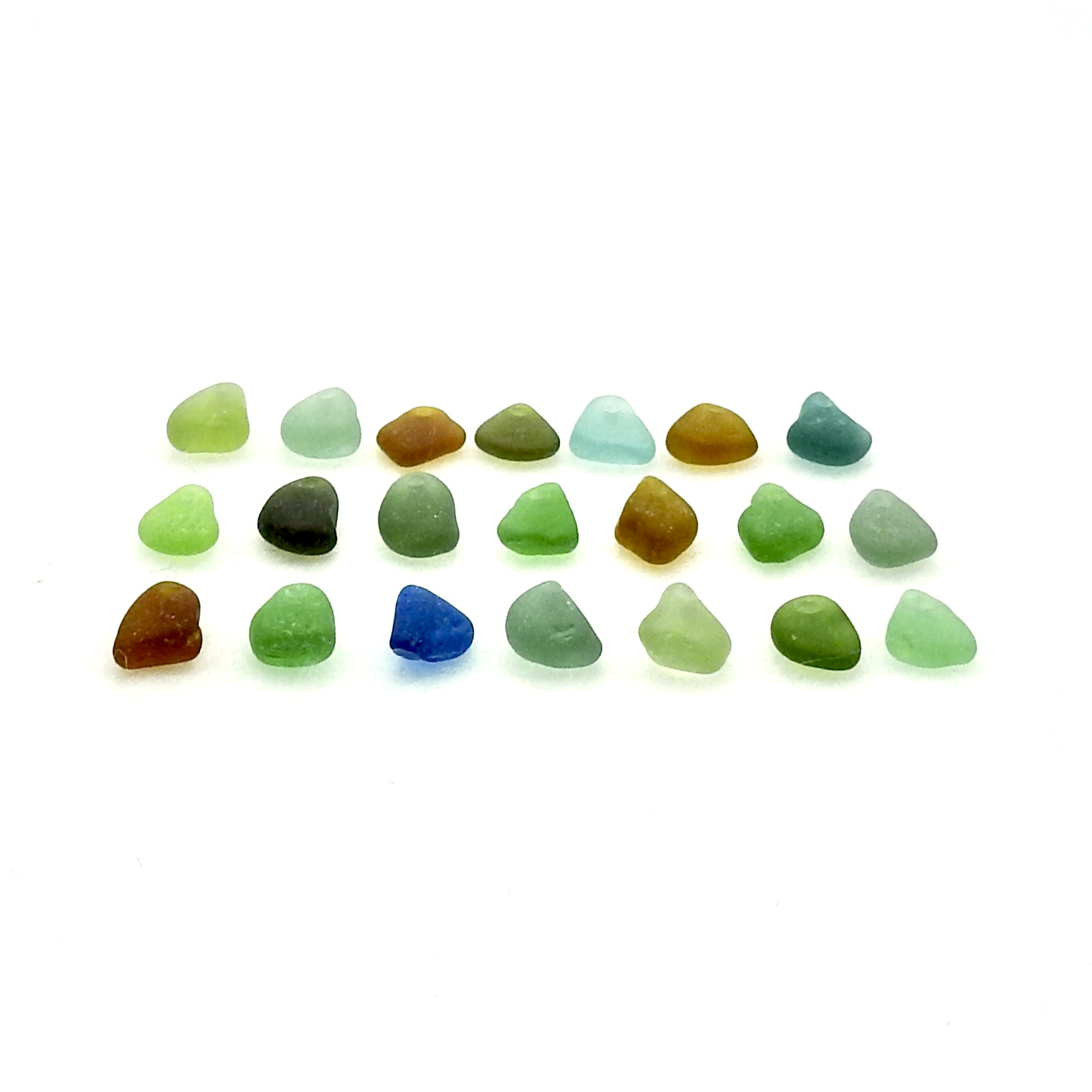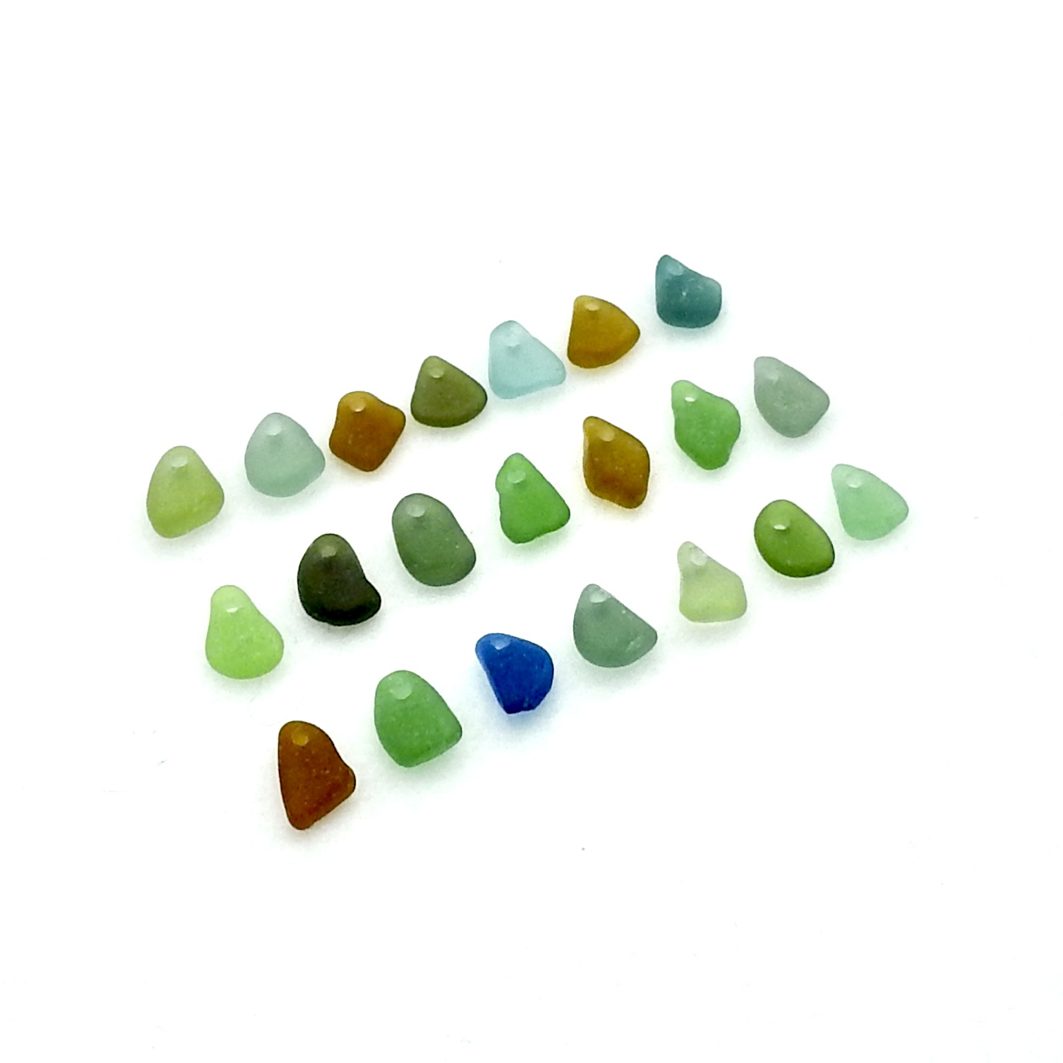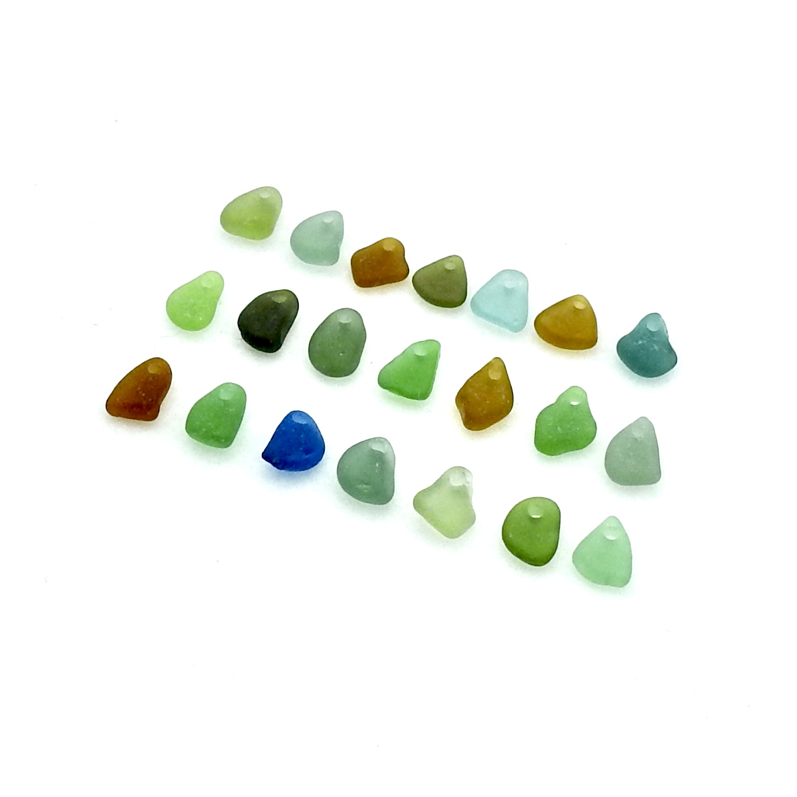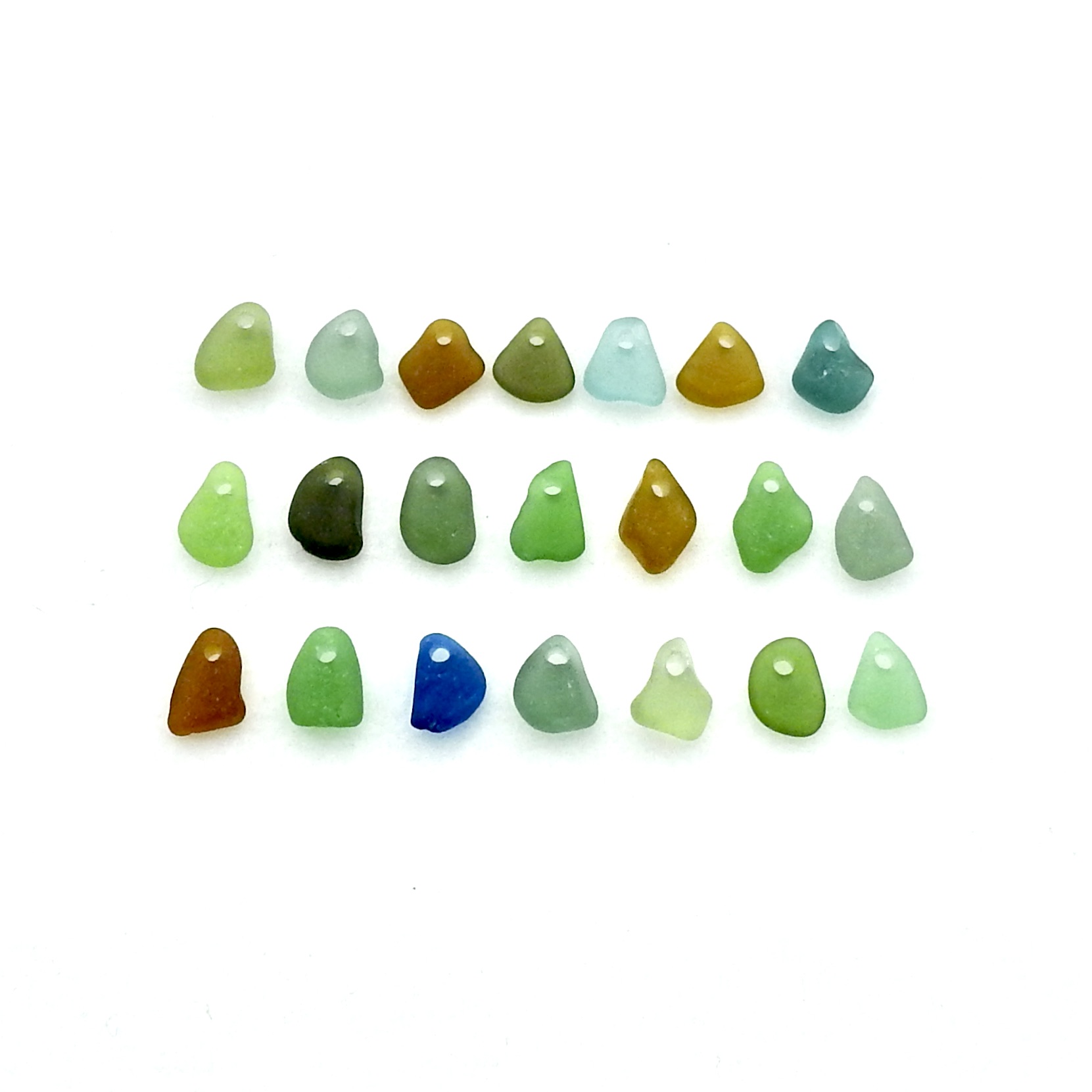 Genuine sea glass charms, set of 21, in multi colours with top drilled holes for jewelry making or other beach themed crafts.