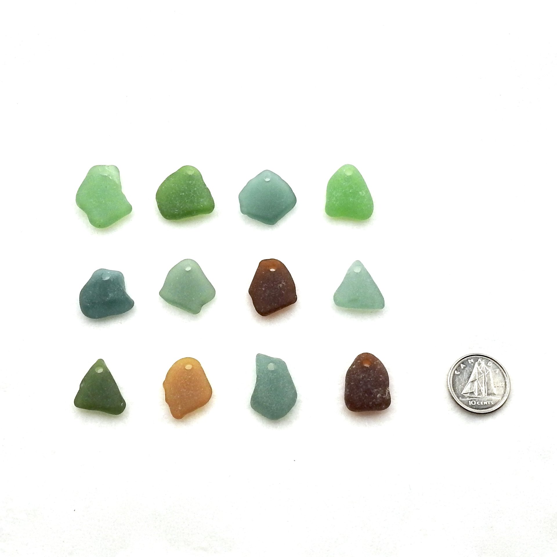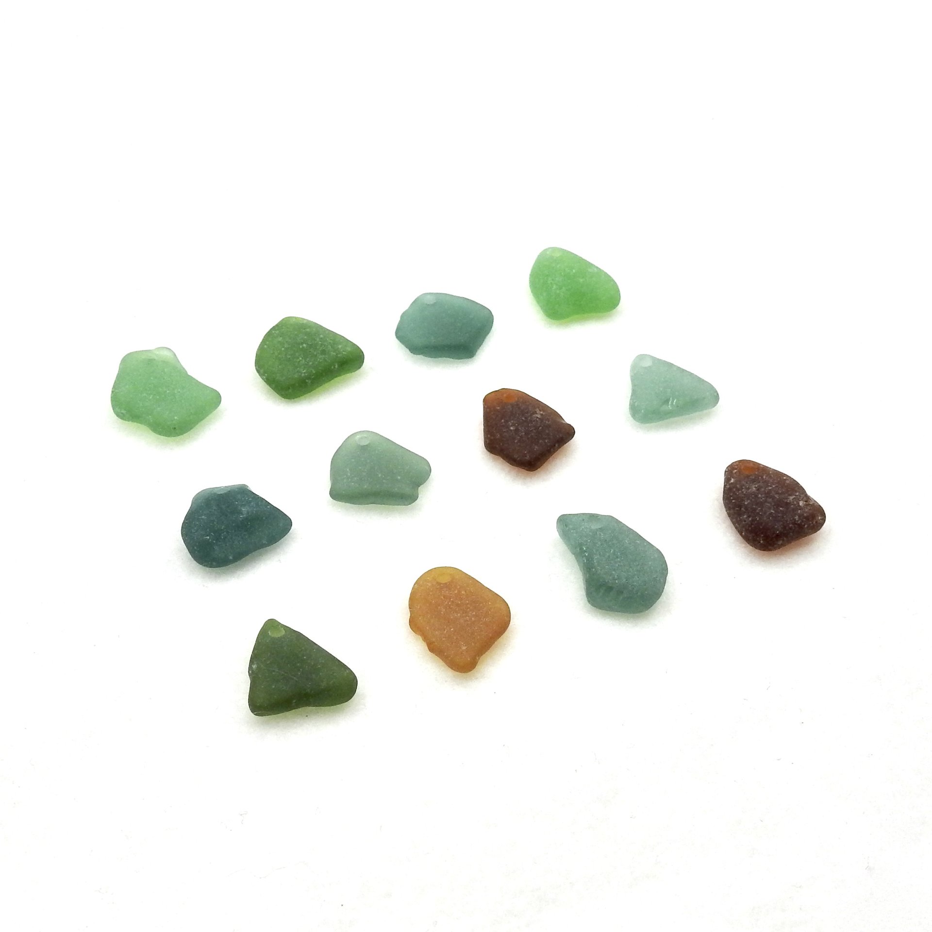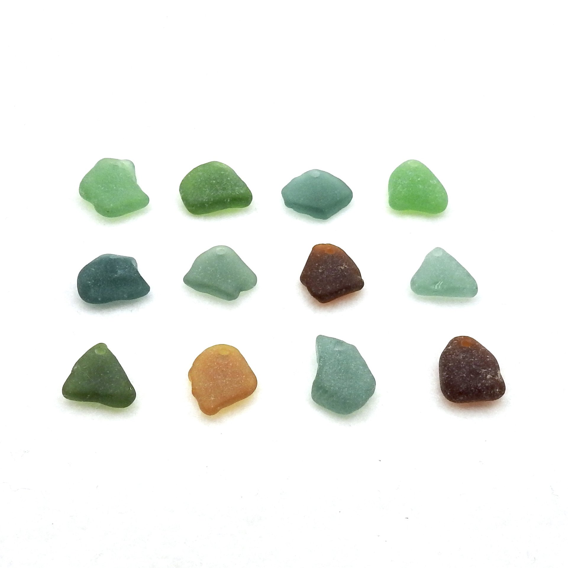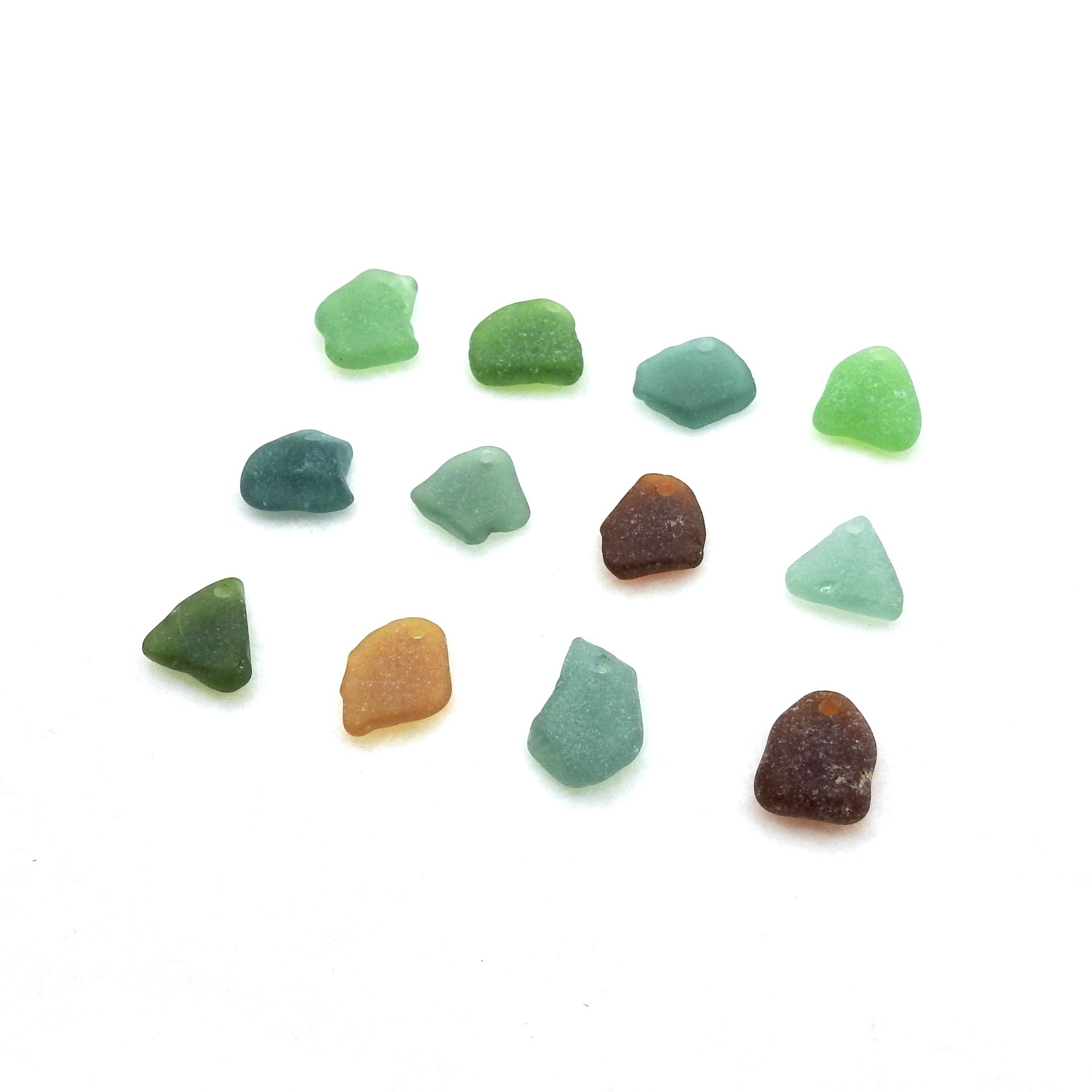 Real sea glass charms, set of 12, in assorted colors for jewelry making or other beach themed craft projects.