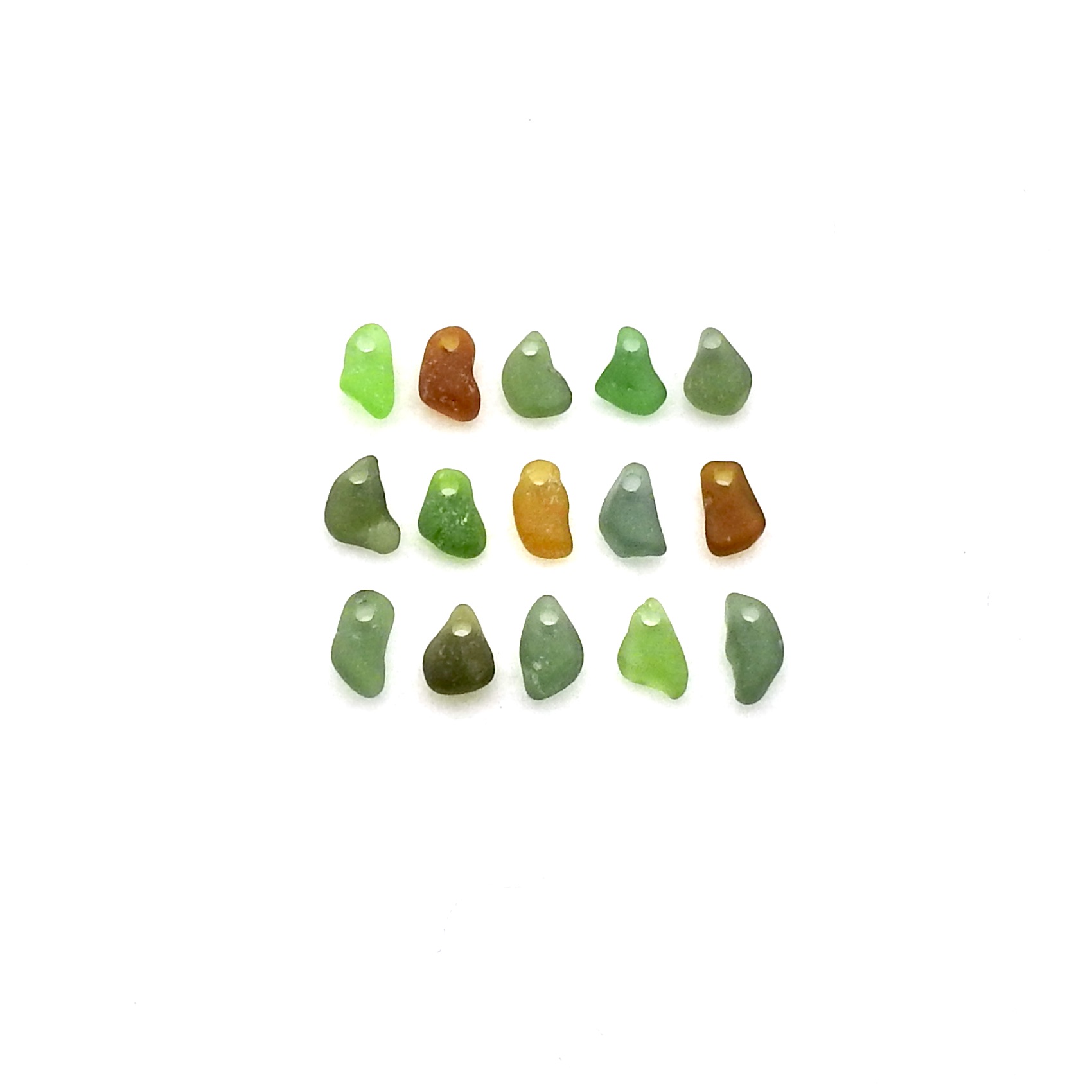 Genuine sea glass charms, set of 15, in multi colours with top drilled holes for jewelry making, sew on fringe decoration or other beach themed crafts.