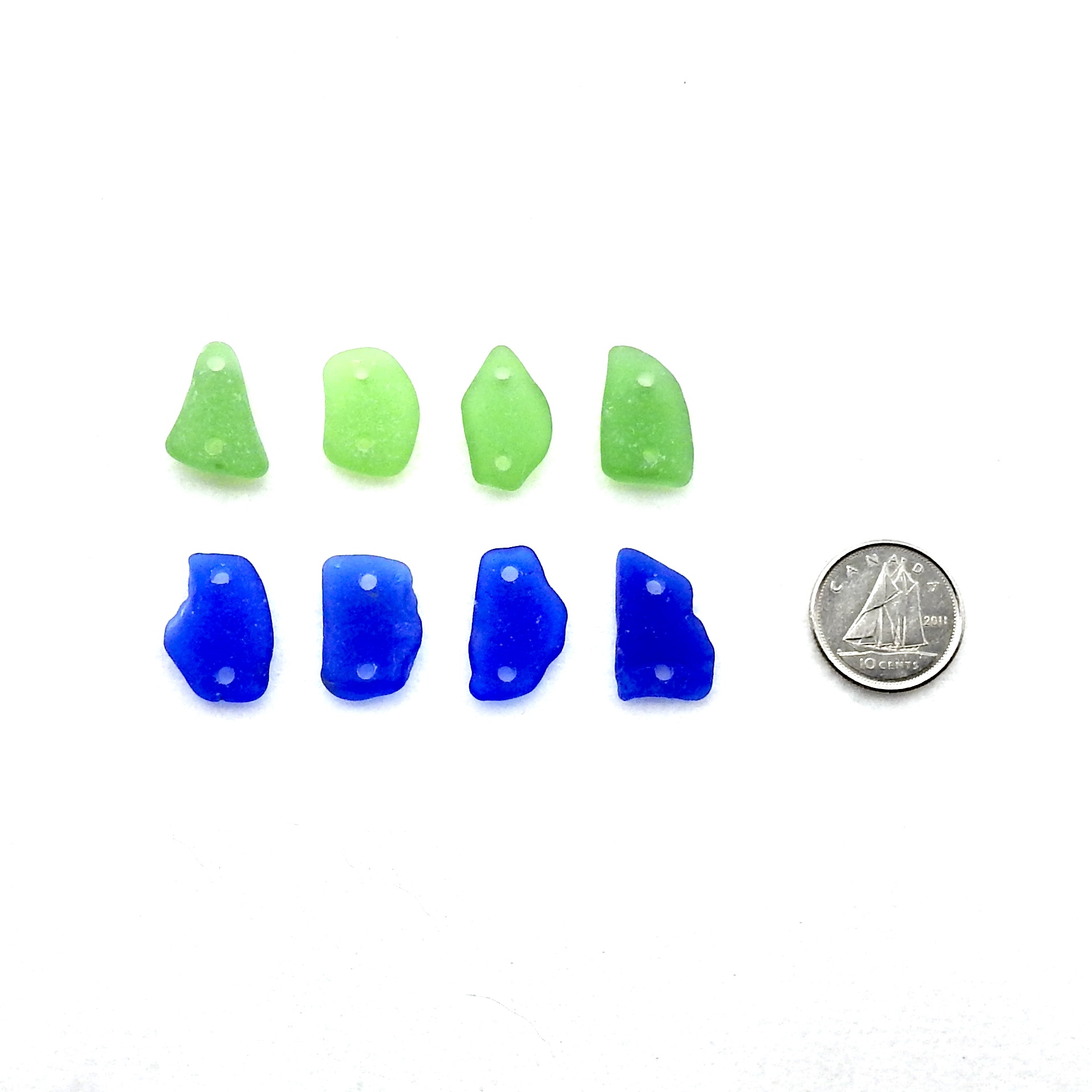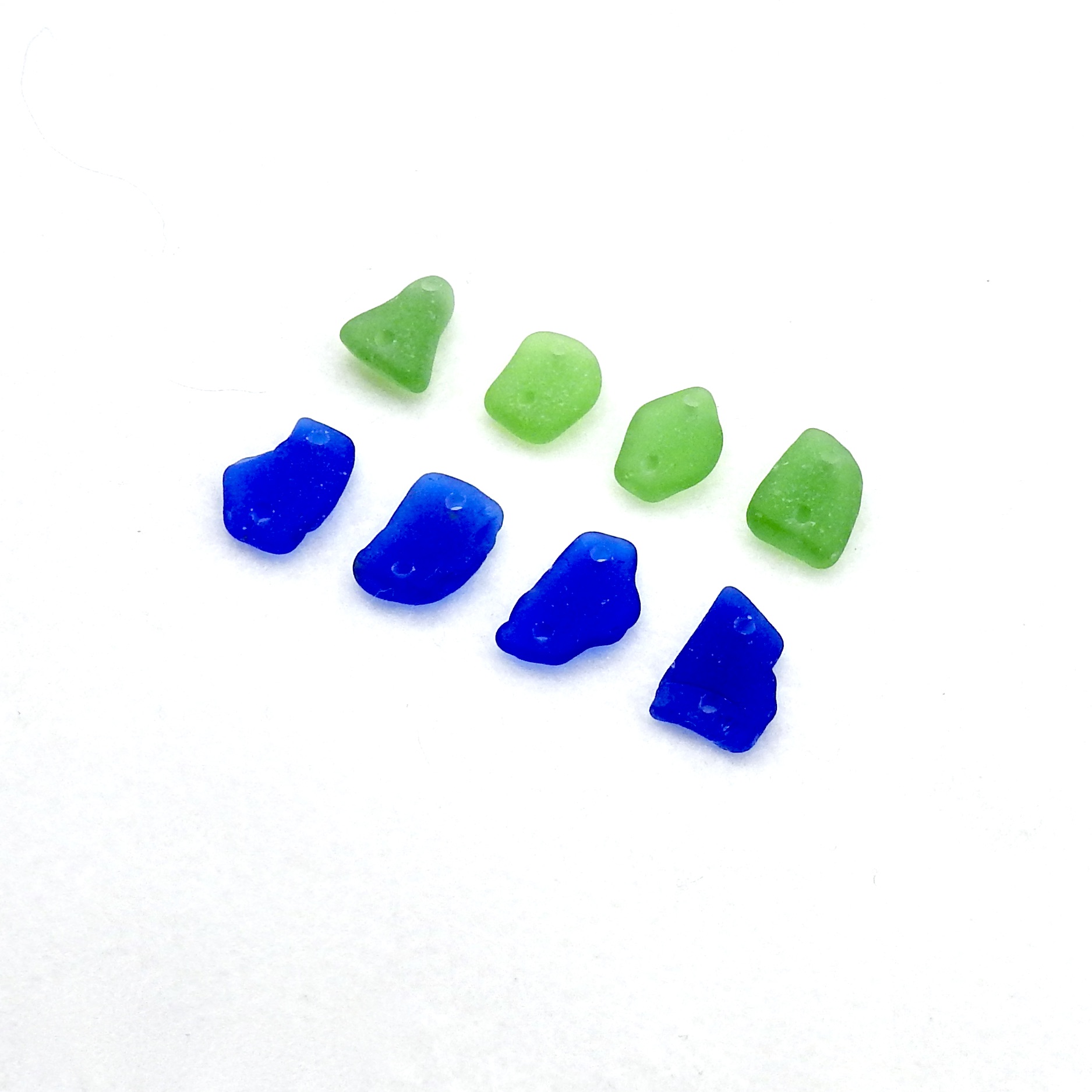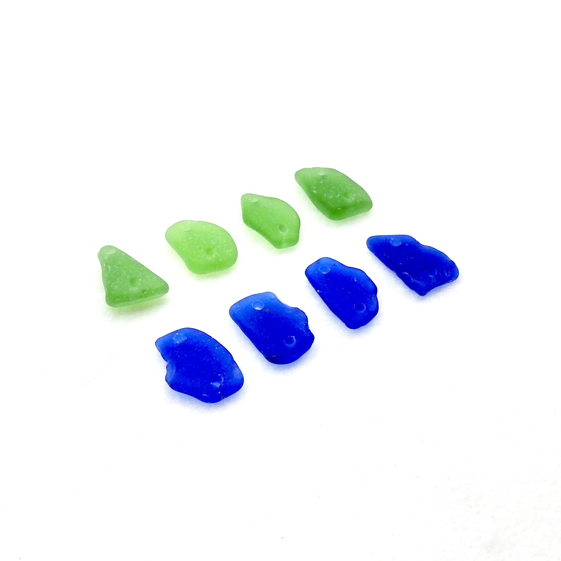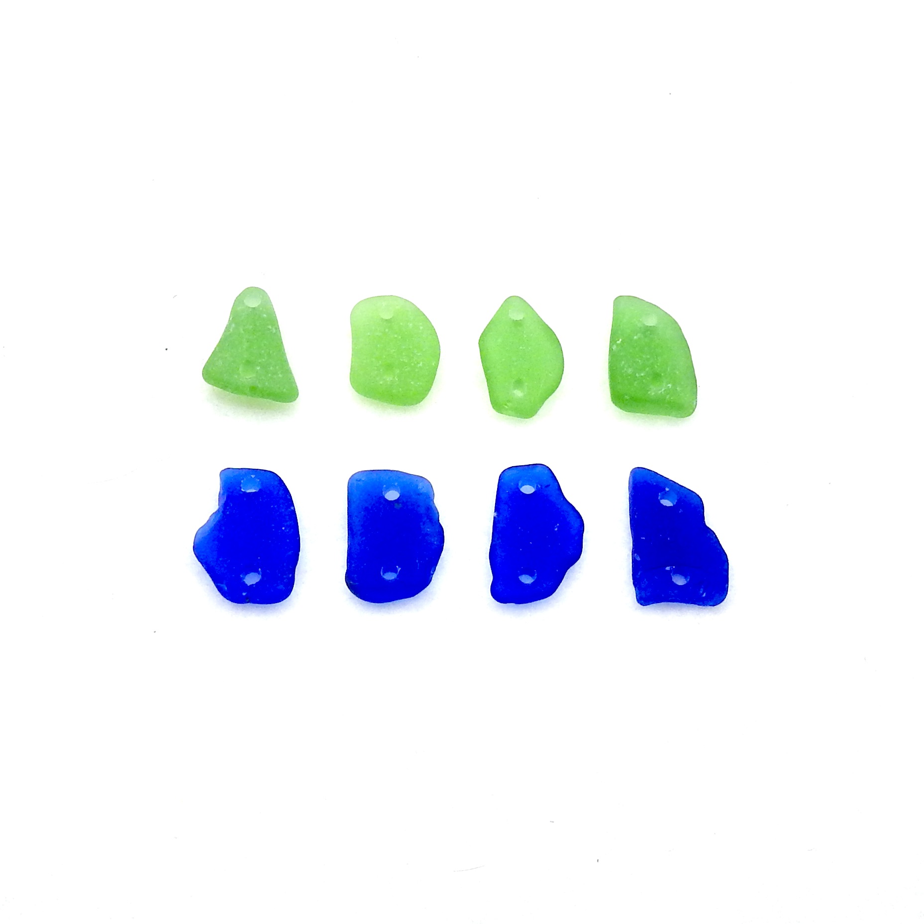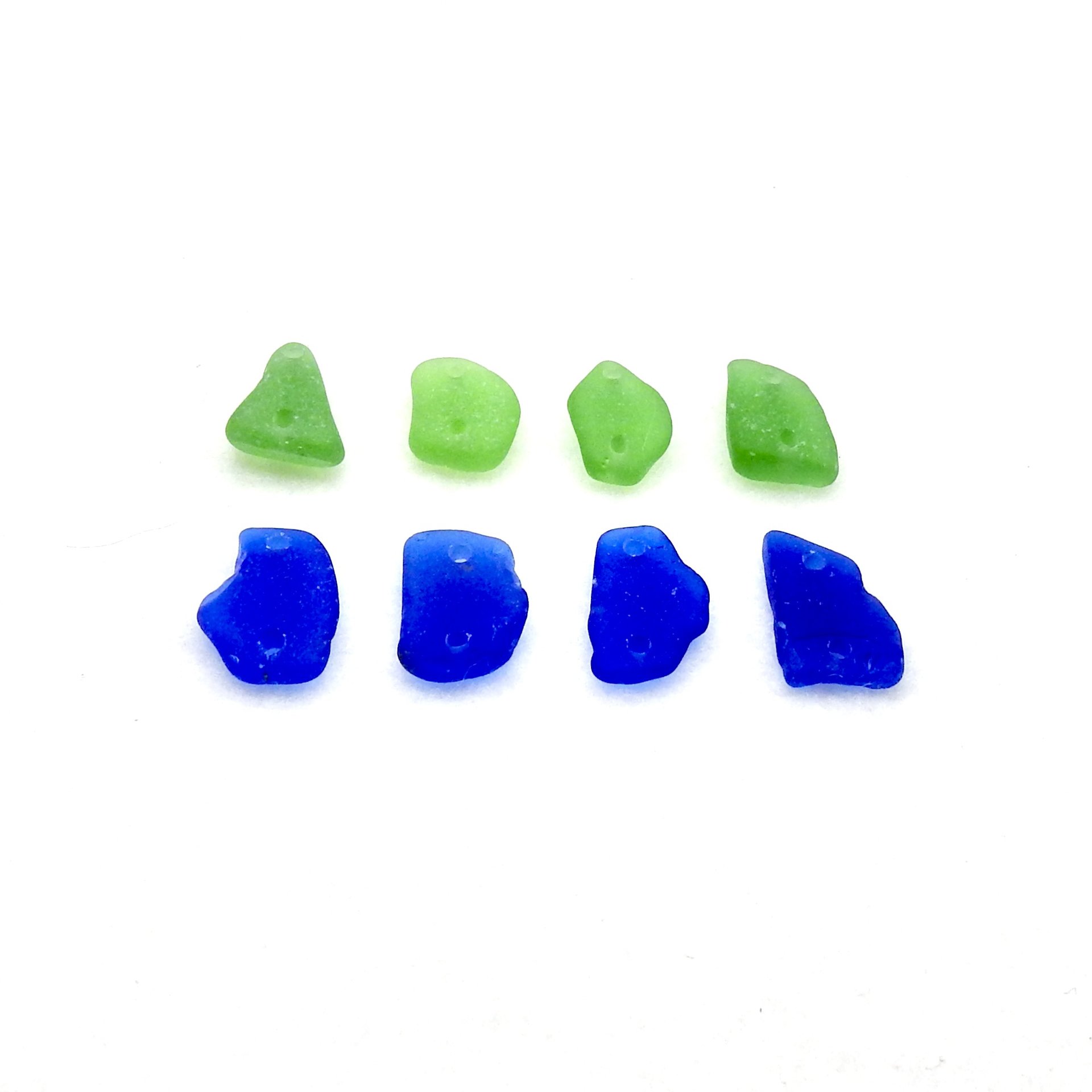 Small genuine sea glass connector beads, set of 8, in shades of green and cobalt blue with two drilled holes for jewelry making, bracelets, sun catchers or other beach themed crafts.