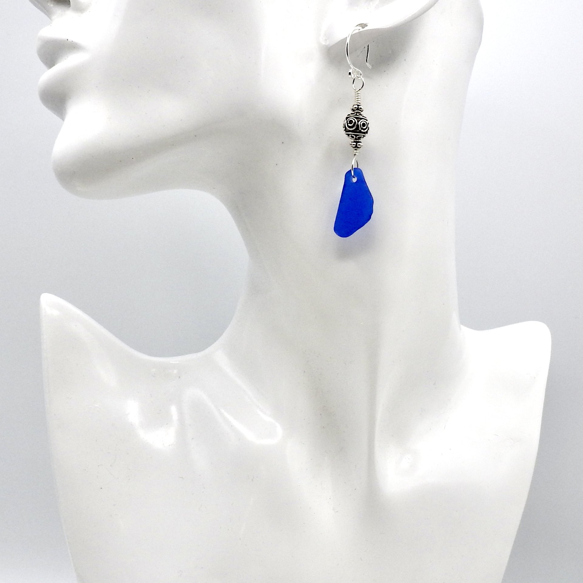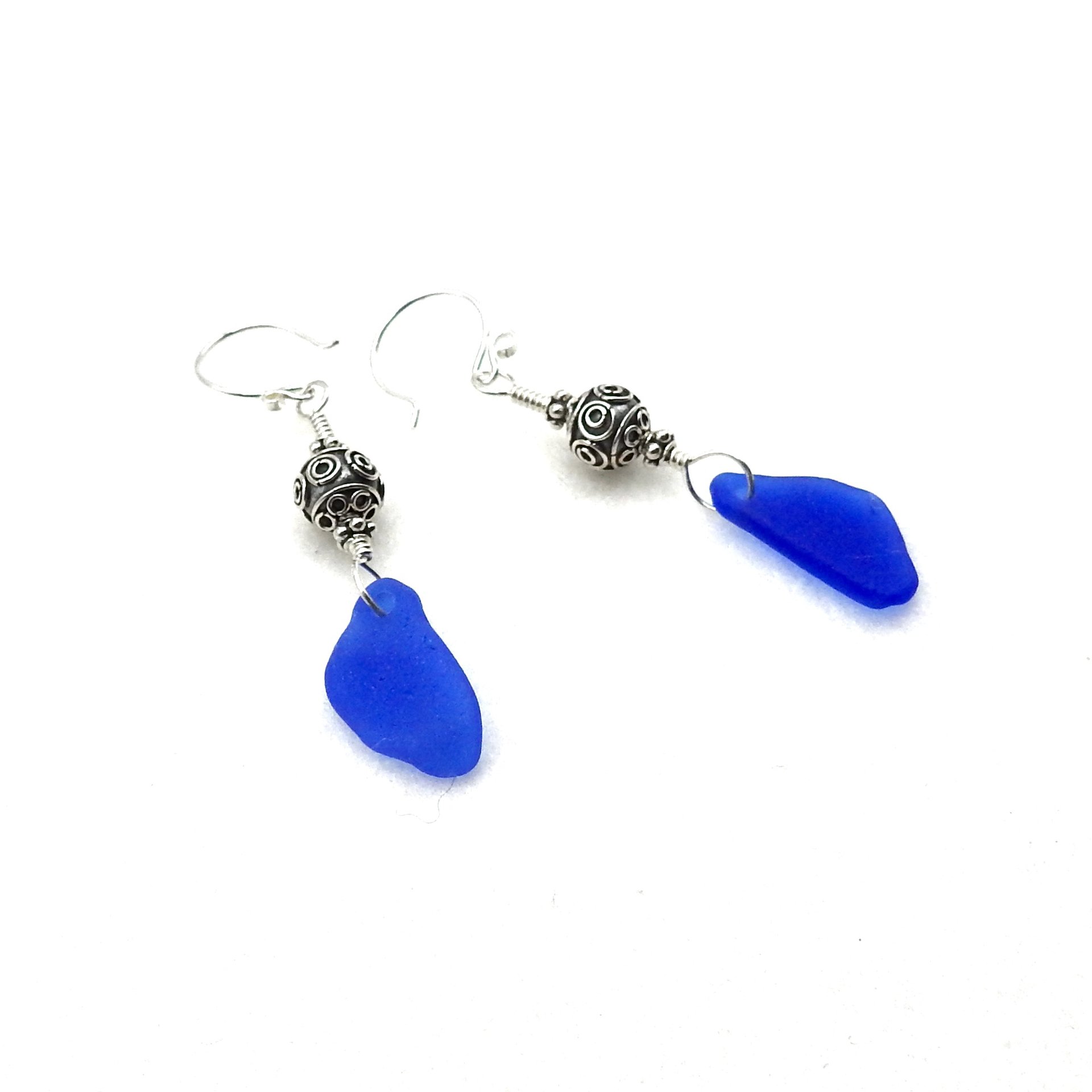 Sea glass dangle earrings, handmade with cobalt blue genuine sea glass and sterling silver Bali beads.
