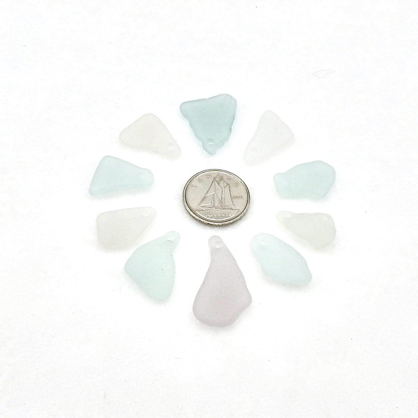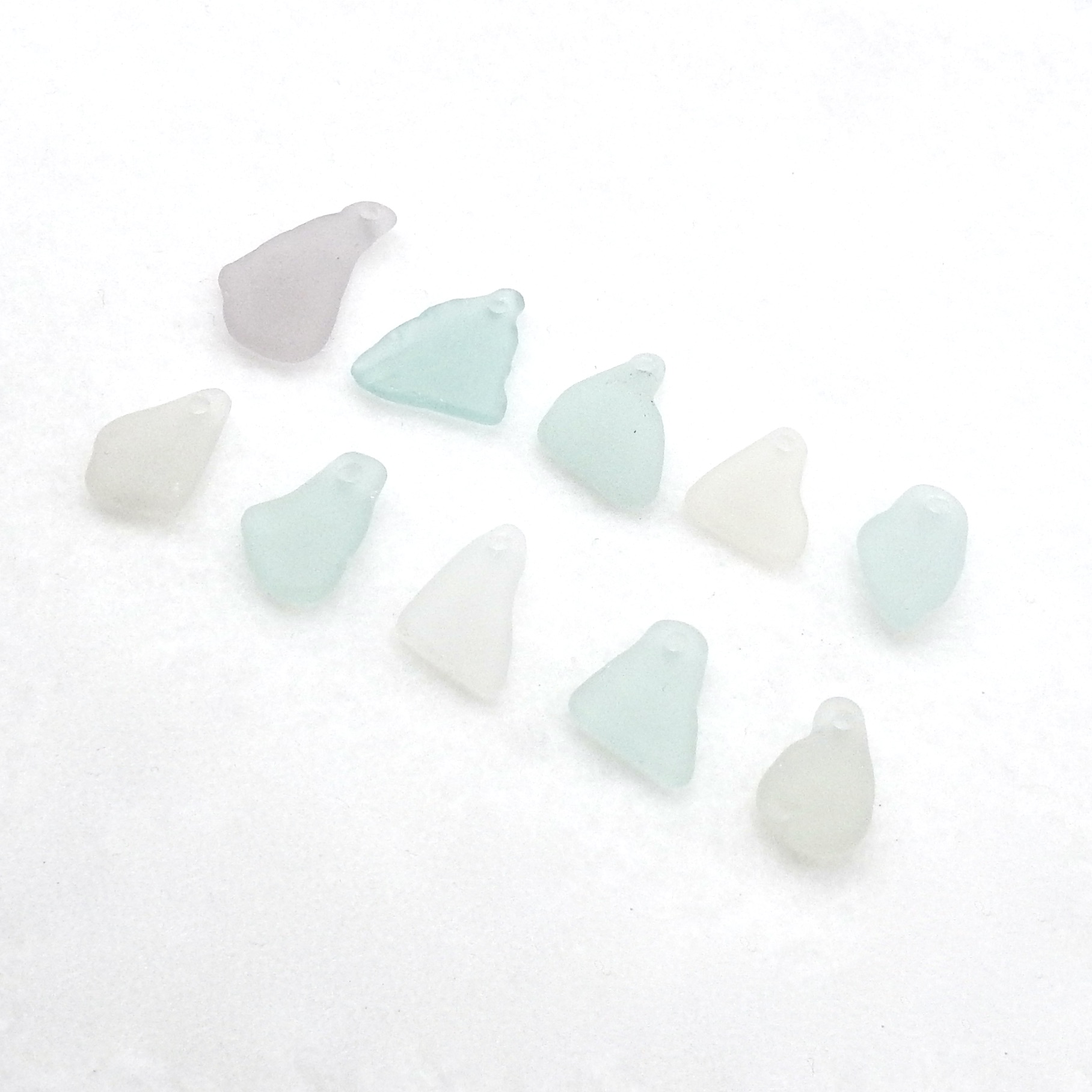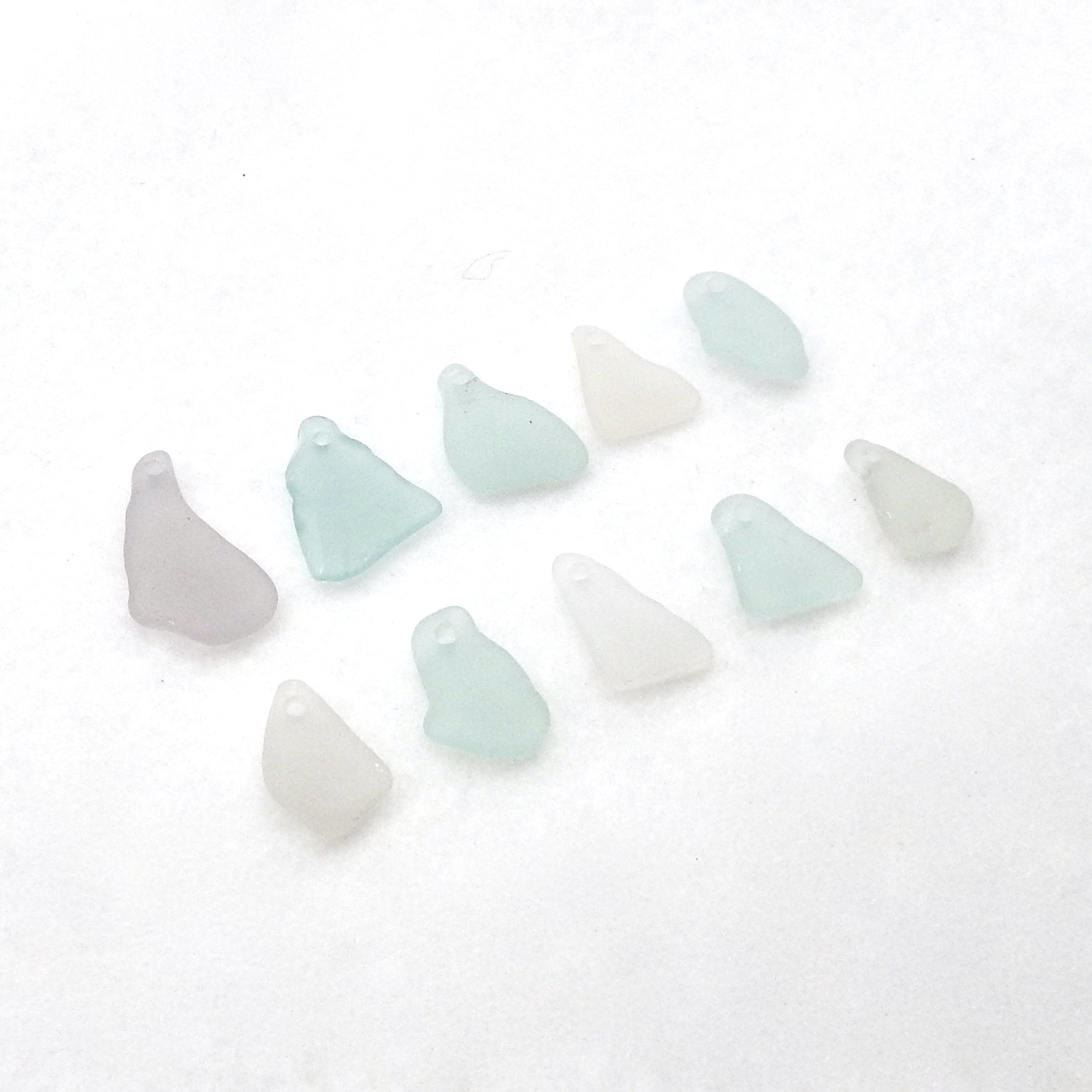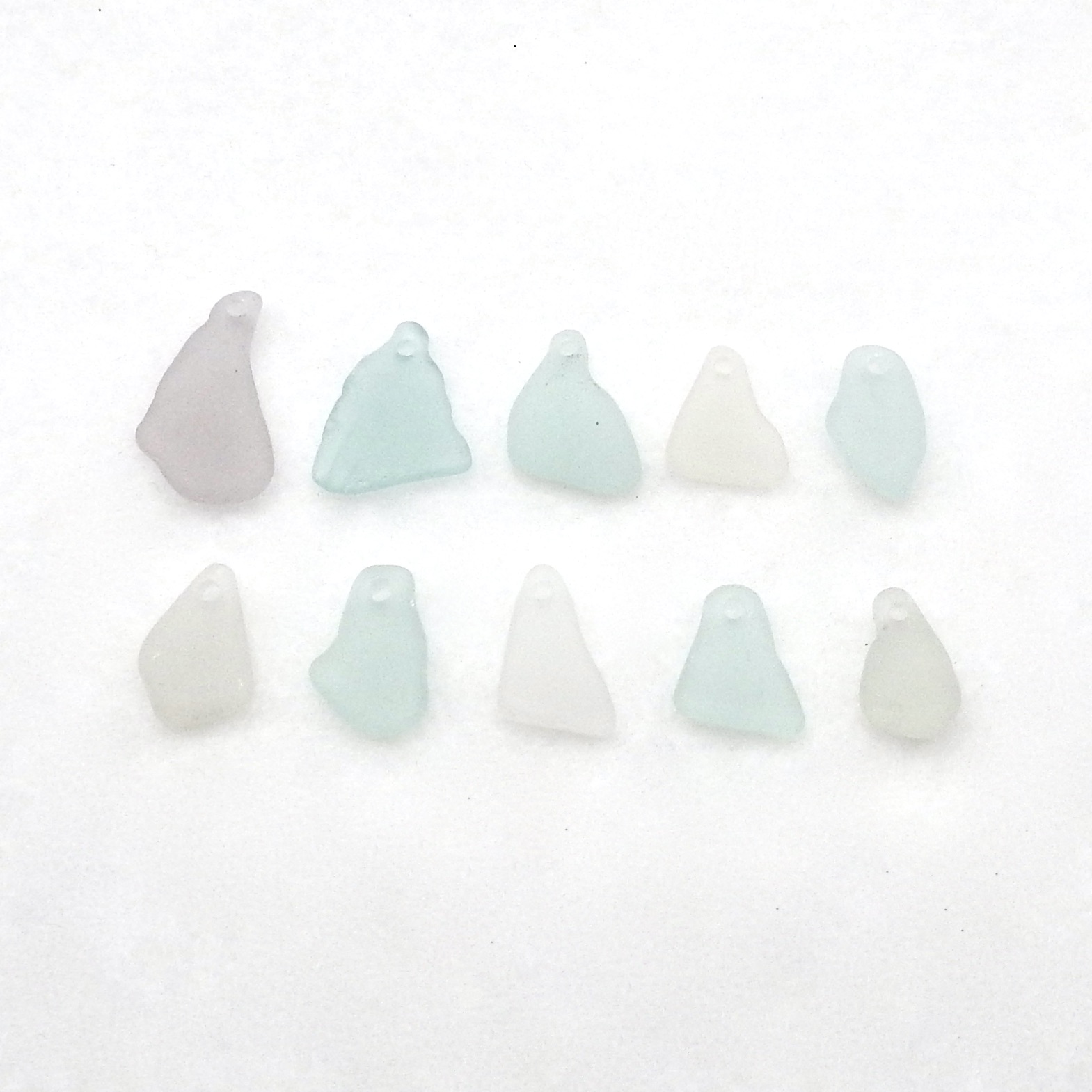 Genuine sea glass charms, set of 10, in soft pastel colours with top drilled holes for jewelry making or other beach themed crafts.