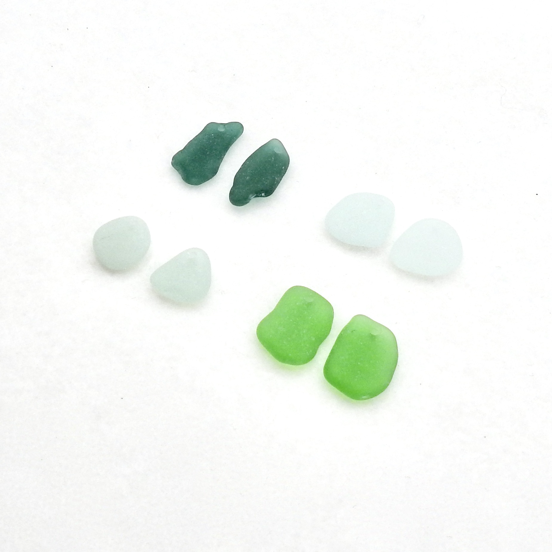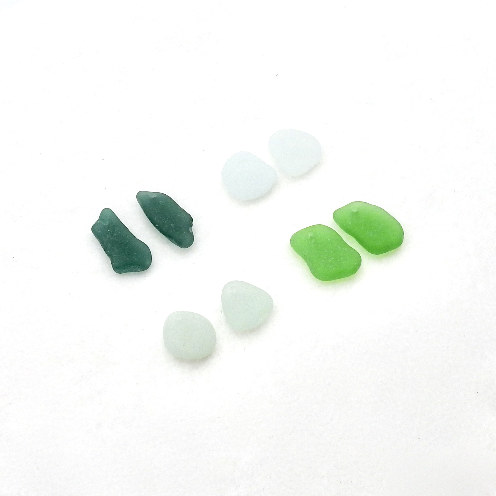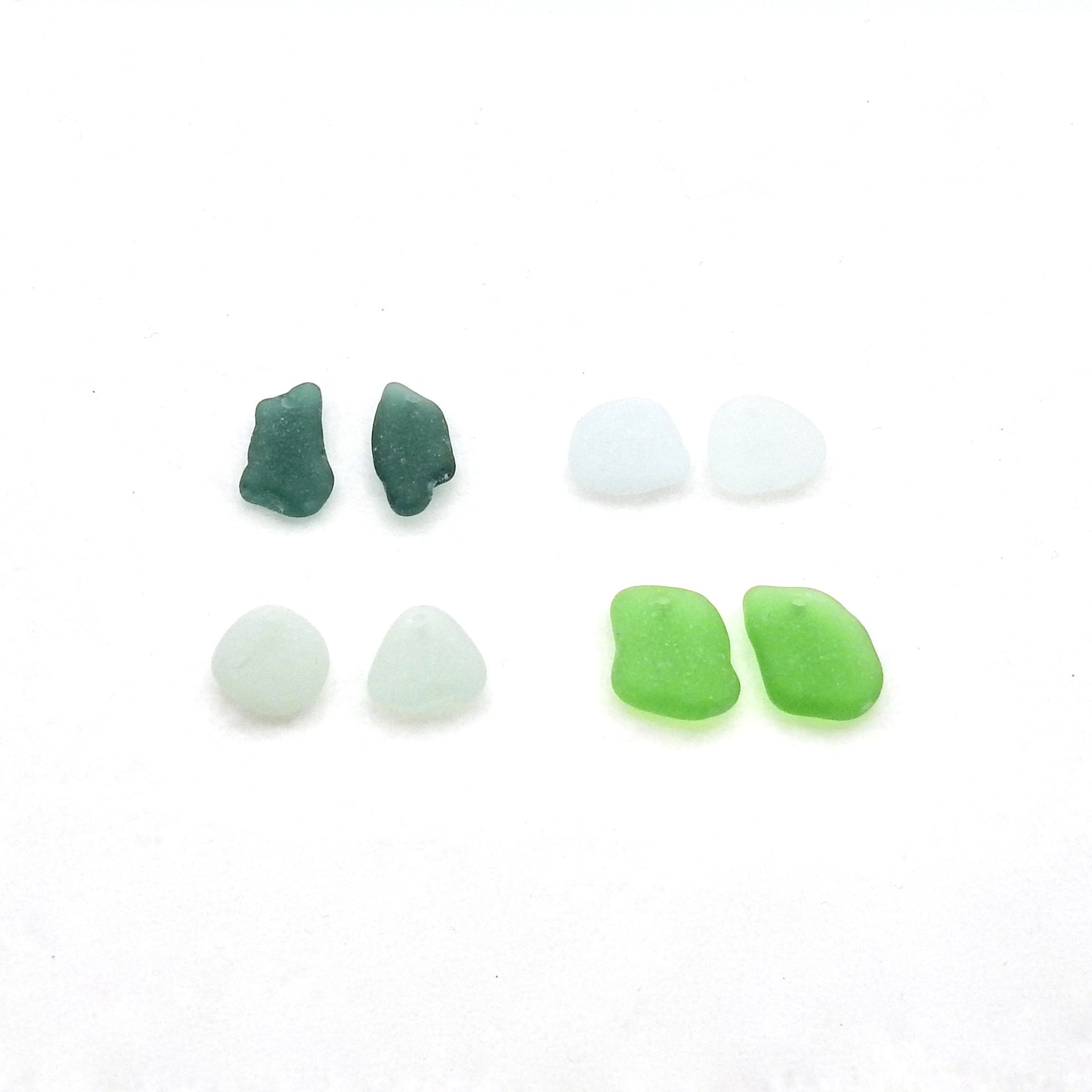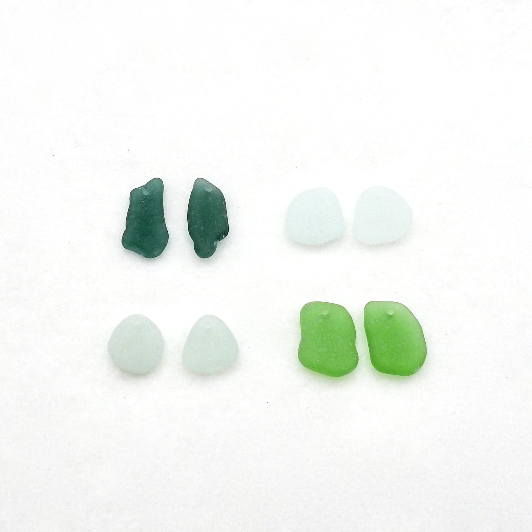 Real sea glass earring charms, 4 pair (8 pieces) in the colours of teal, white, sea foam and green with top drilled holes for jewelry making.