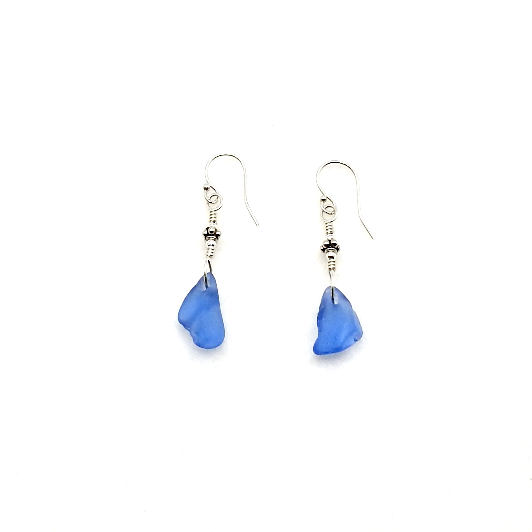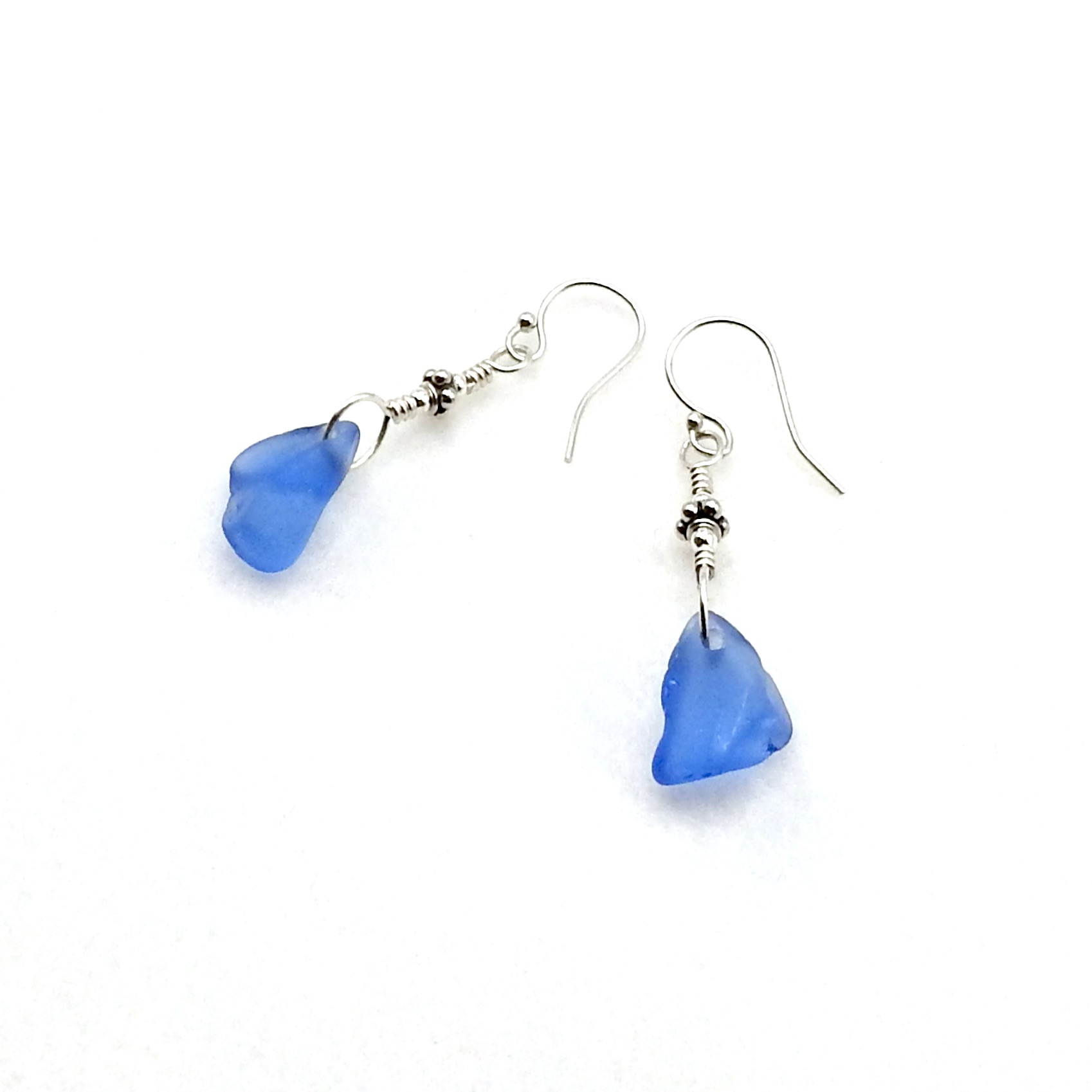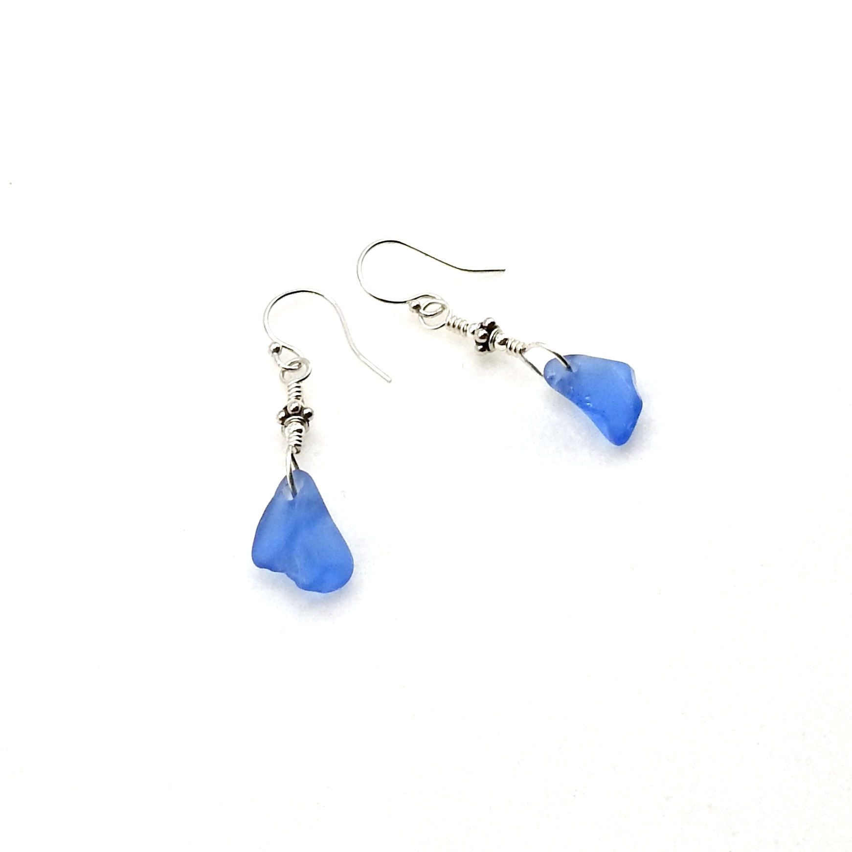 Dainty dangle drop earrings, handmade with cornflower blue genuine sea glass pieces with very tiny Bali bead accents.