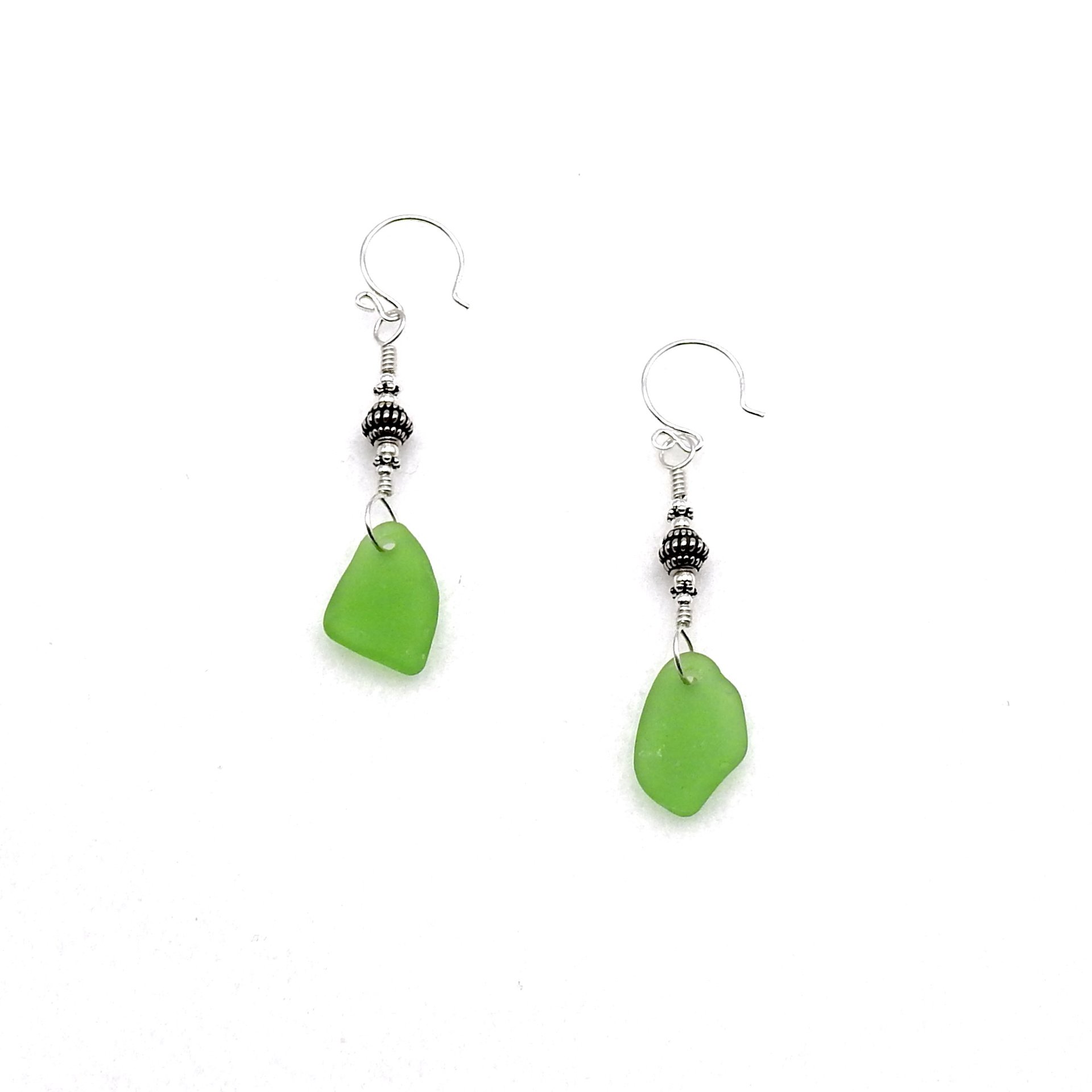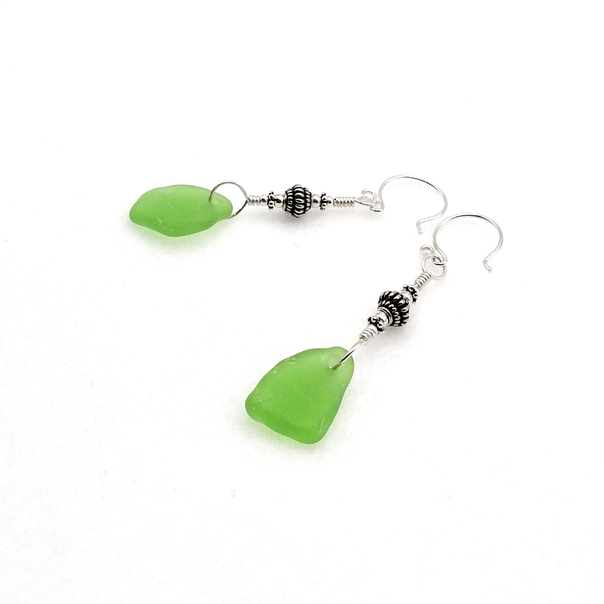 Dangle earrings, handcrafted with green genuine sea glass charms accented with sterling silver Bali beads.