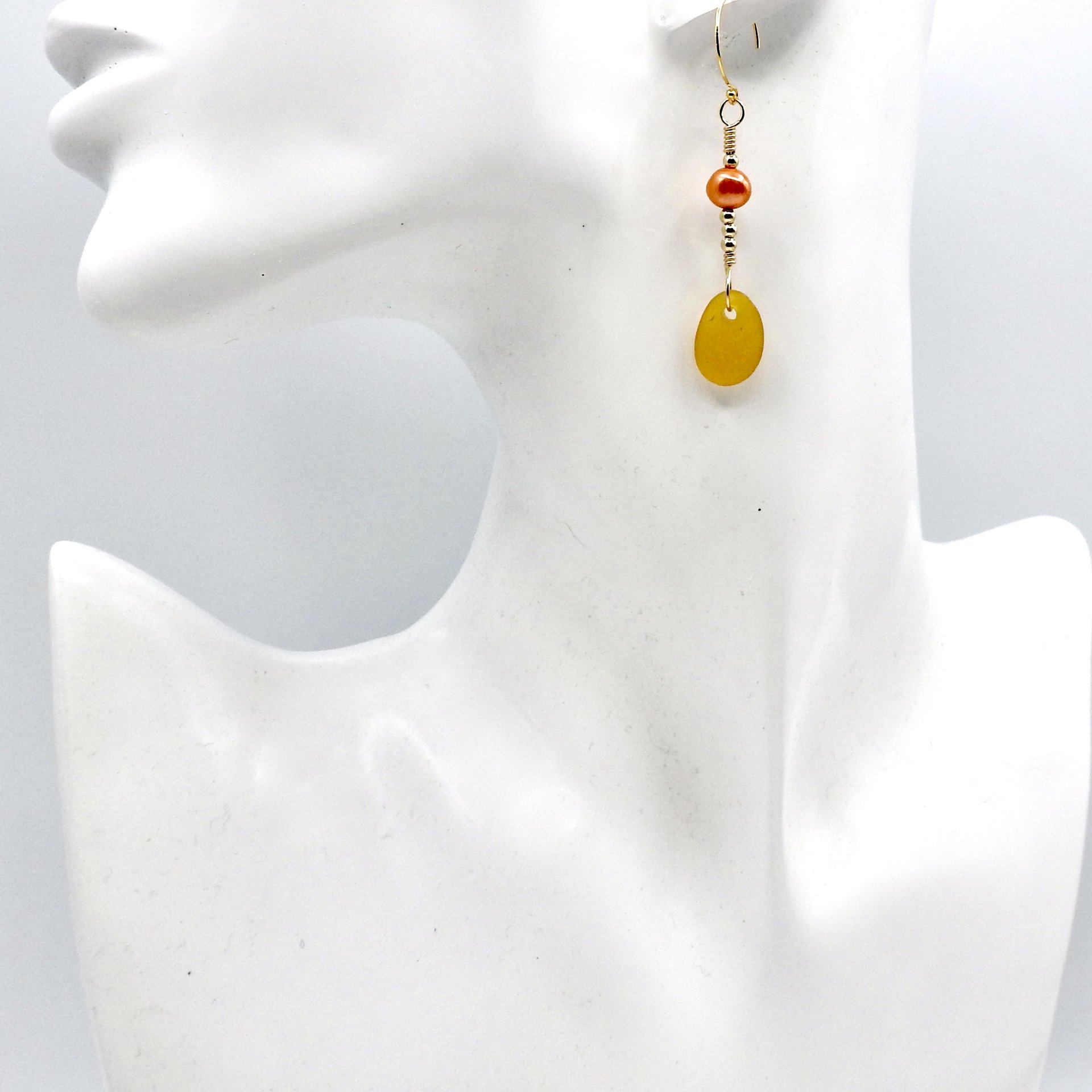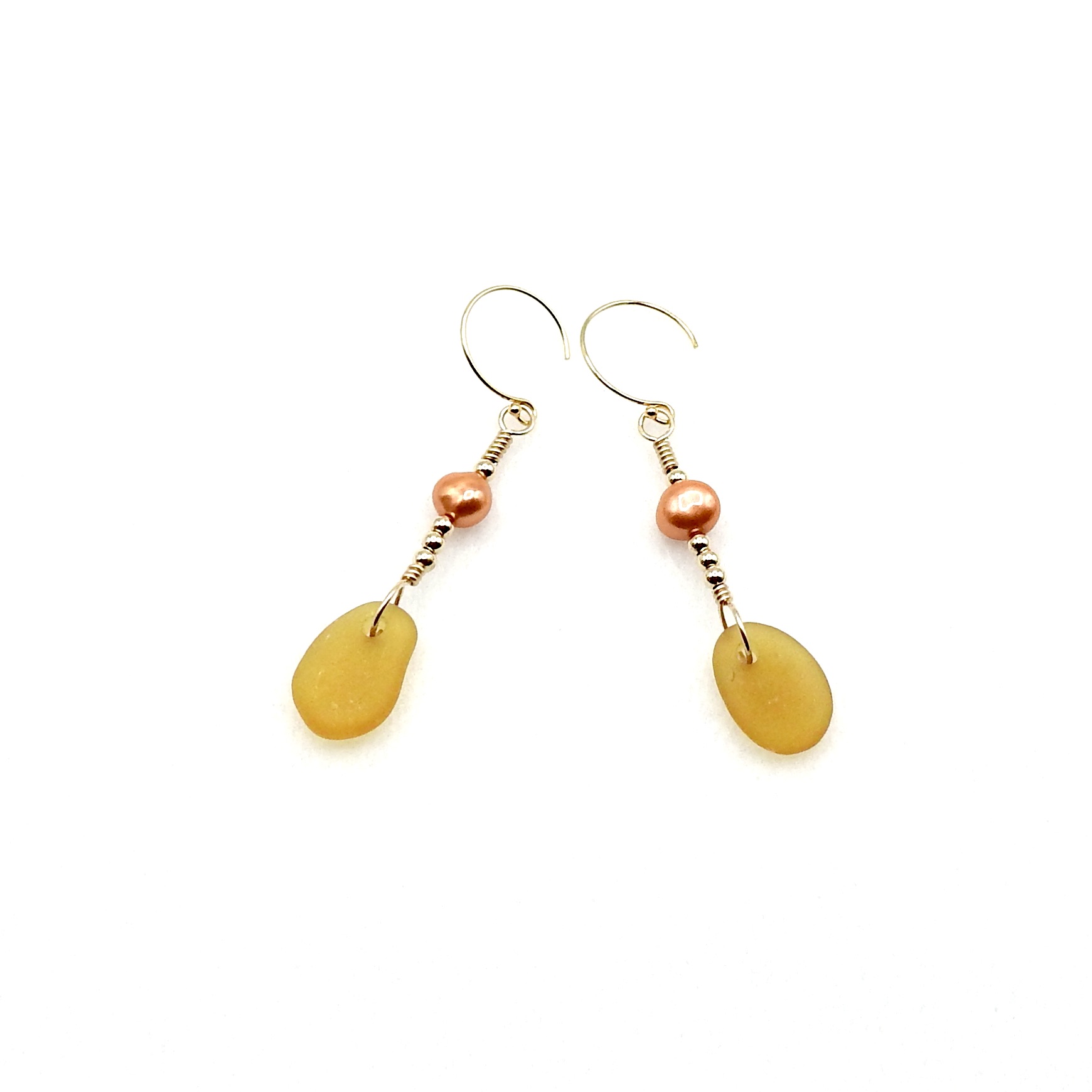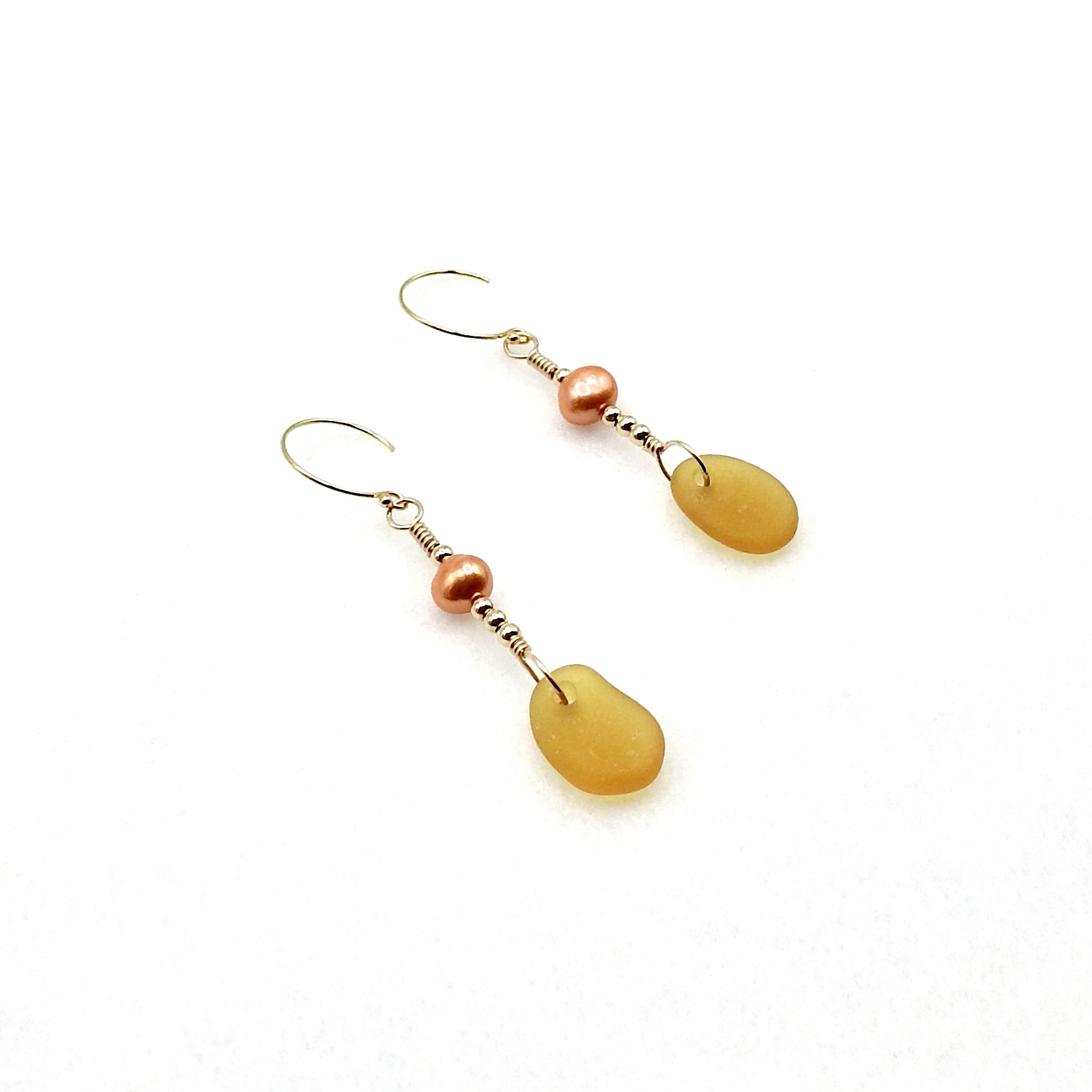 These earrings are handcrafted with honey amber coloured genuine sea glass pieces, accented with tiny orange freshwater pearls and tiny gold beads.