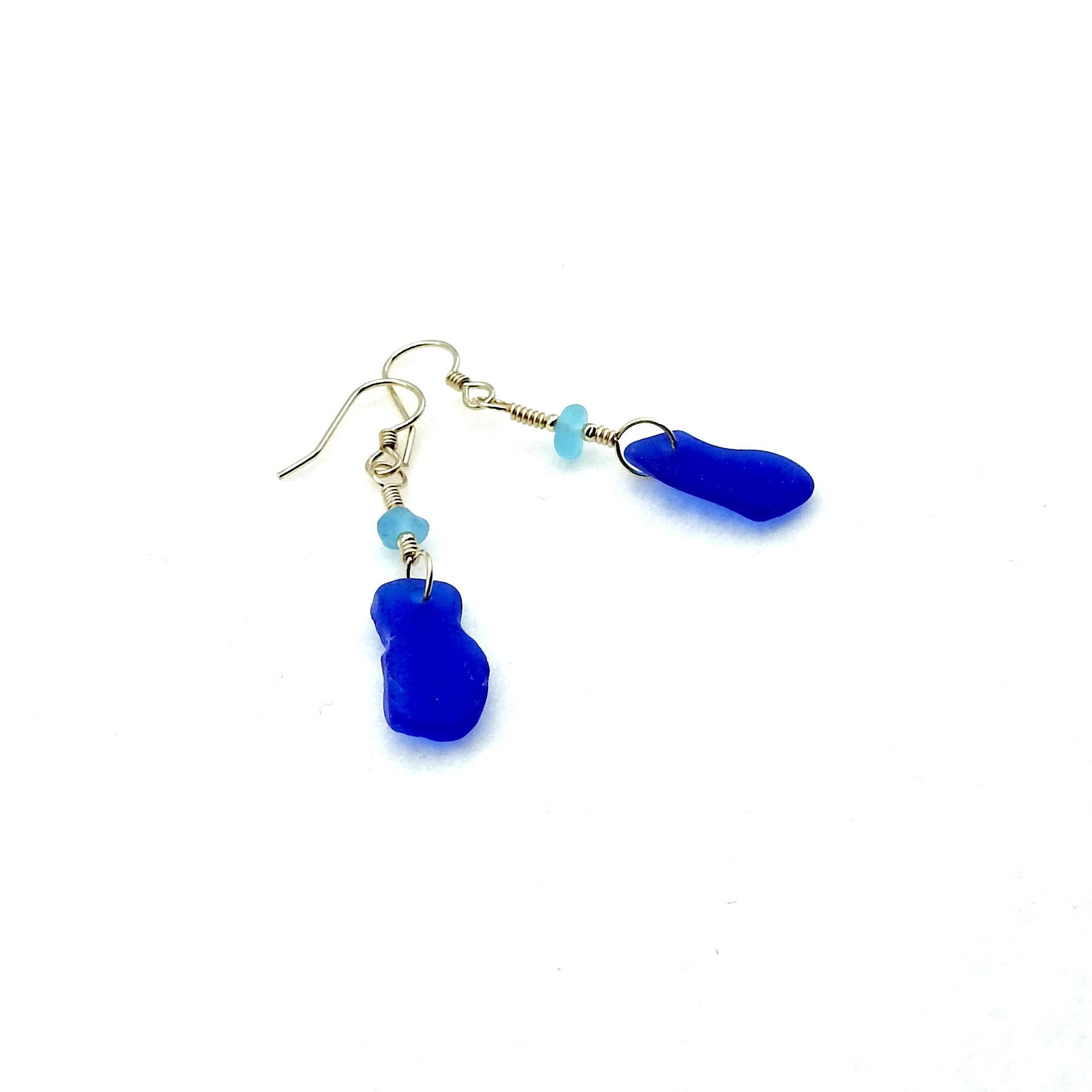 Gold dangle earrings, handmade with genuine sea glass in the colours of cobalt blue with aqua blue accents.
