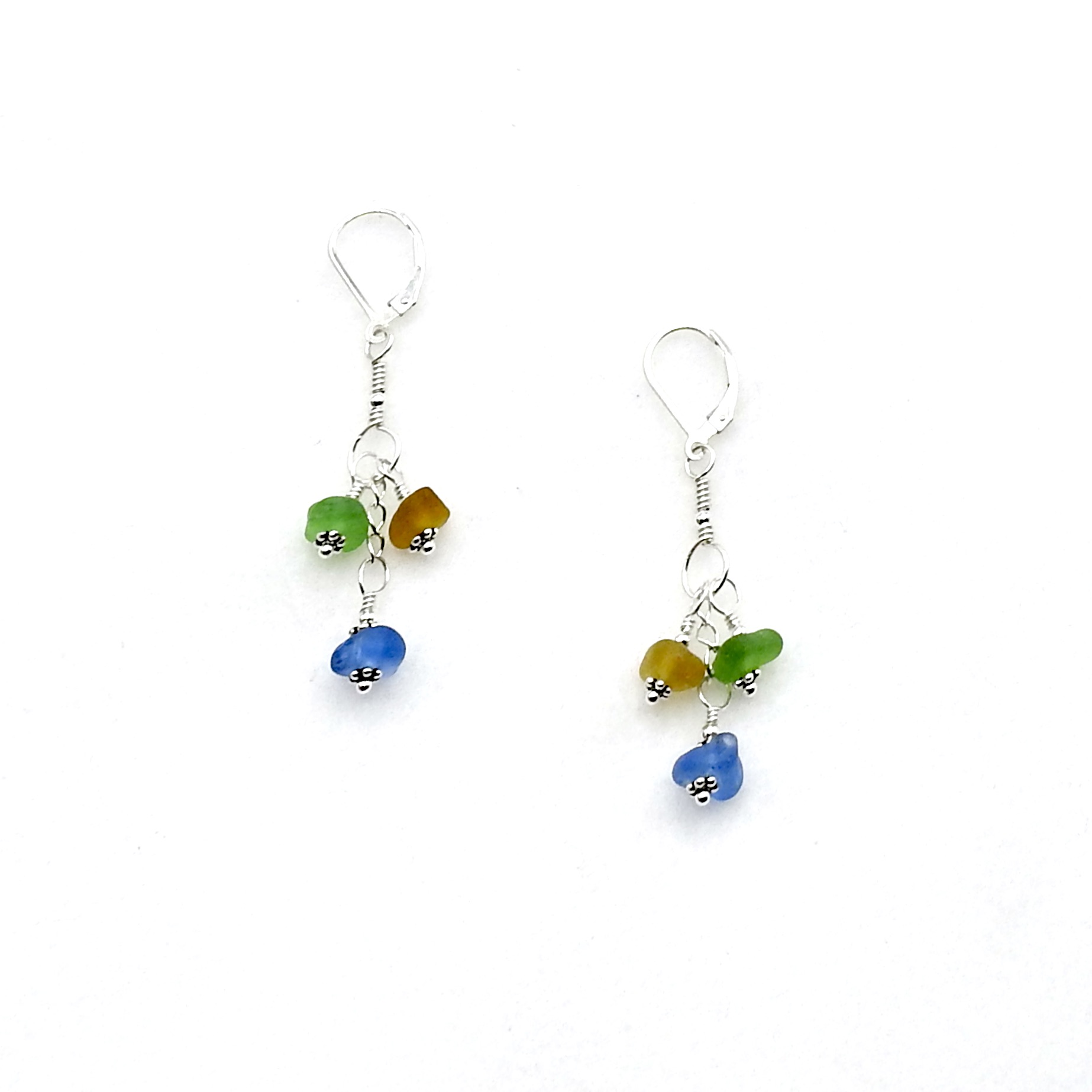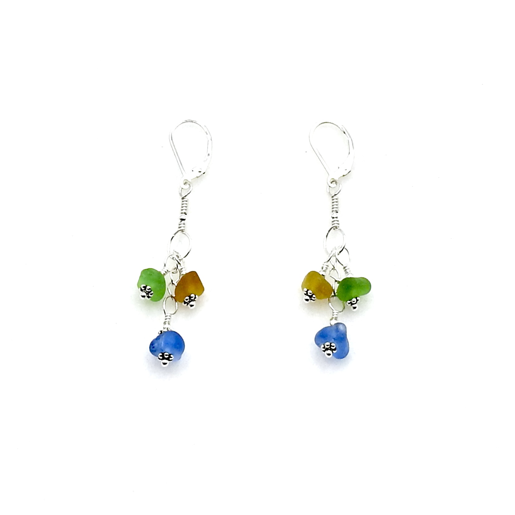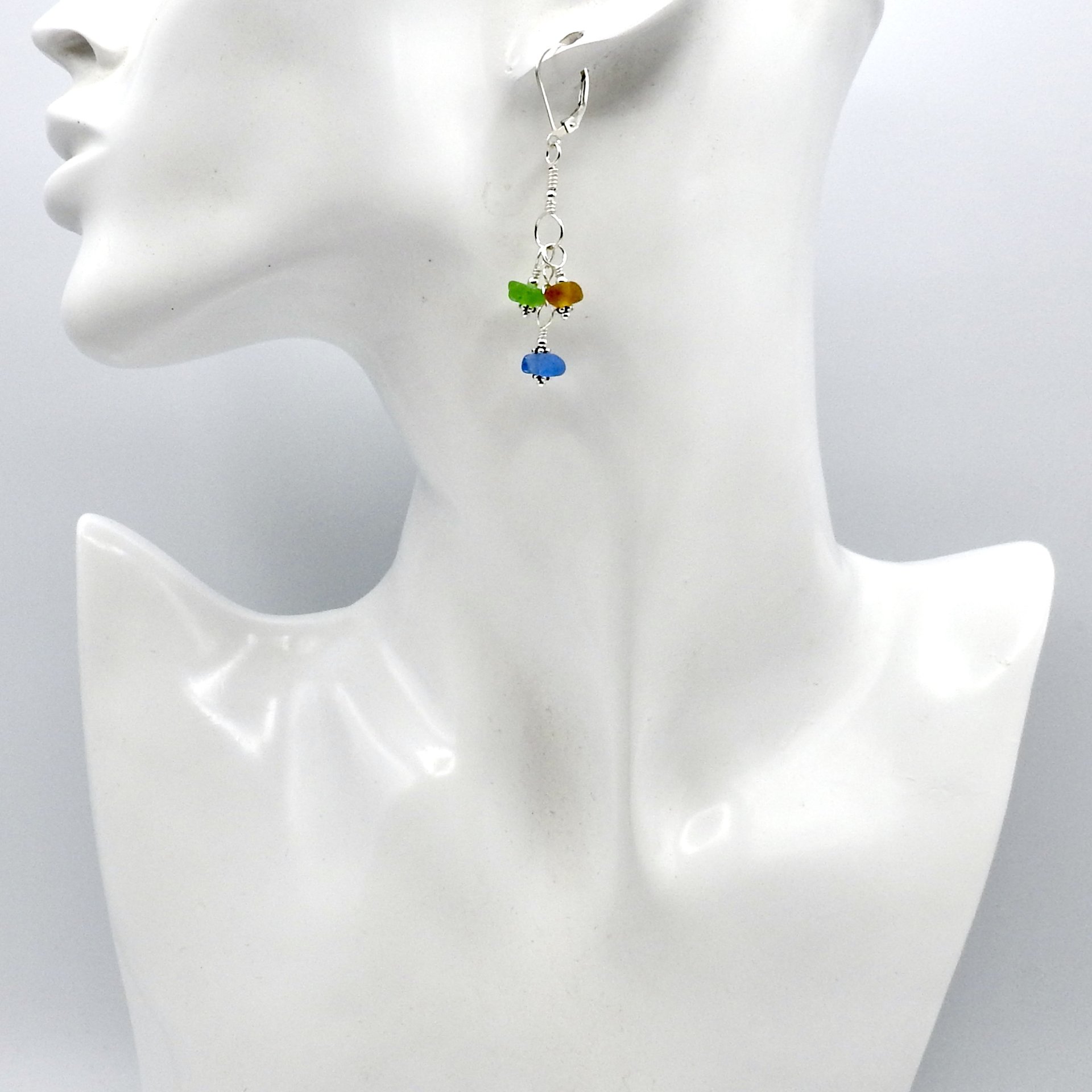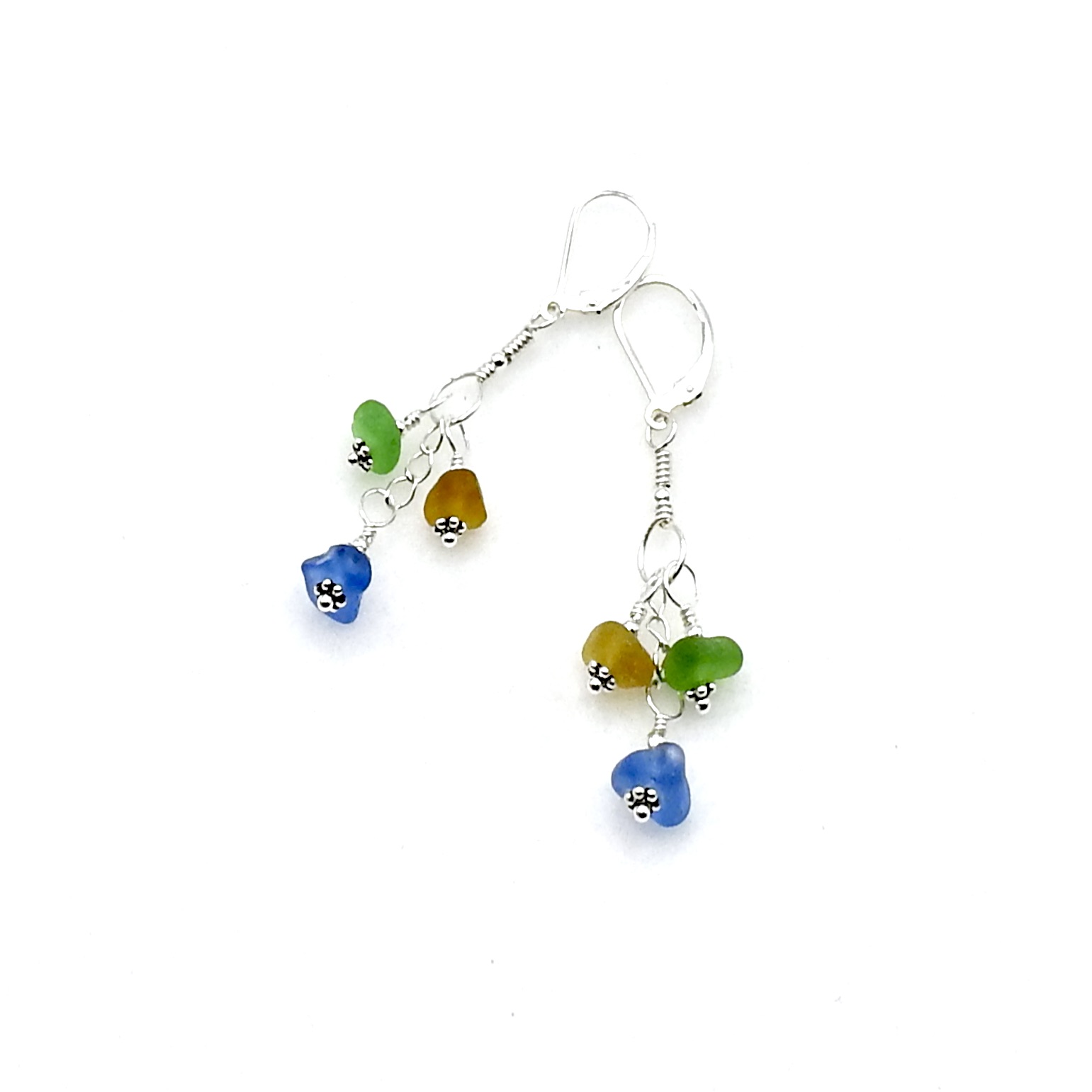 Colourful dangle drop earrings, handmade with genuine sea glass in shades of cornflower blue, light brown and green with pierced lever back ear wires.