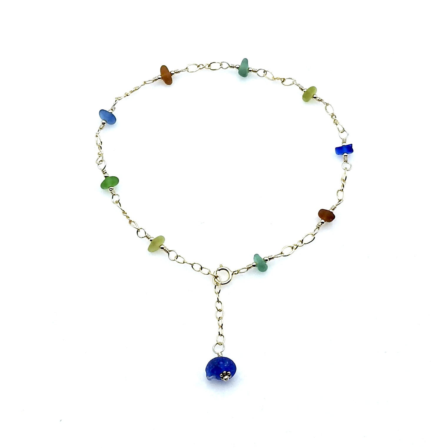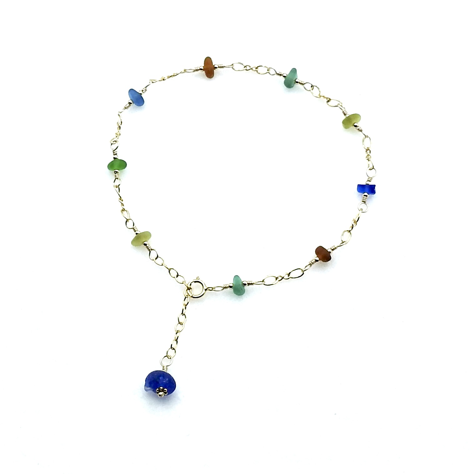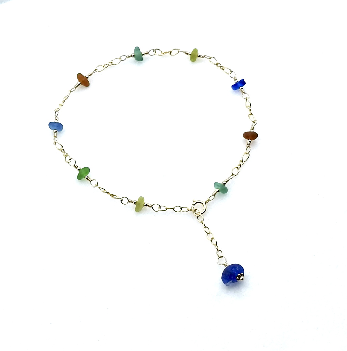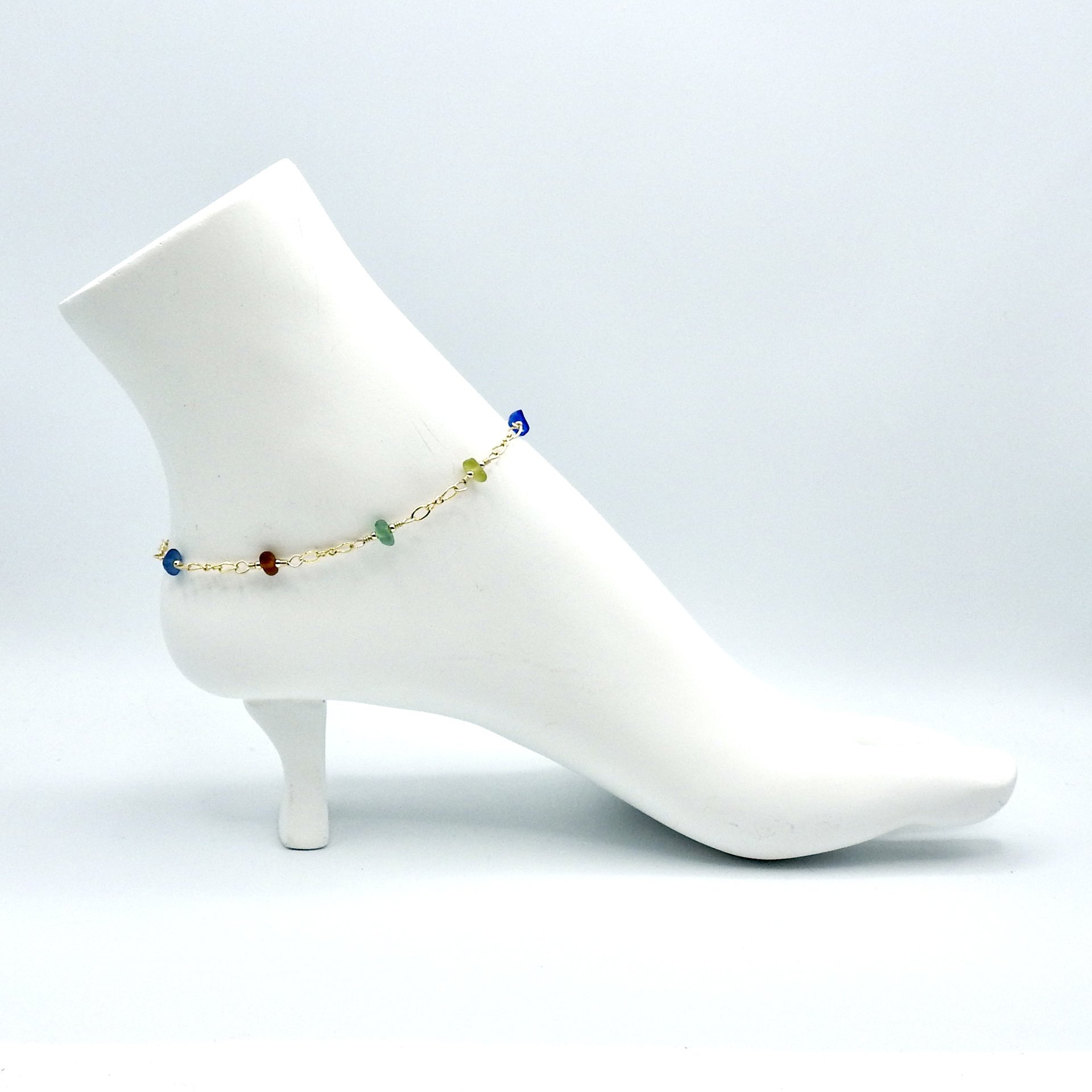 An adjustable anklet, handmade with tiny genuine sea glass pieces in multi colours.