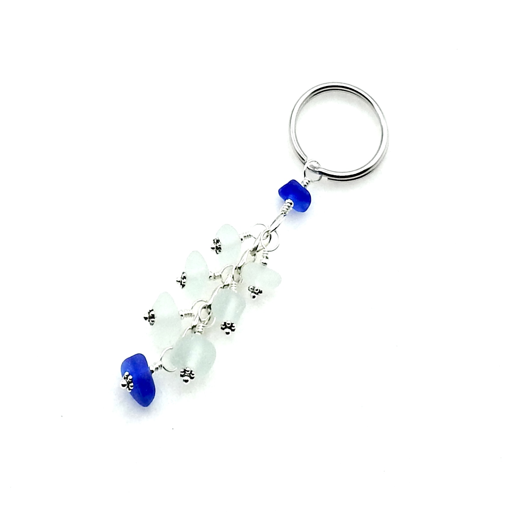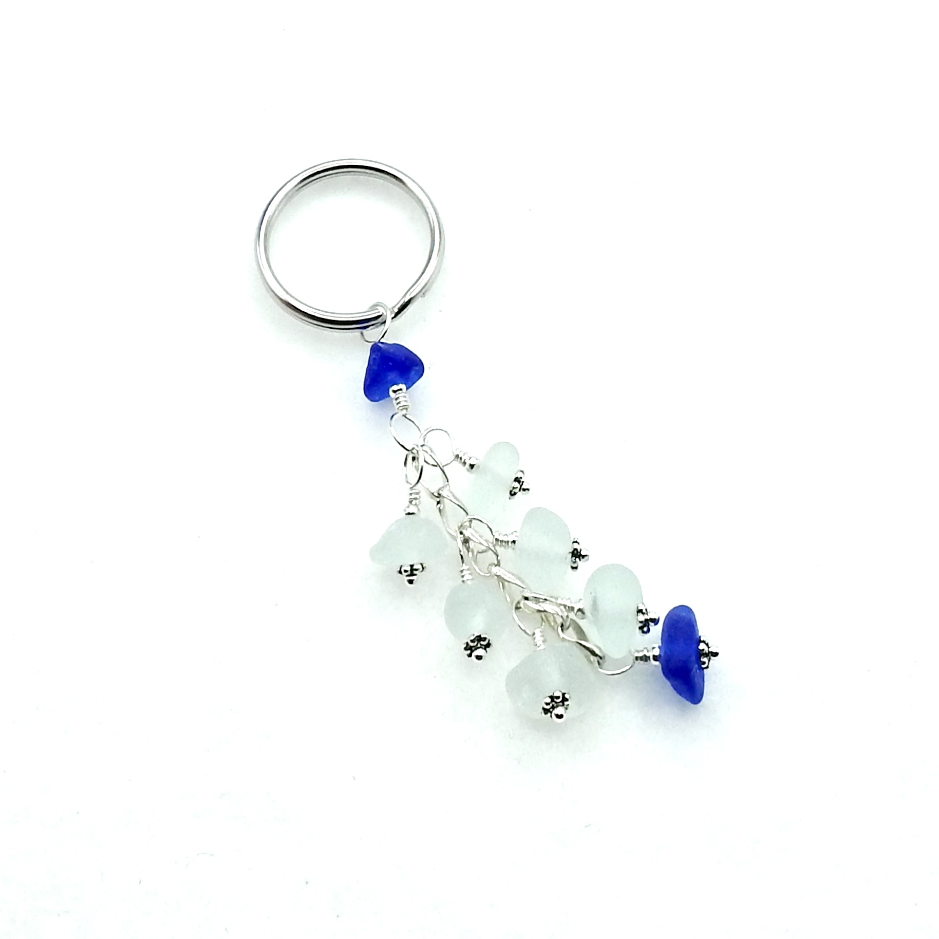 A dangly keychain, handmade with genuine sea glass pieces in shades of white with a tint of sea foam and cobalt blue accents.
