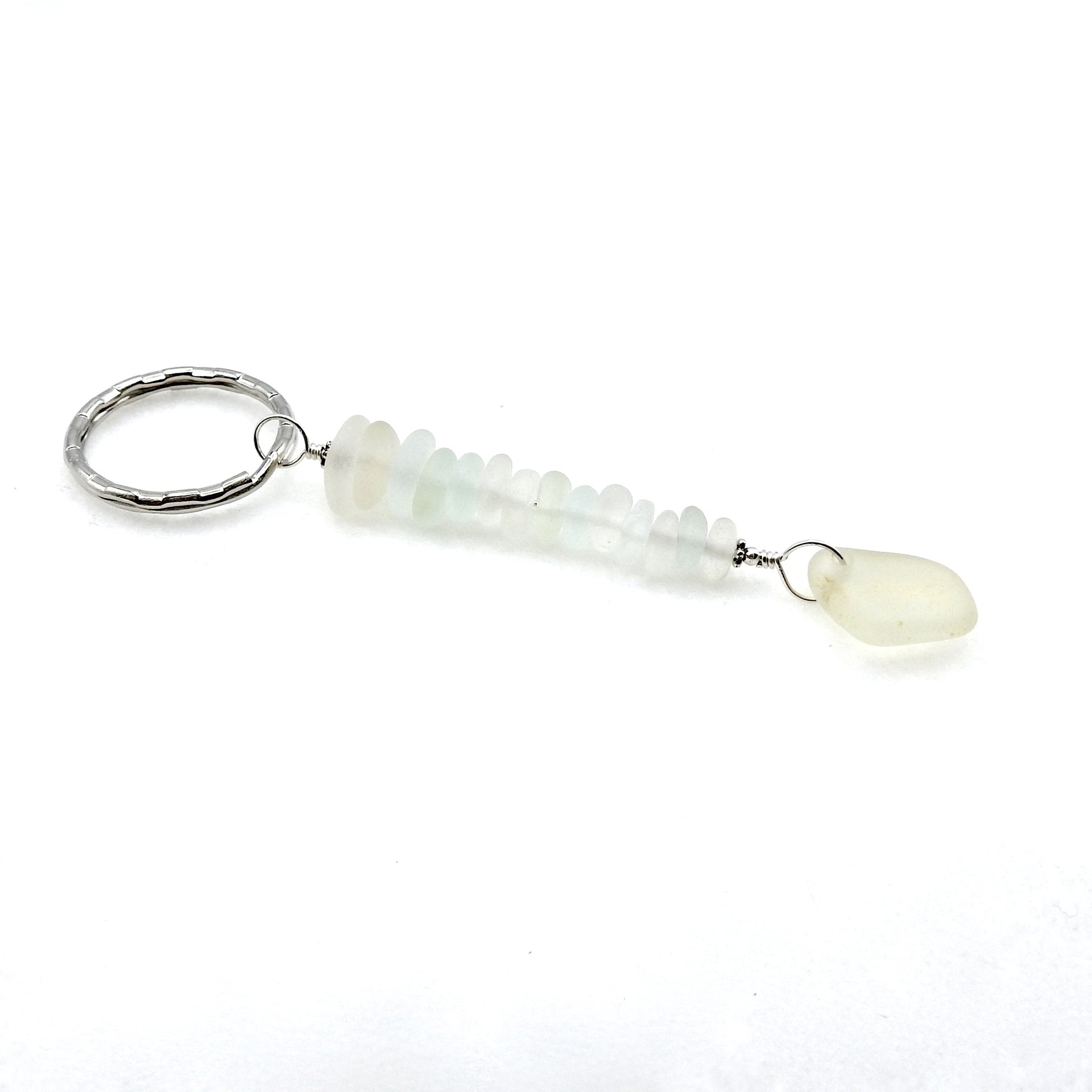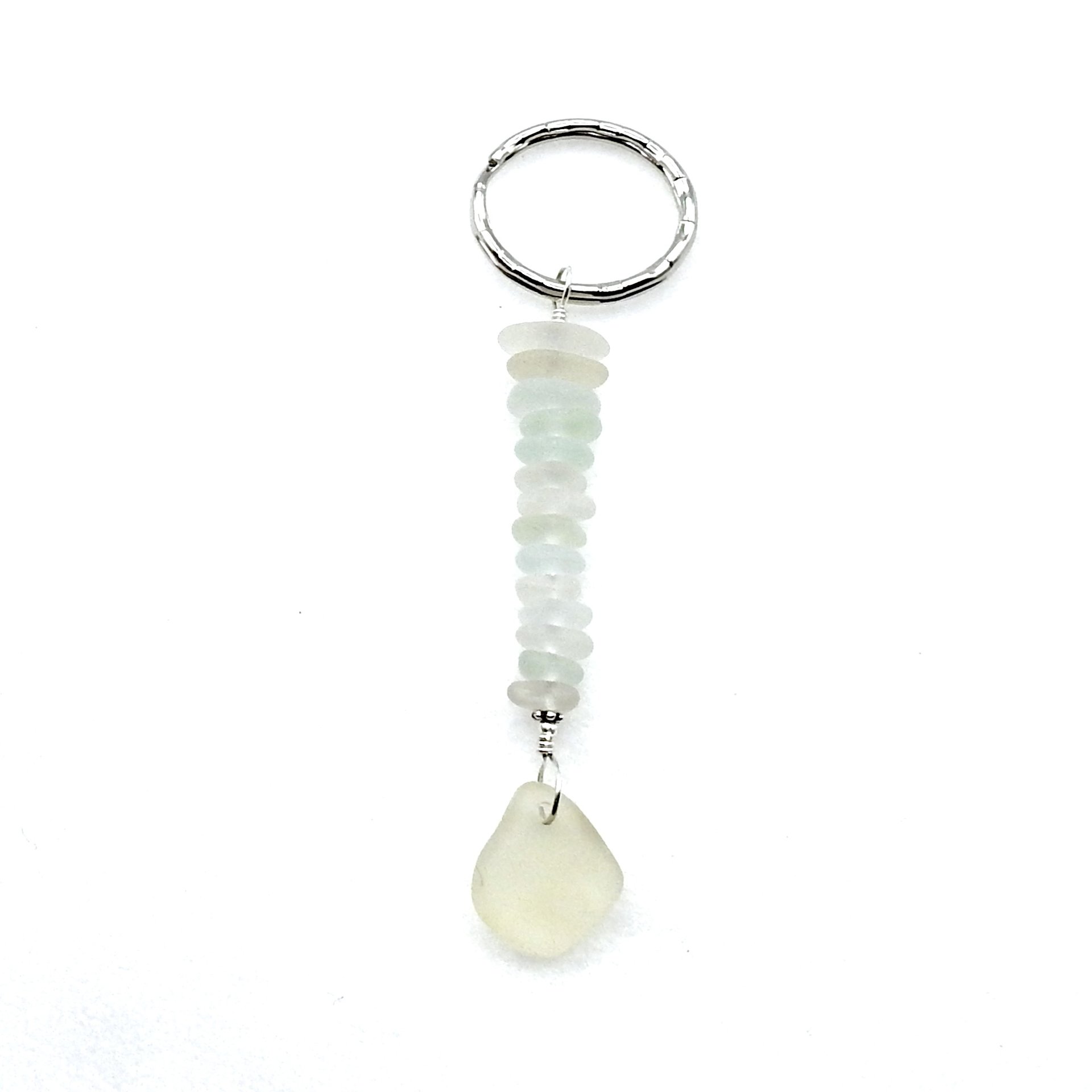 A soft pastel keychain, handmade in Canada with genuine sea glass in a graduated design with a pale yellow charm dangle and a hammered look keyring.