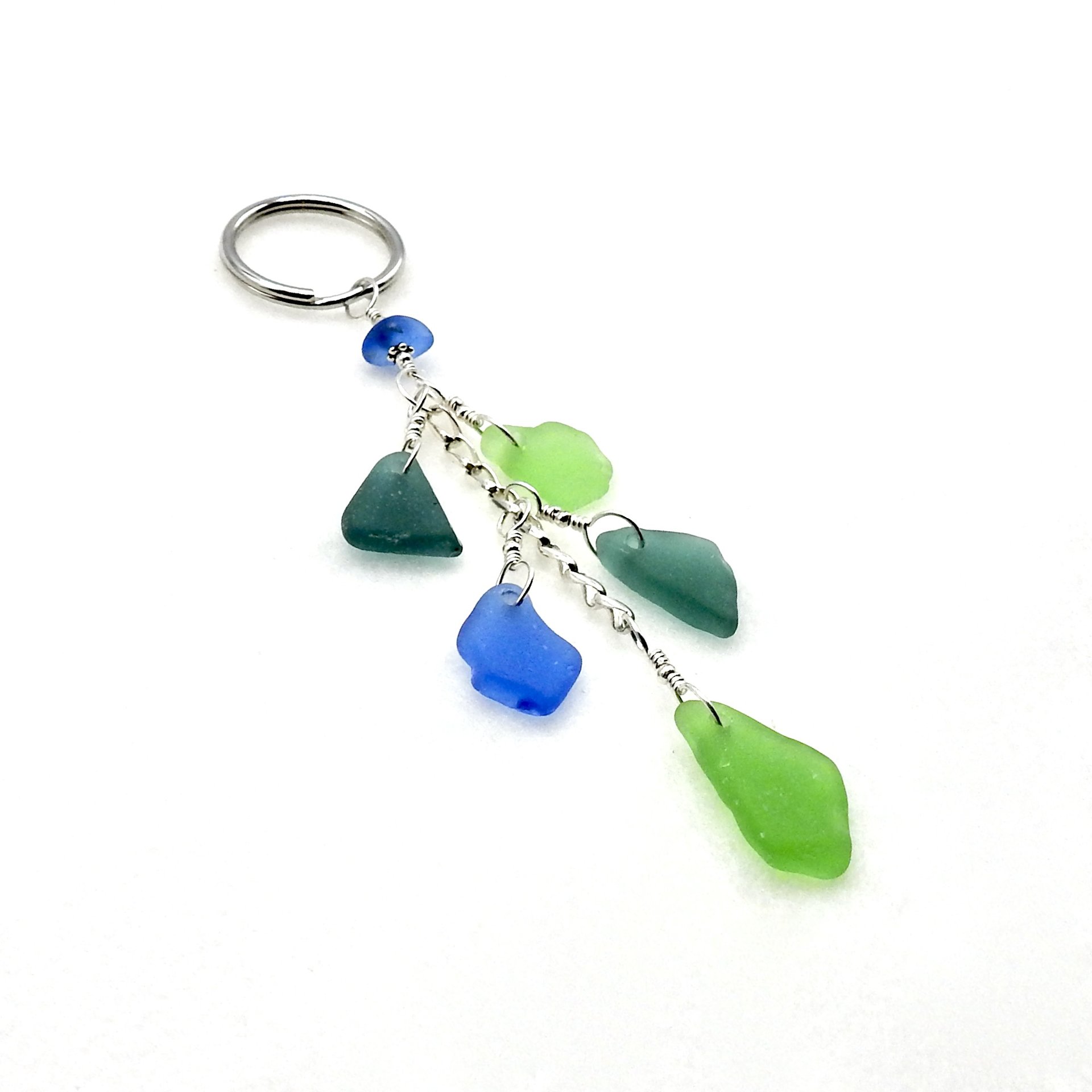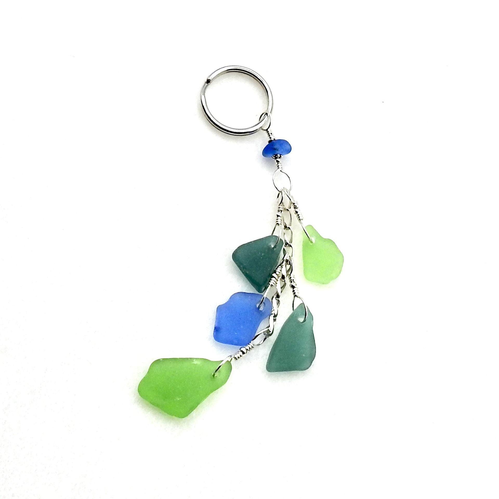A long dangly beach themed keychain, handcrafted with naturally surf tumbled genuine sea glass in shades of teal, green and cornflower blue.