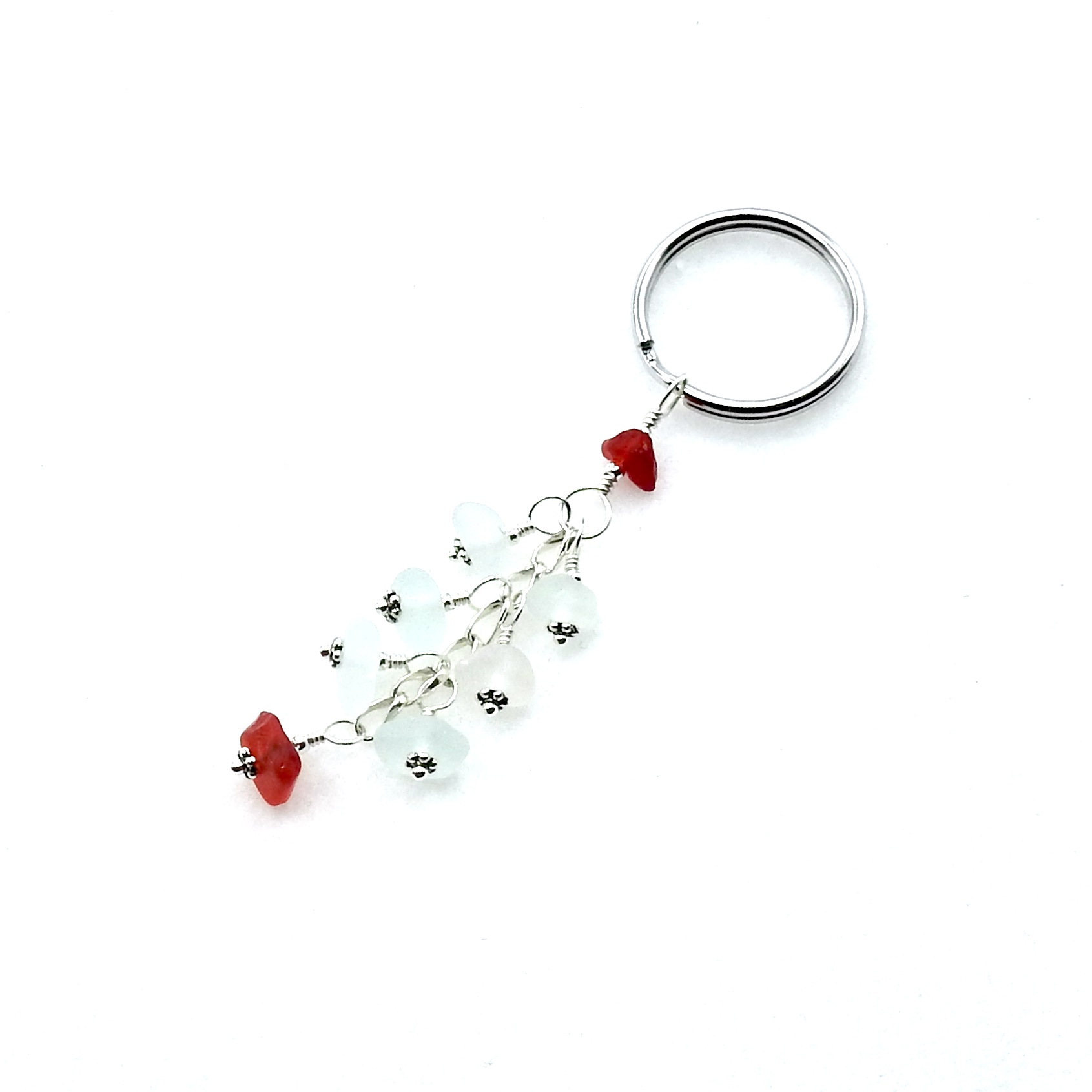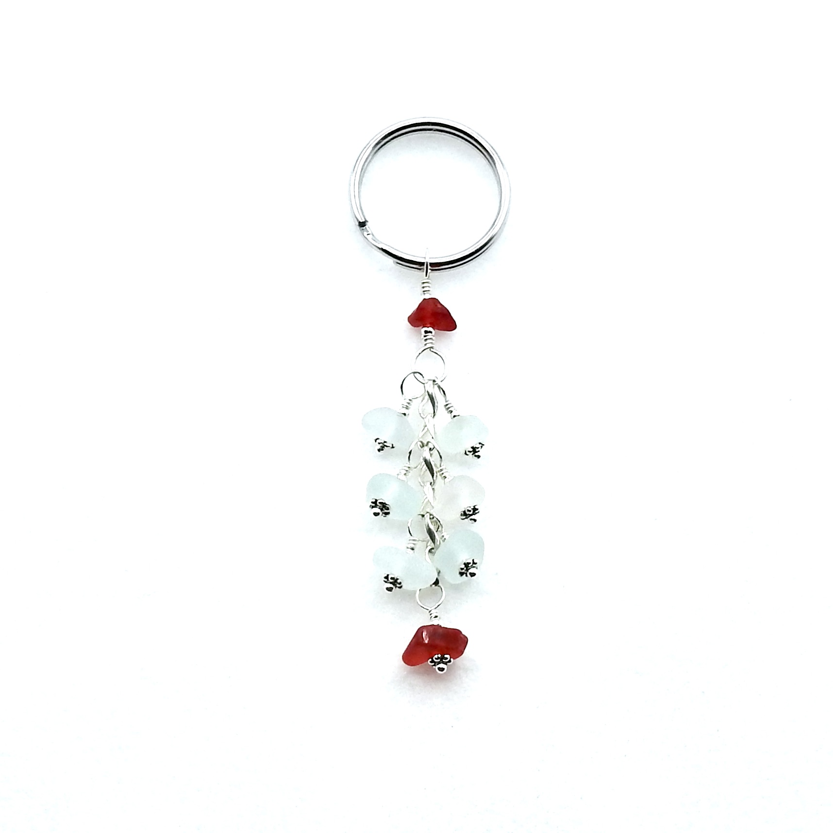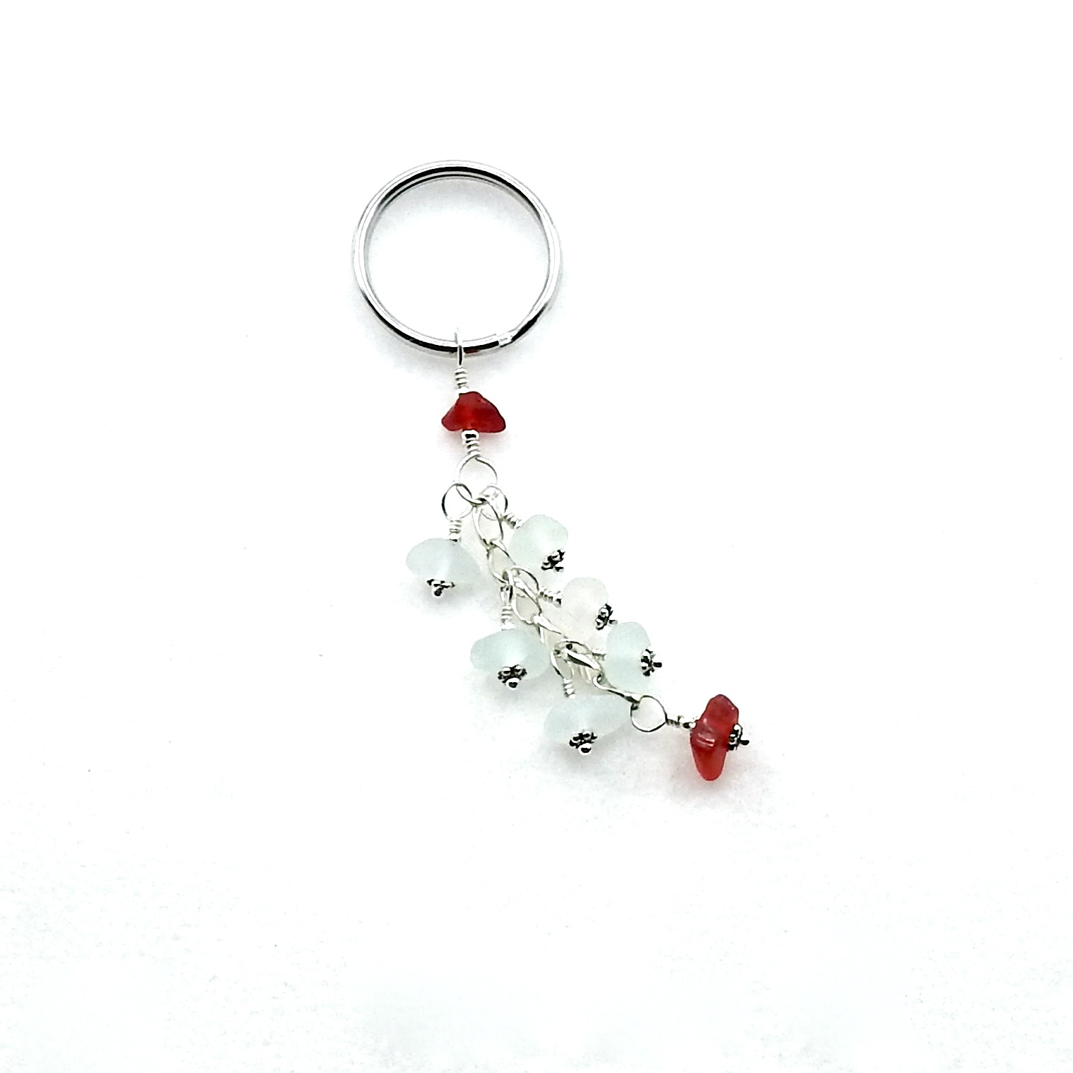 A dangly keychain, handmade with genuine sea glass pieces in shades of white with deep red accents.