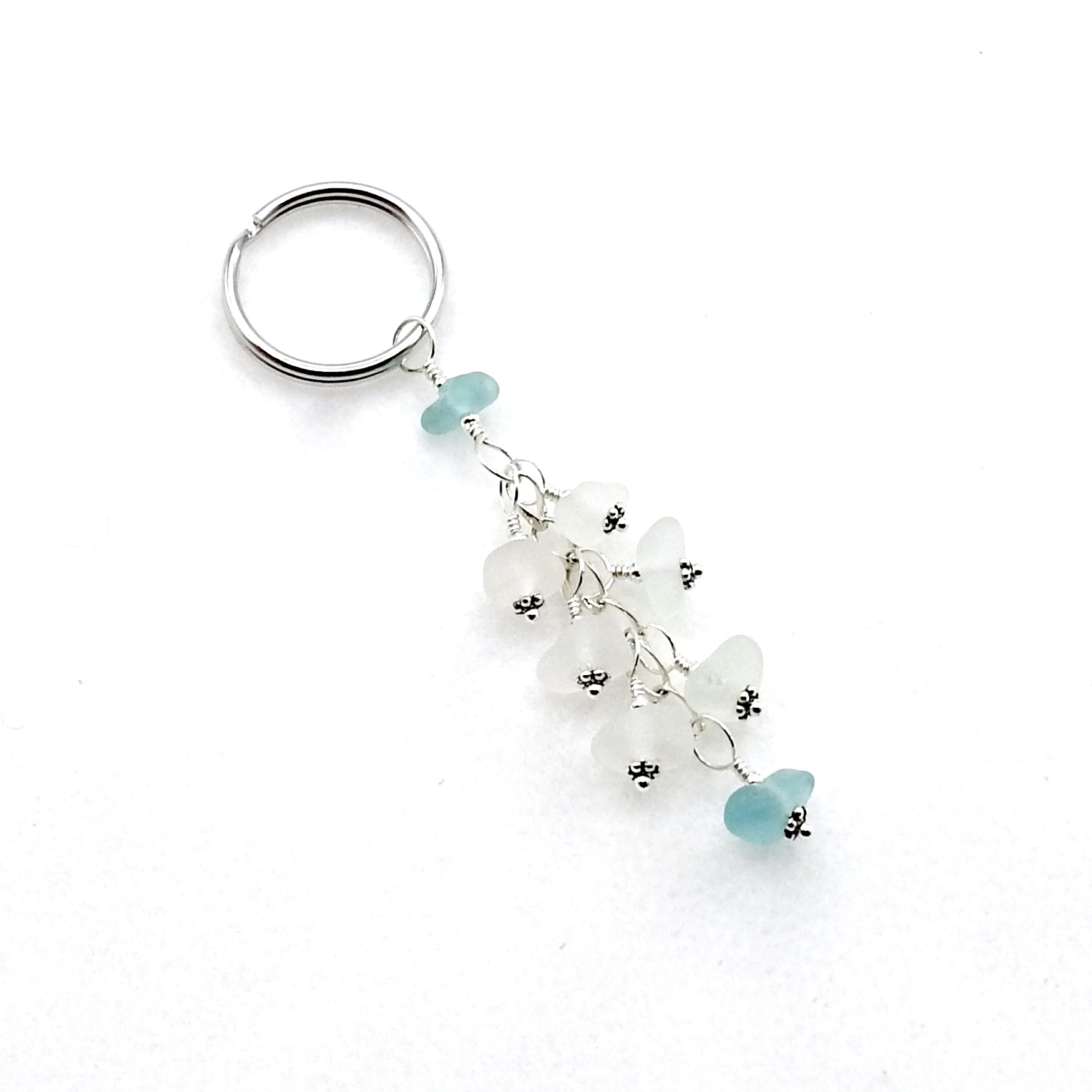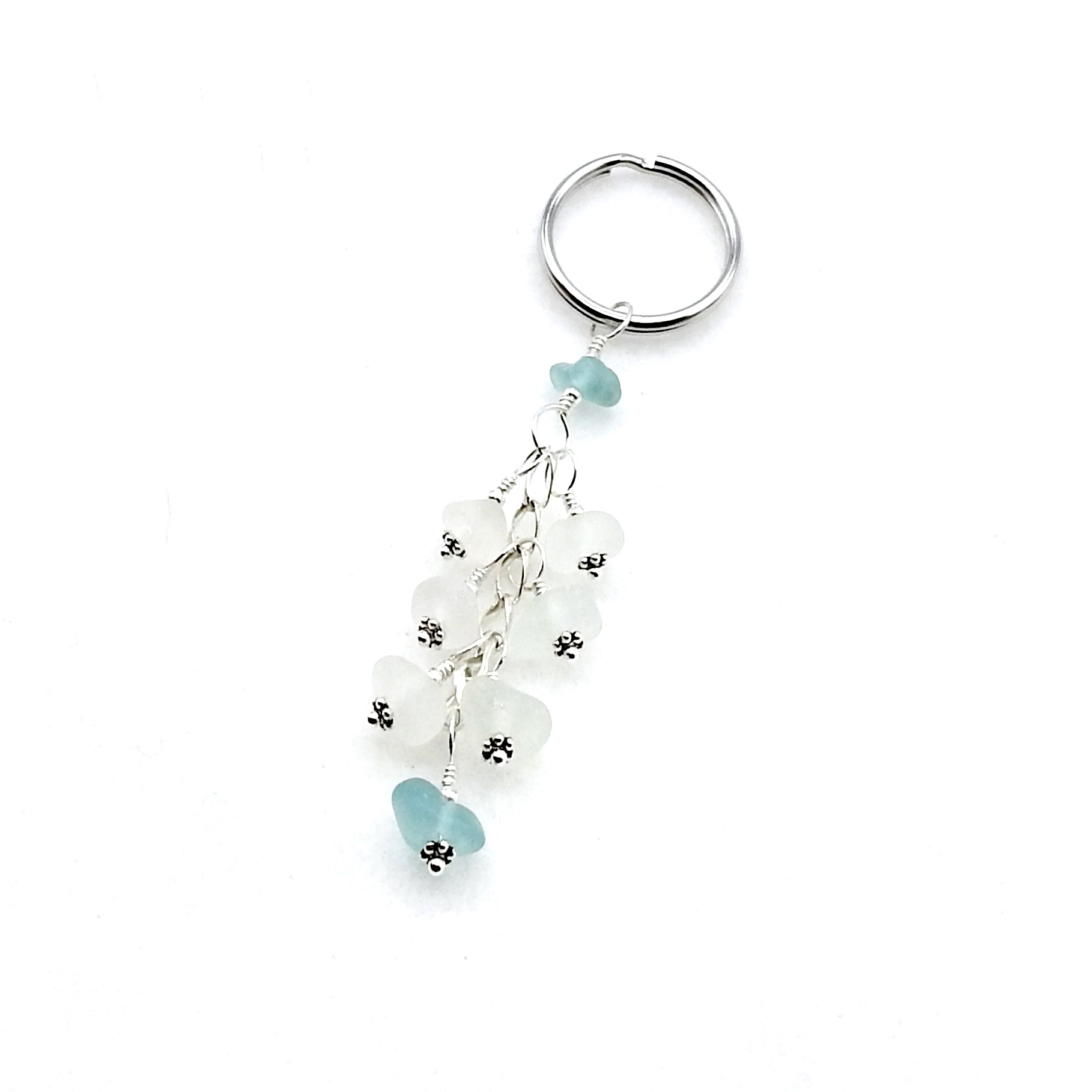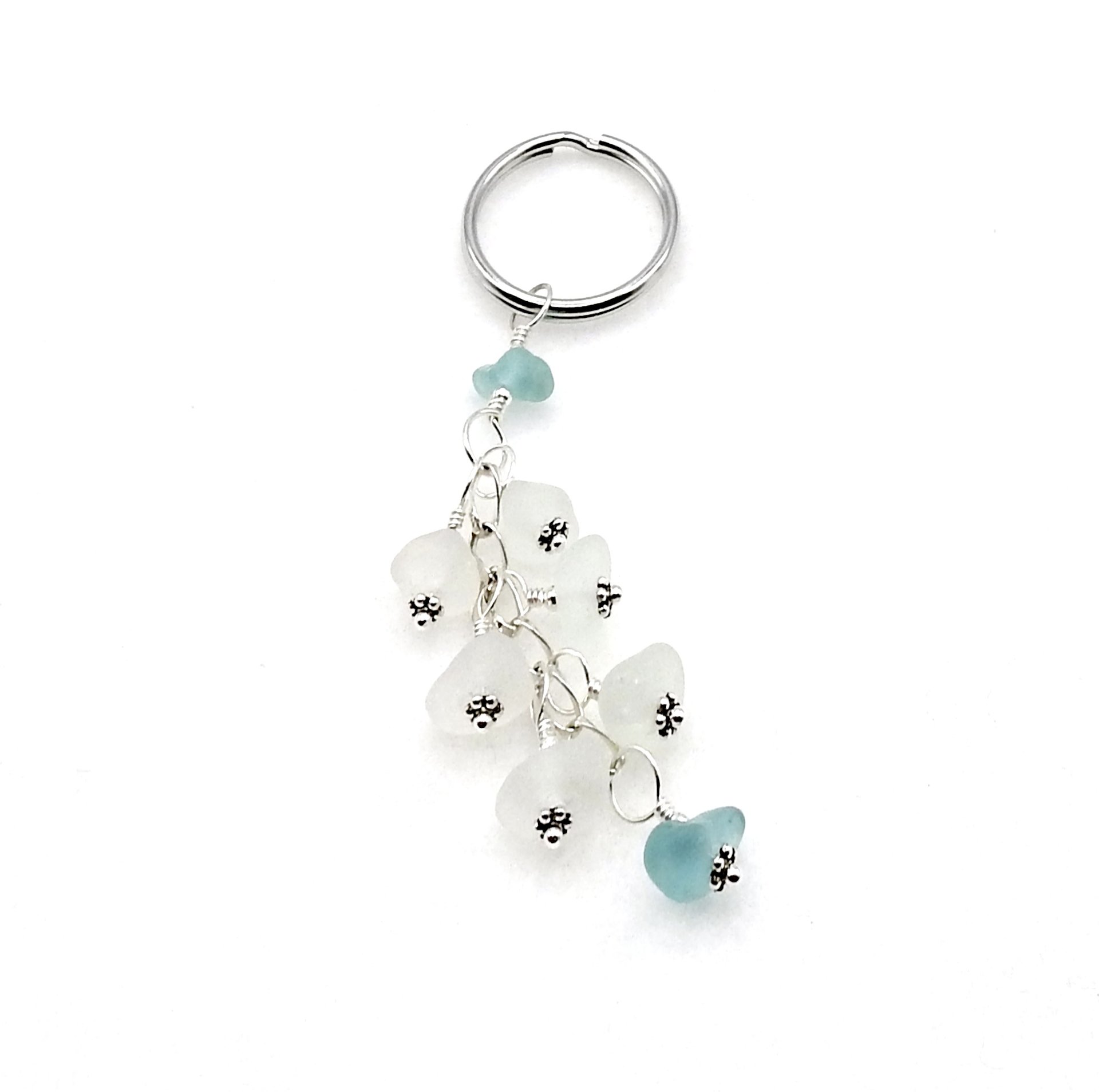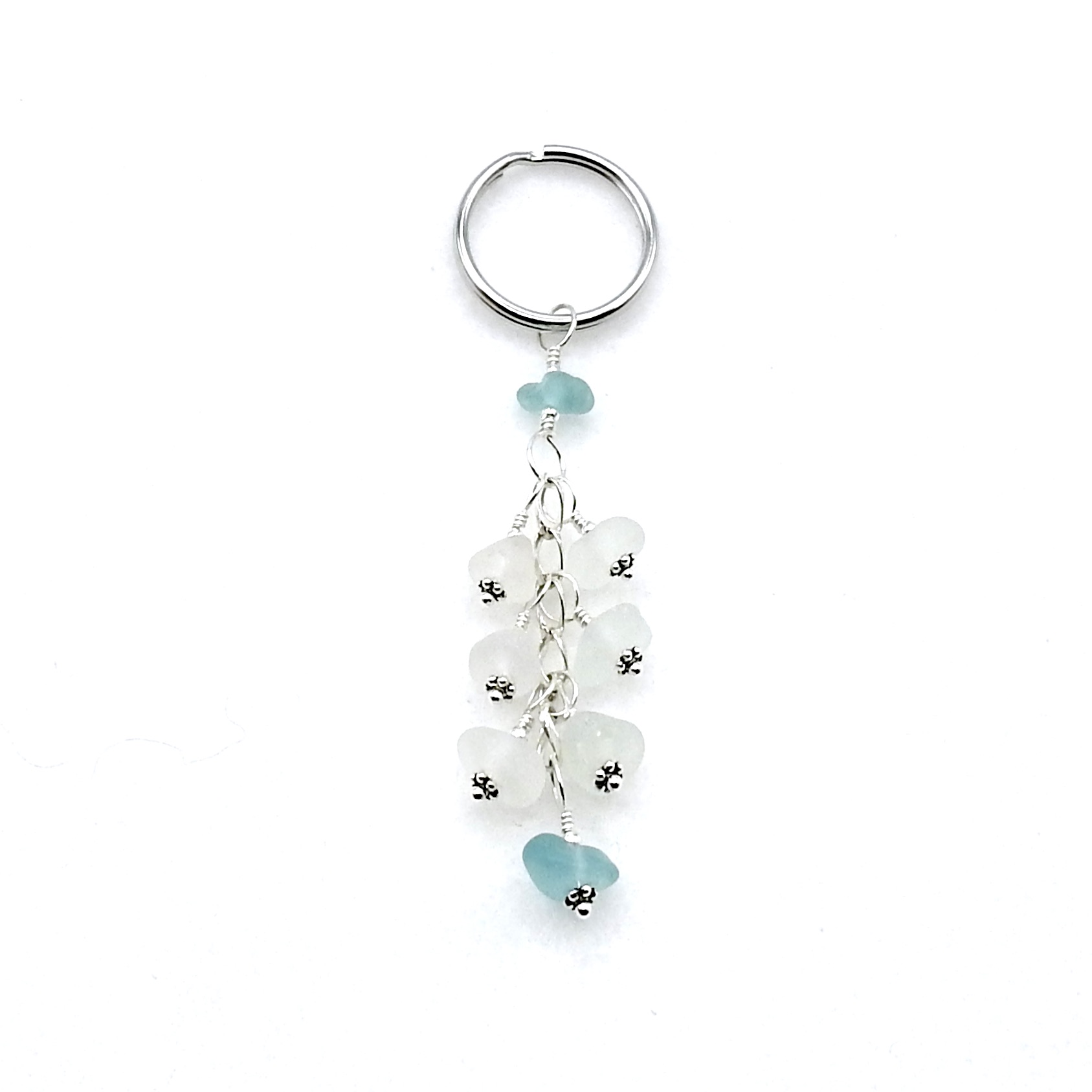 A dangly keychain, handmade with genuine sea glass in shades of white and soft pastel aqua blue.