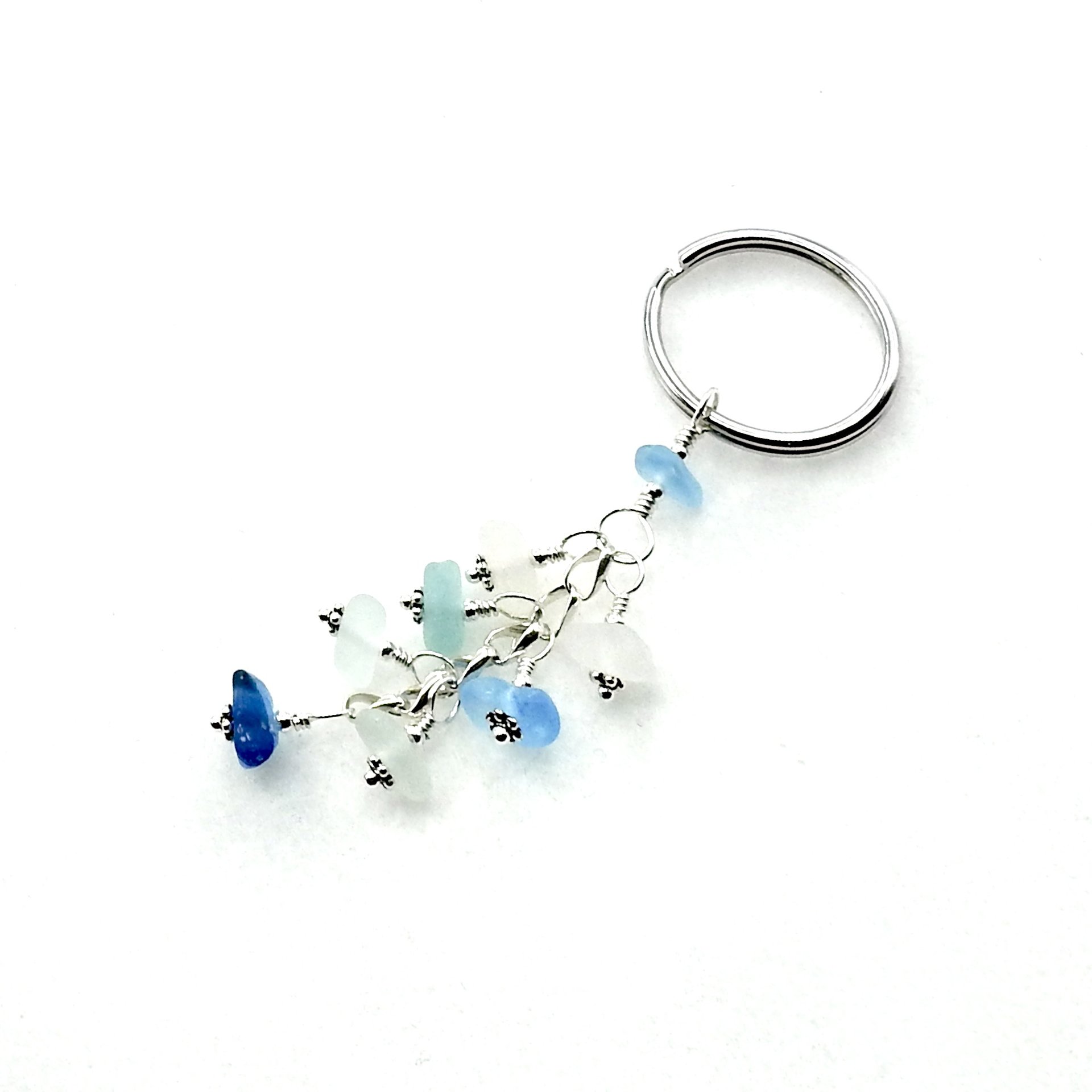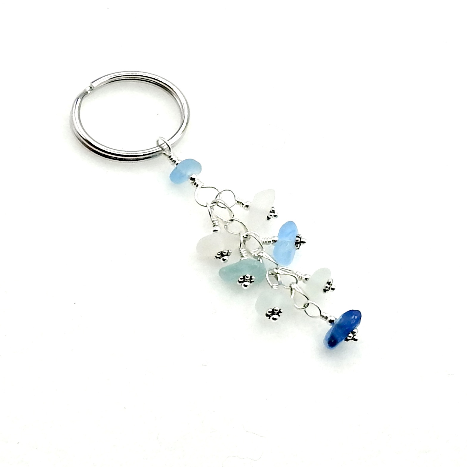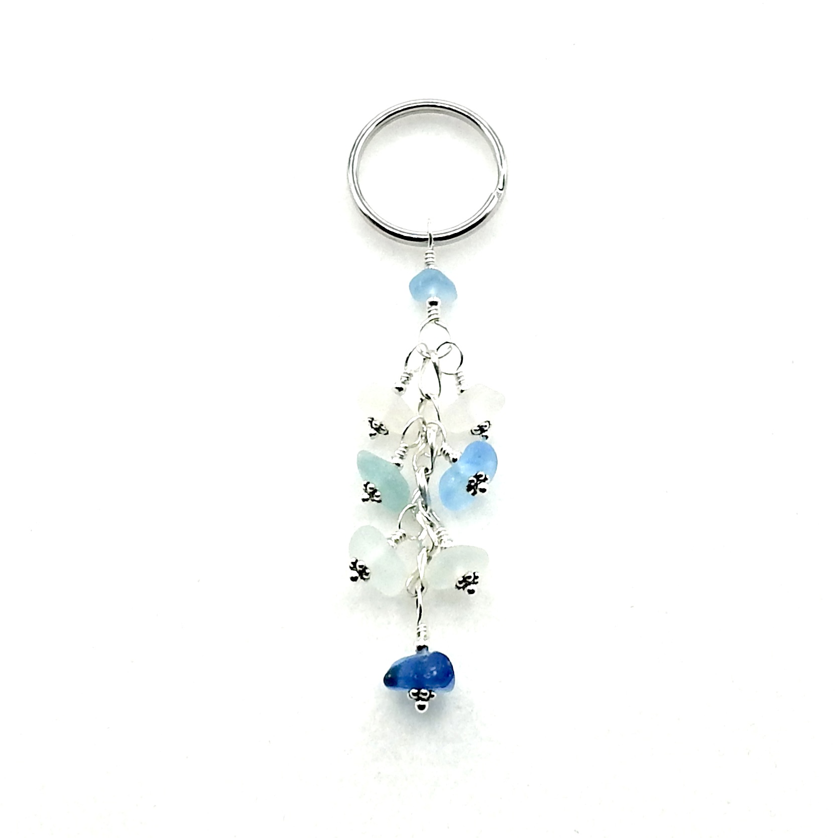 A dangly keychain, handmade with genuine sea glass pieces in shades of white with blue accents.