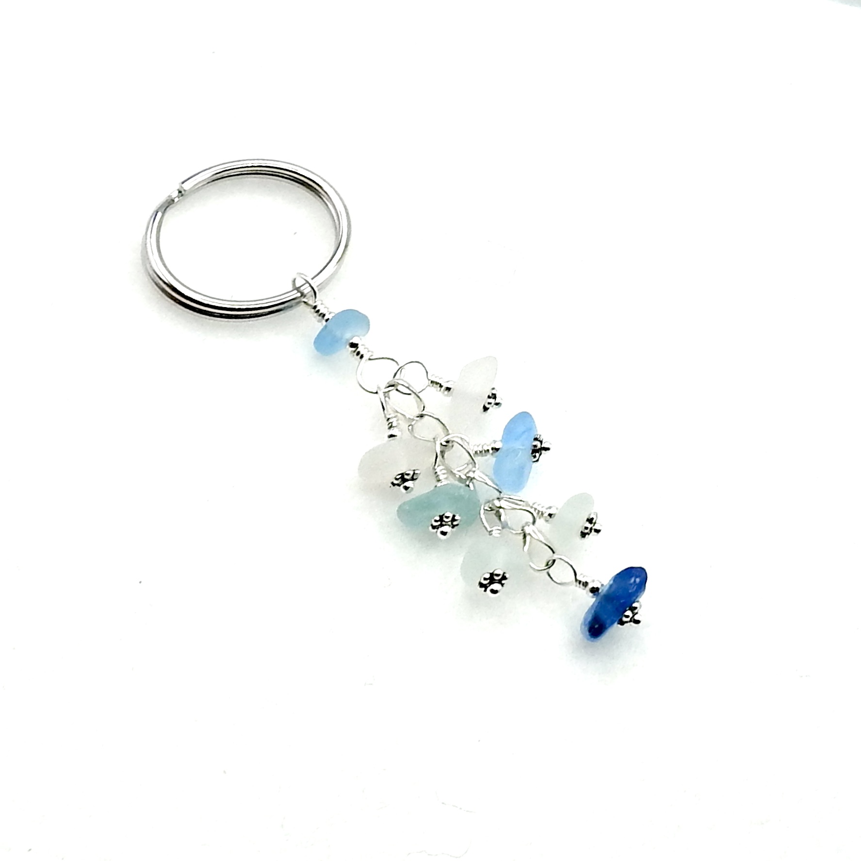 A dangly keychain, handmade with authentic sea glass pieces in shades of white and blue.
