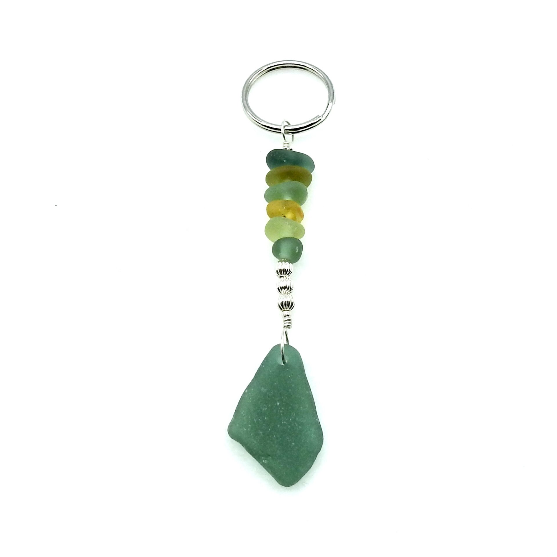 A summer themed beach keychain handmade with genuine sea glass pieces in multi colours with a teal green sea glass pendant.