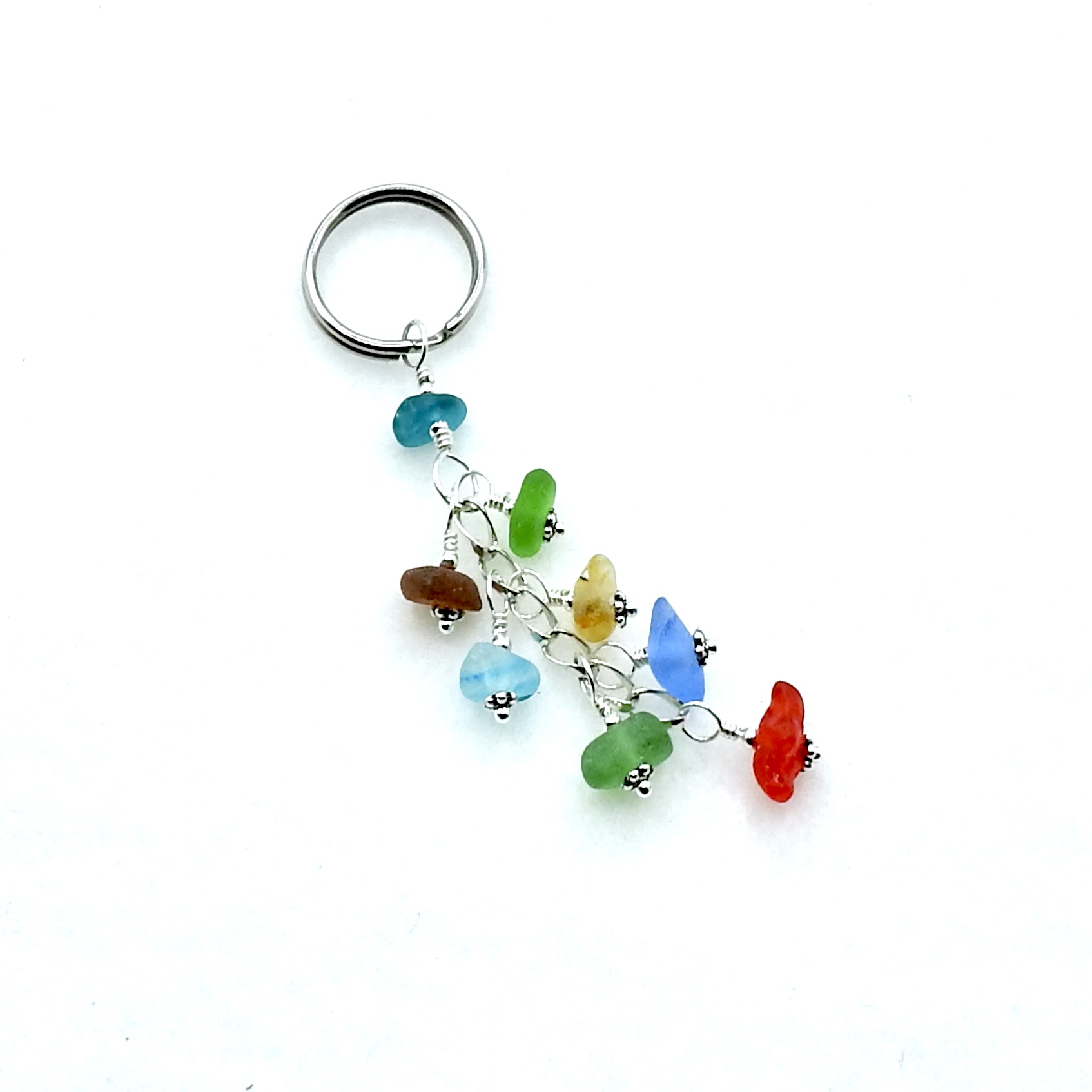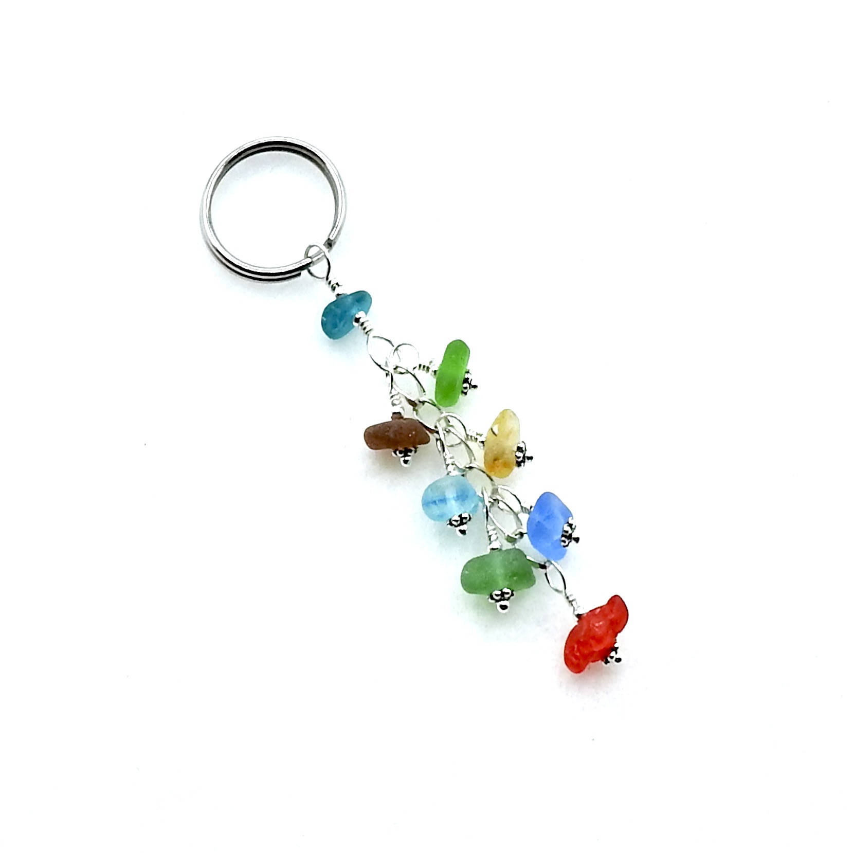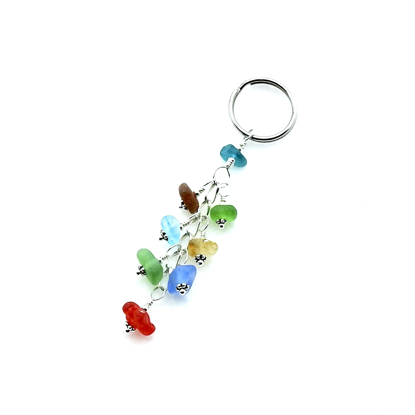A long dangly keychain, handmade with genuine sea glass pieces in bright and multi colours, some rare.