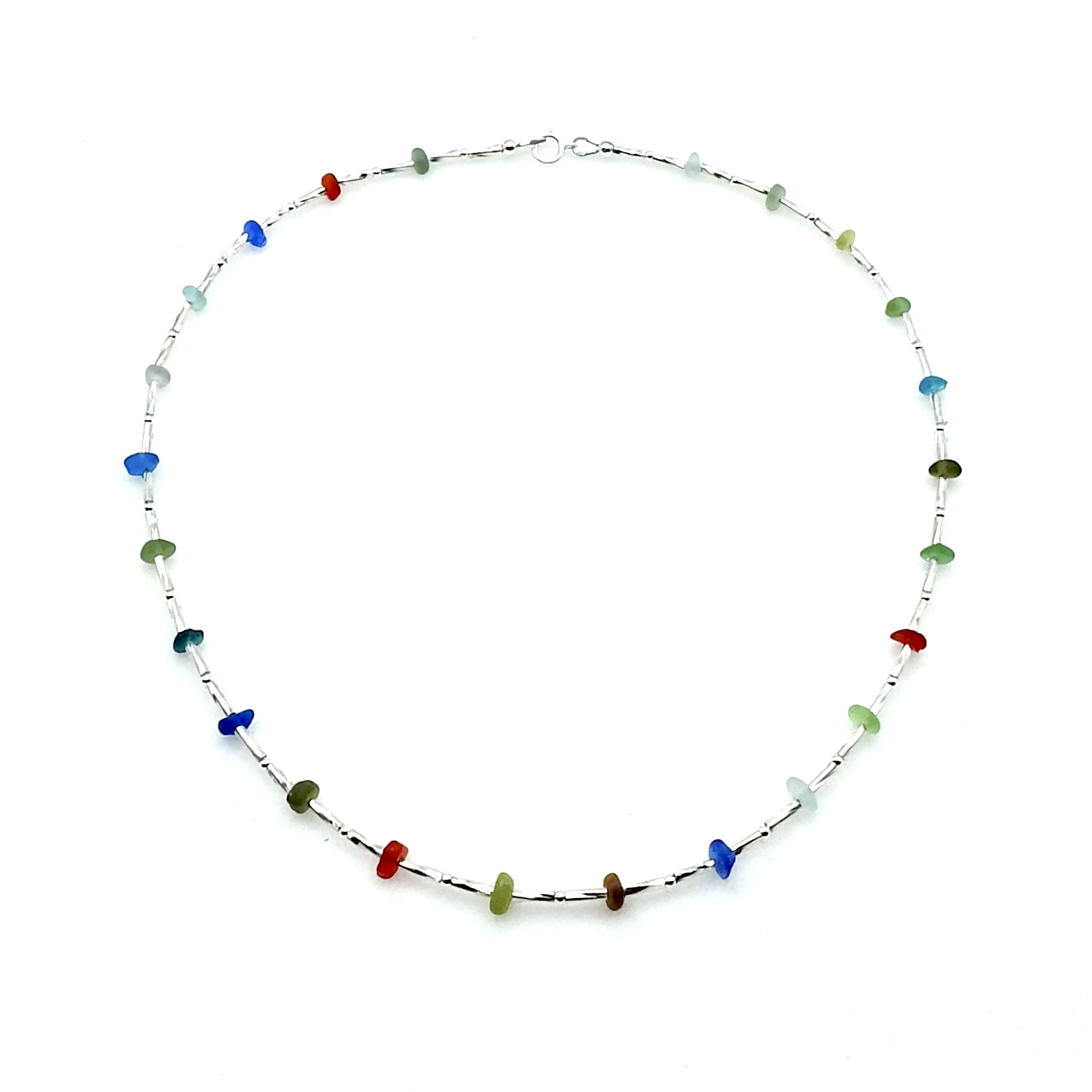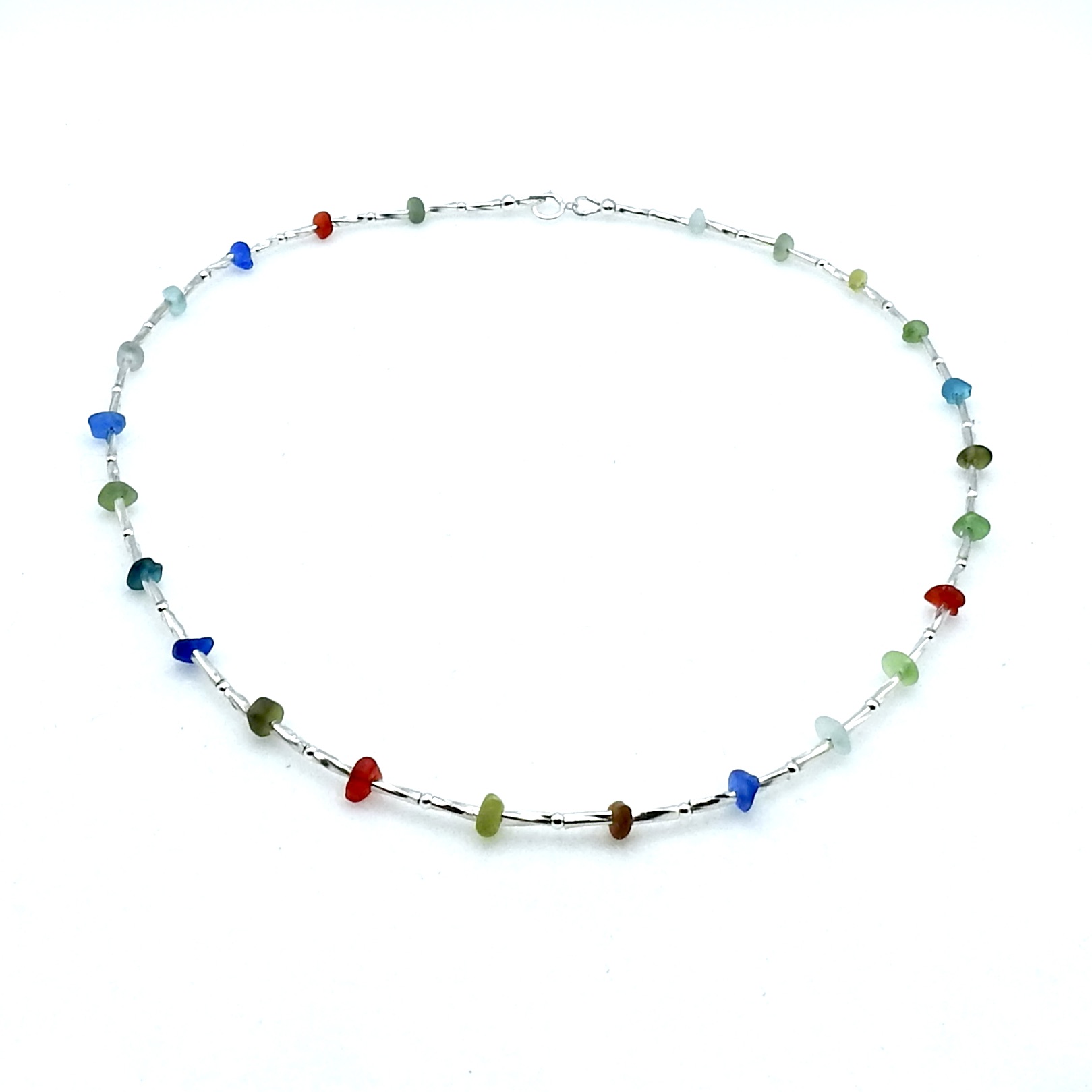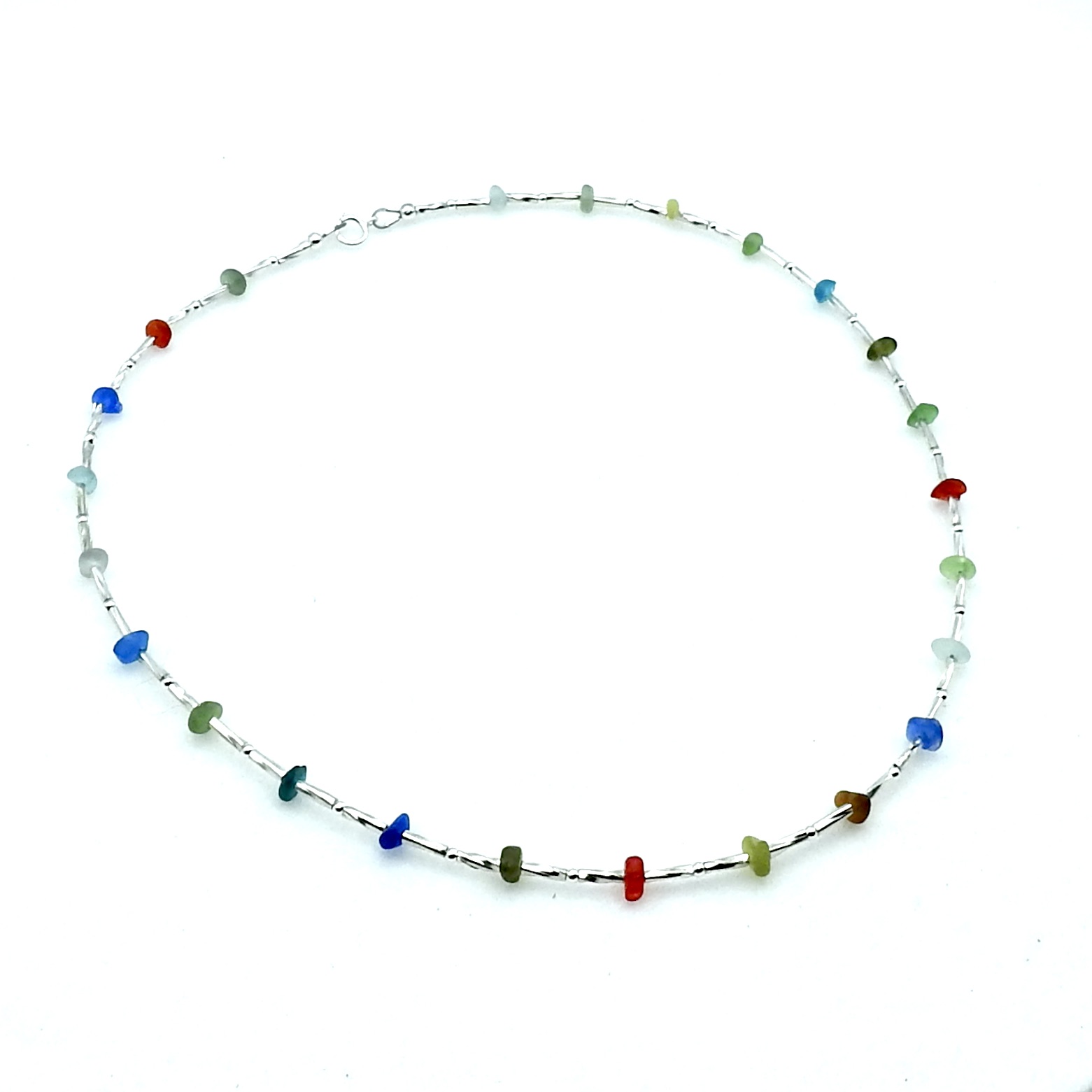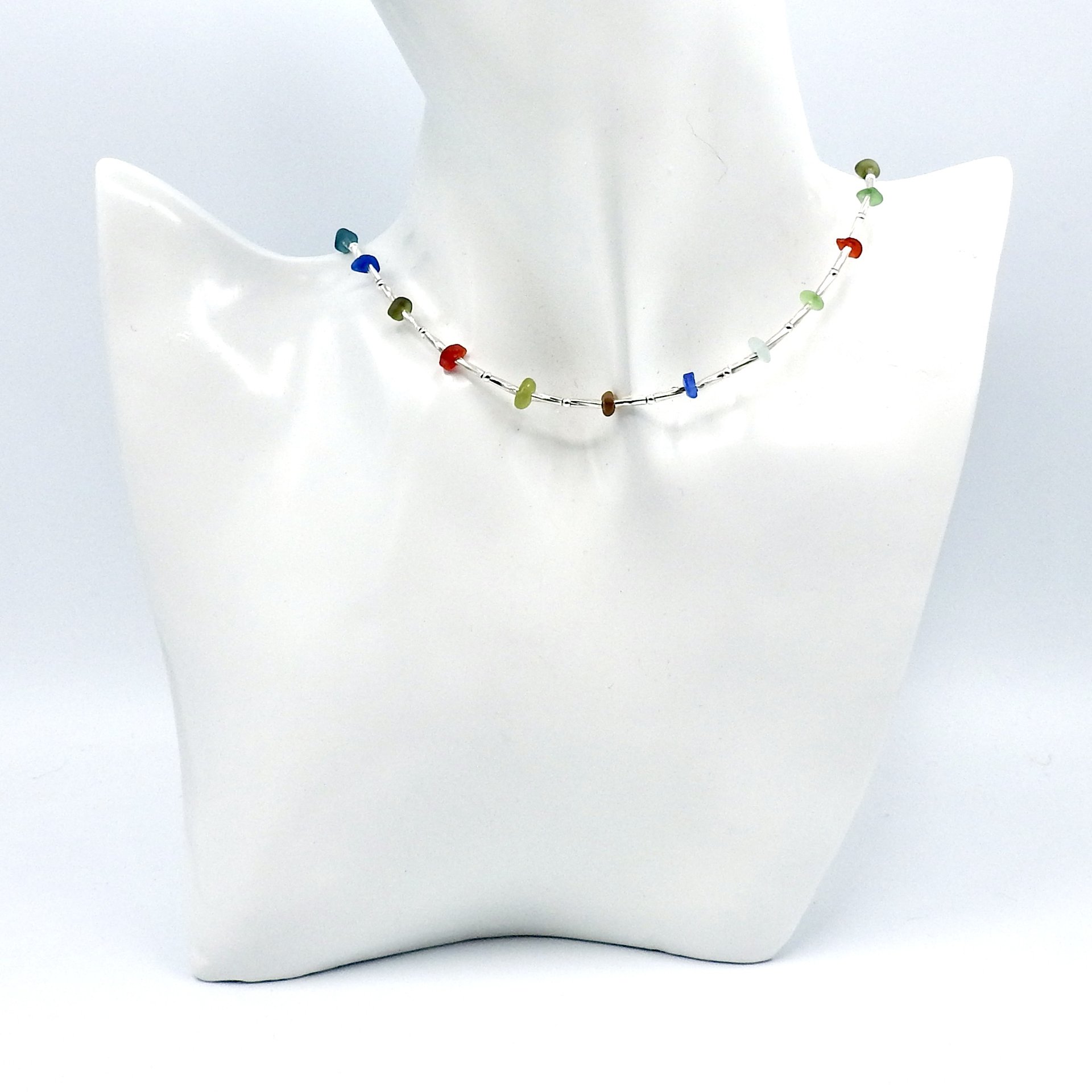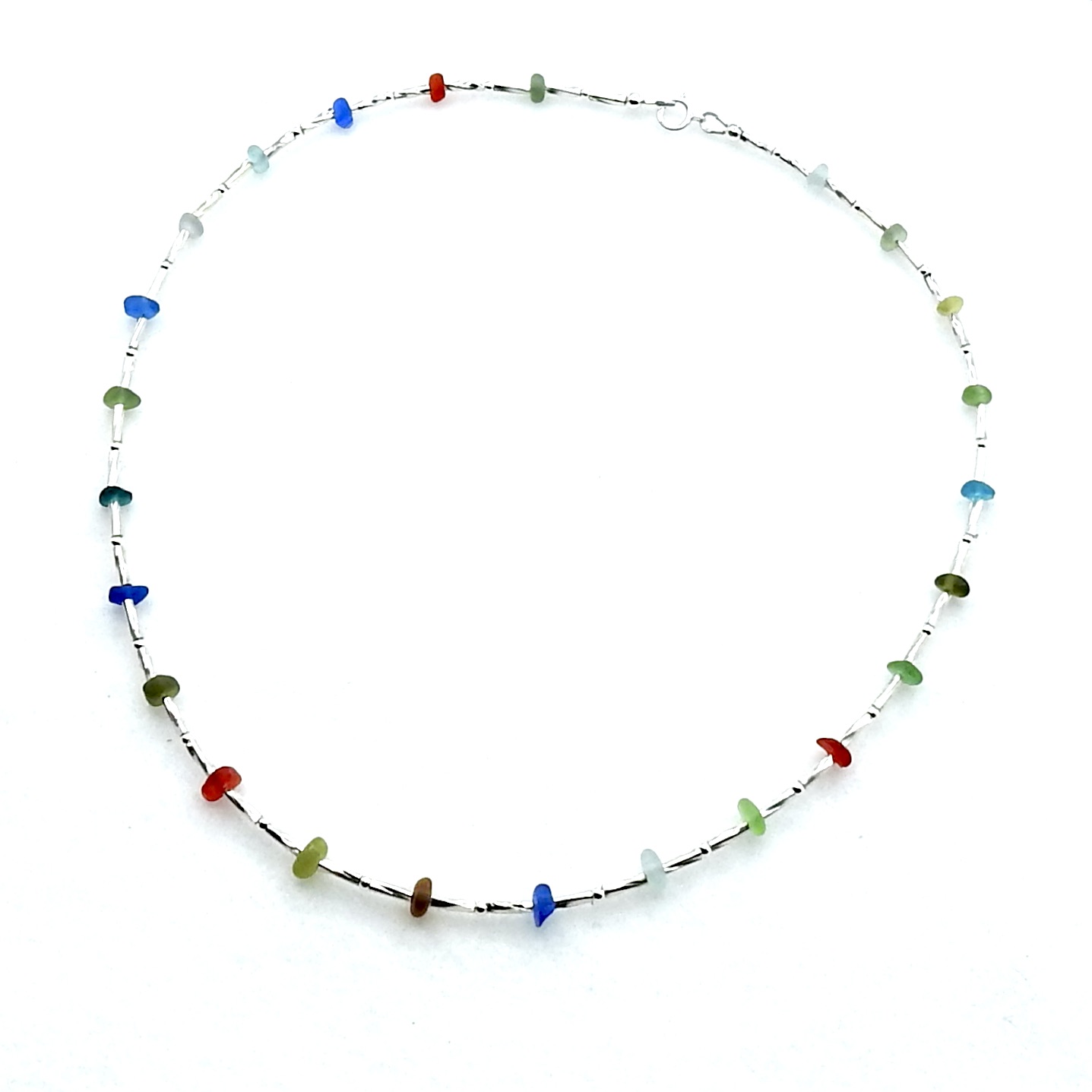 A short necklace, handmade with tiny genuine sea glass pieces in mixed colors.