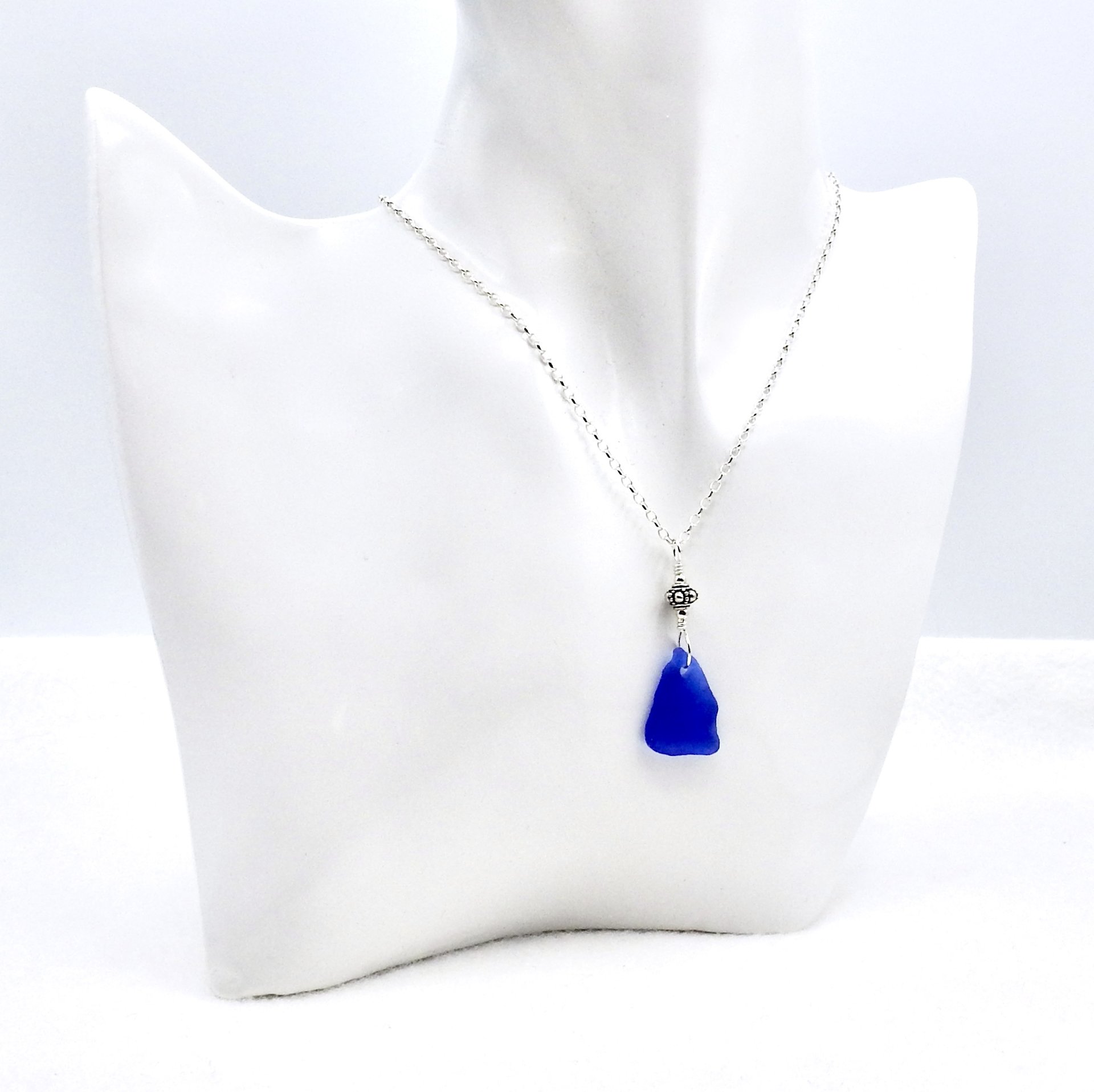 This short necklace is handmade with a cobalt blue genuine sea glass charm and a tiny sterling silver Bali bead accent.