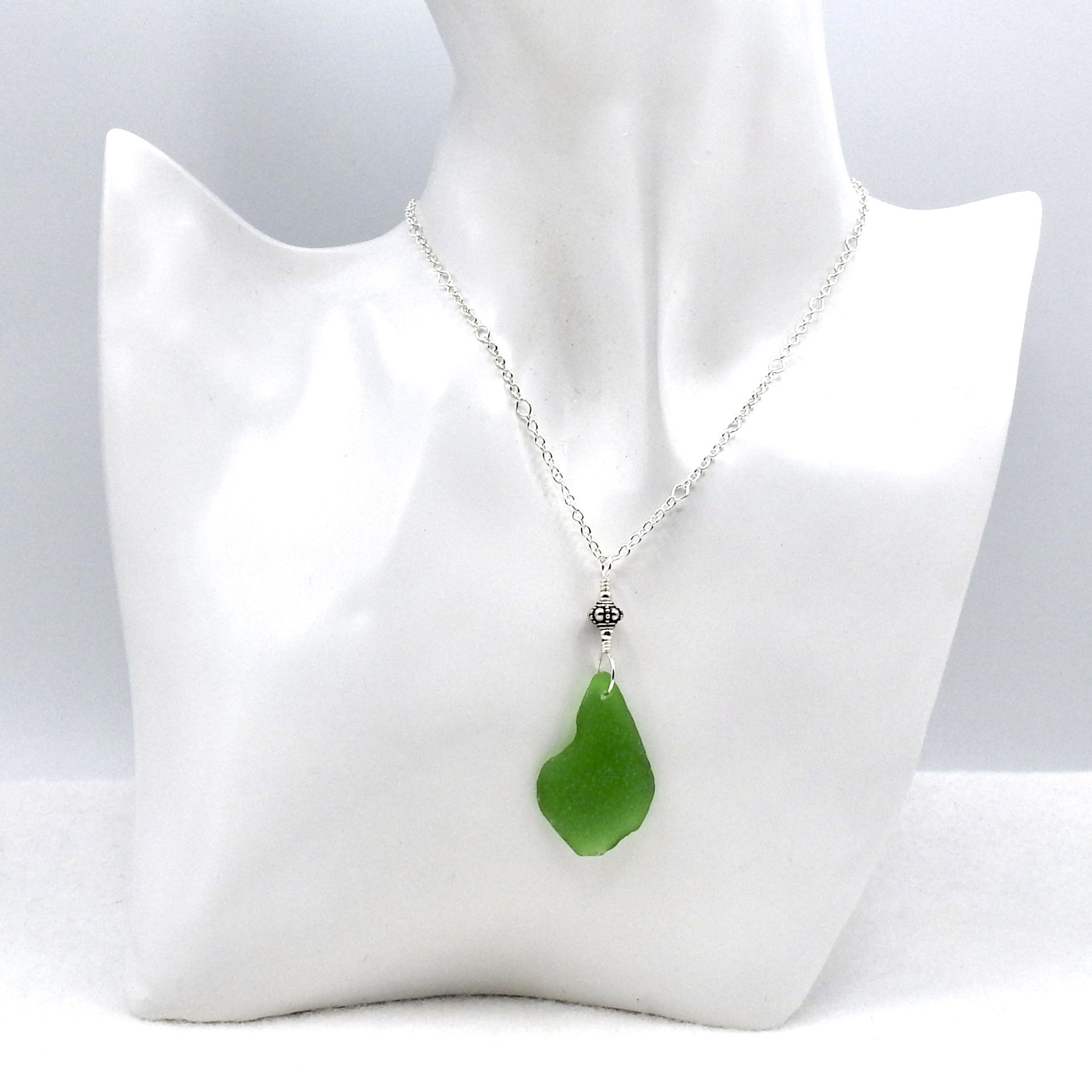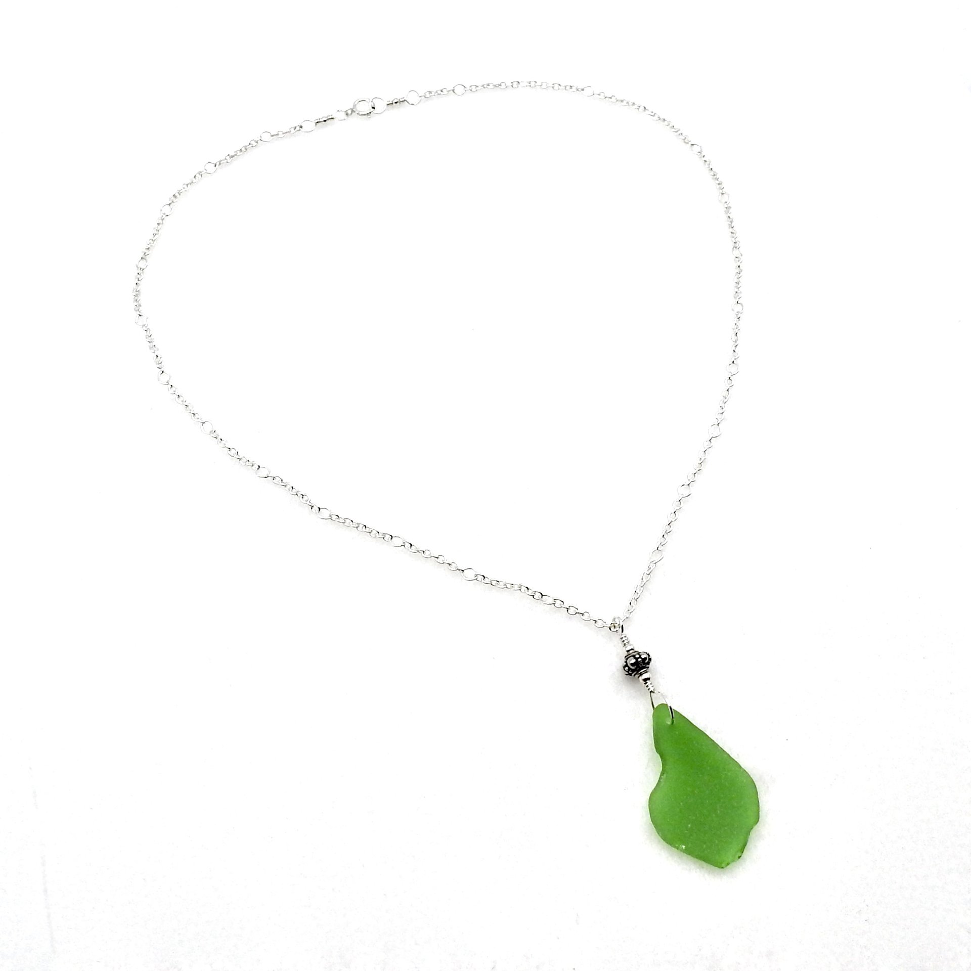 A handcrafted necklace with a green genuine sea glass pendant and a sterling silver Bali bead accent.