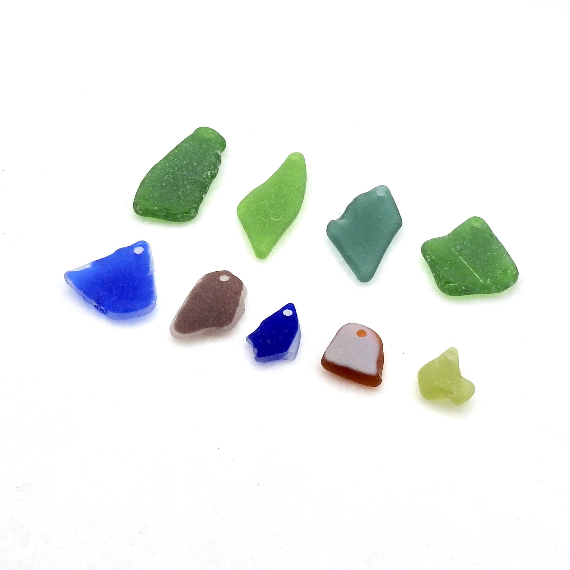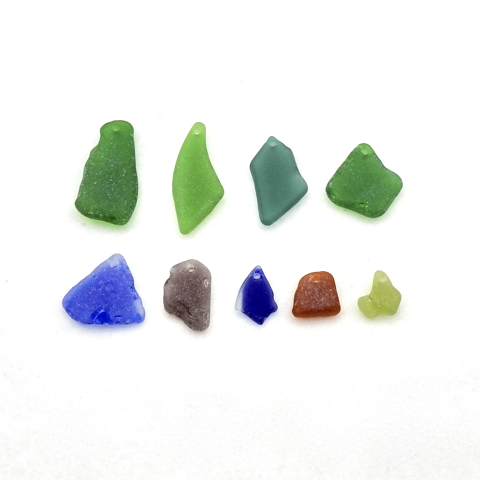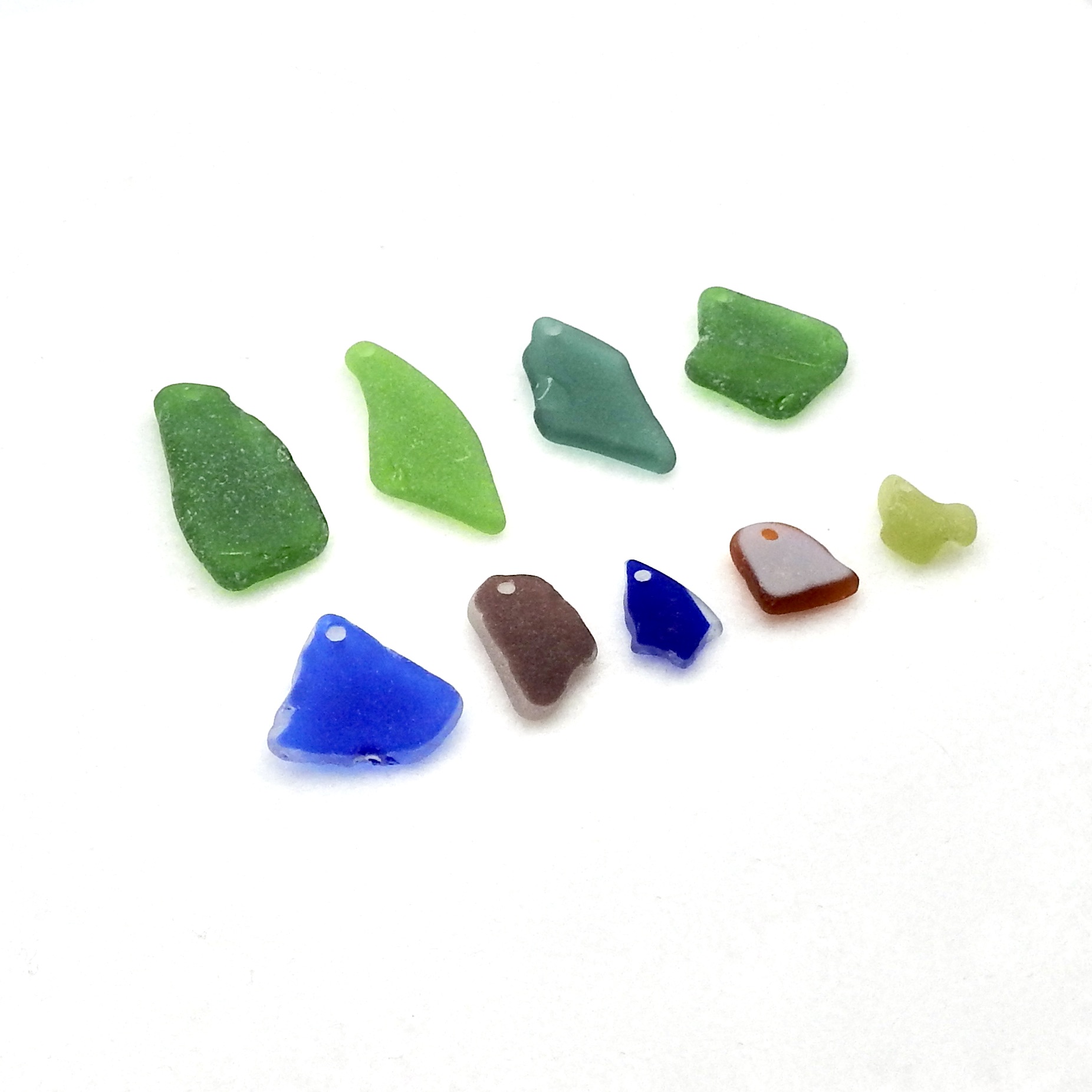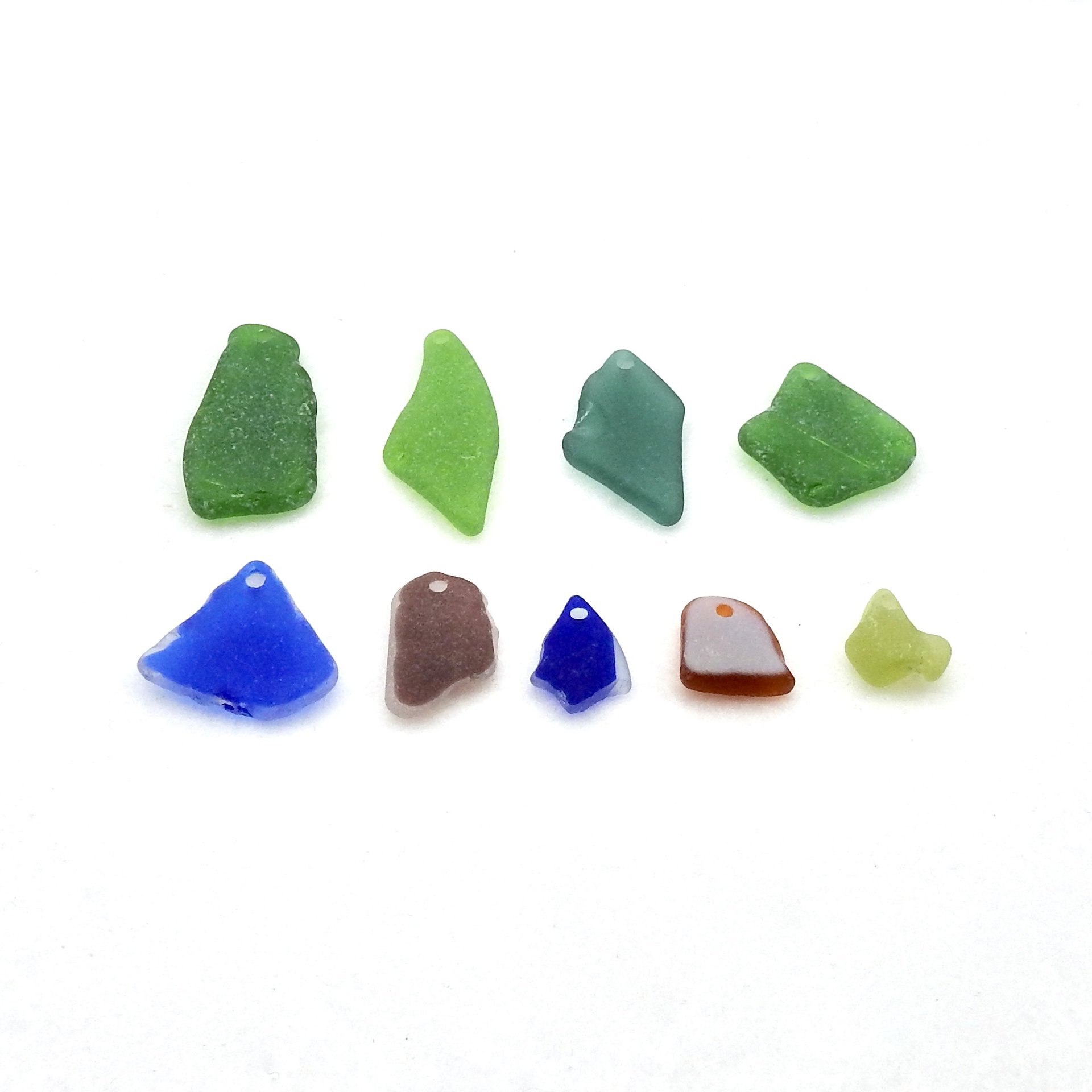 Real sea glass pendants and charms, set of 9, in mixed colours, shapes and sizes with top drilled holes for jewelry making, sun catchers or other beach themed crafts.