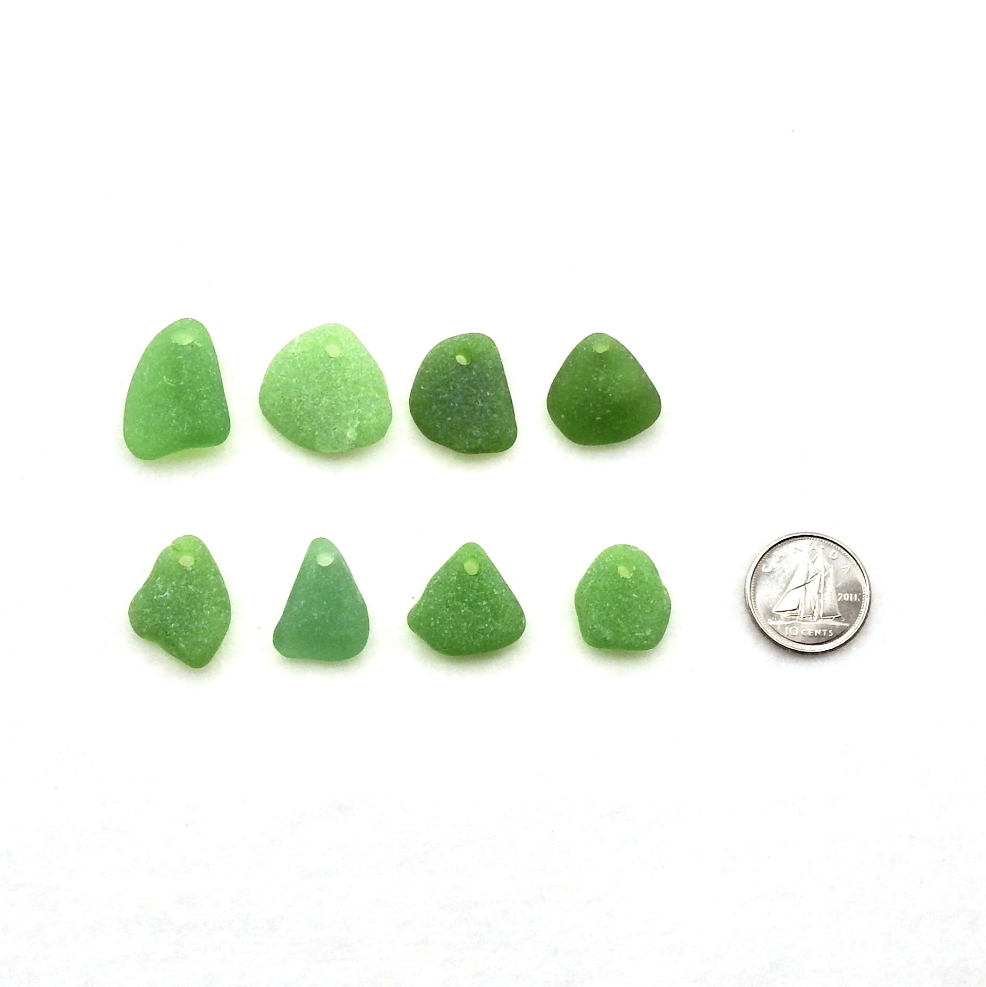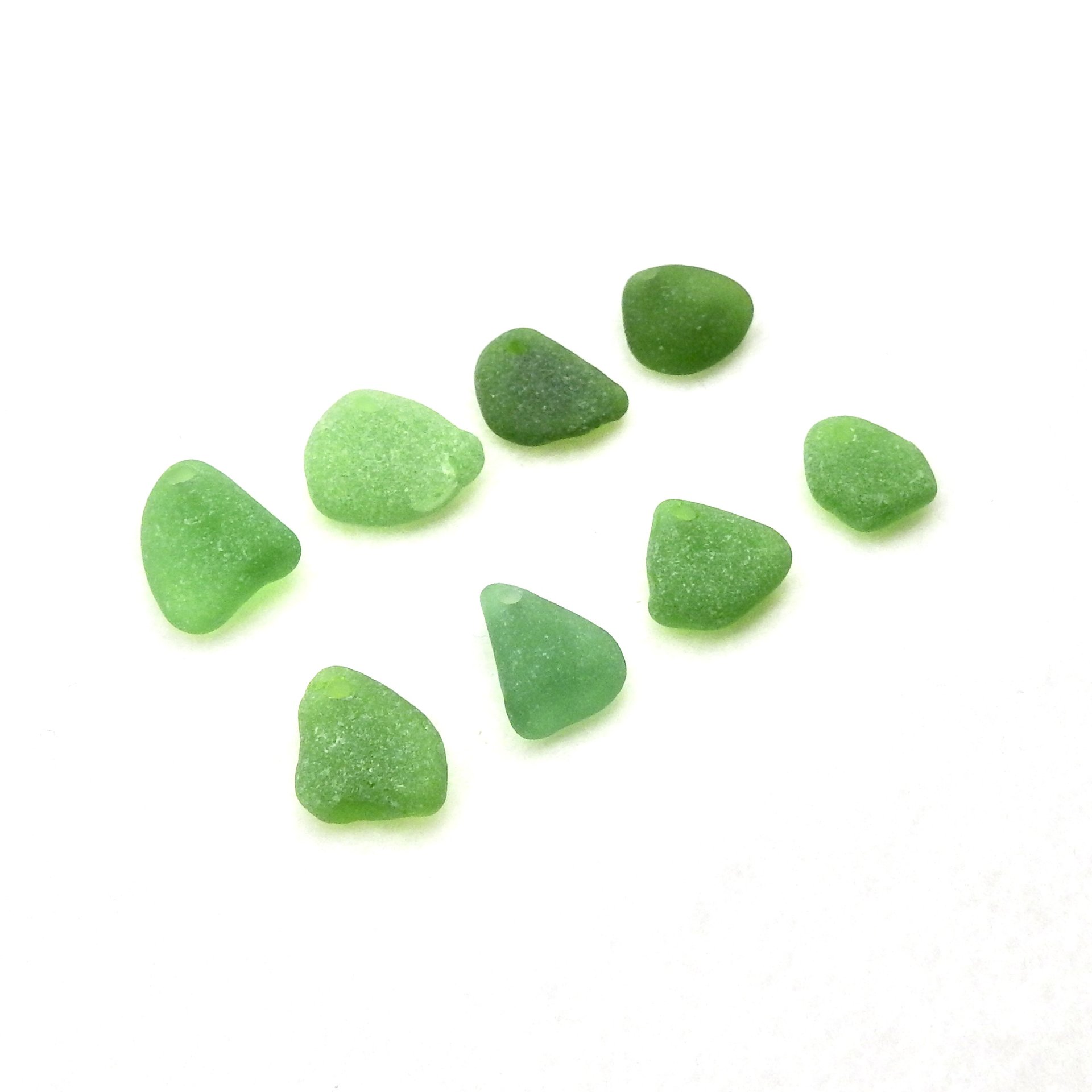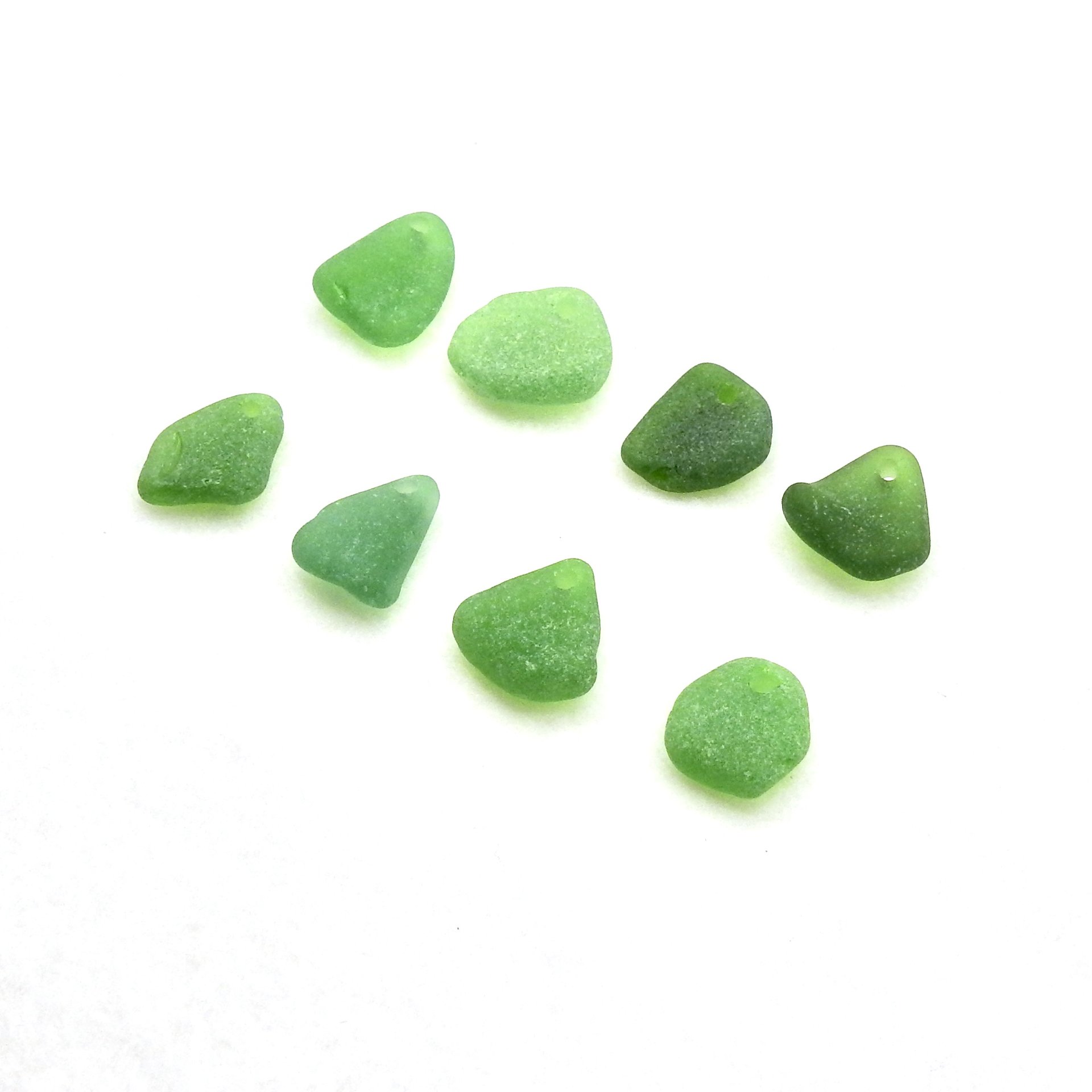 Real sea glass pendants and charms, set of 8, in shades of green for jewelry making, keychains or other beach themed crafts.