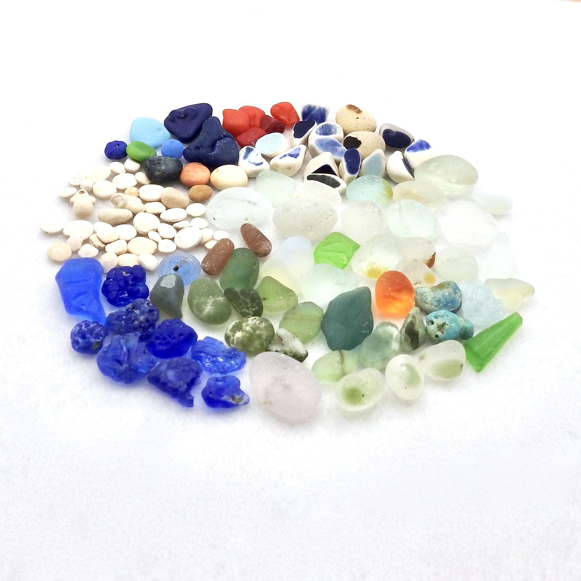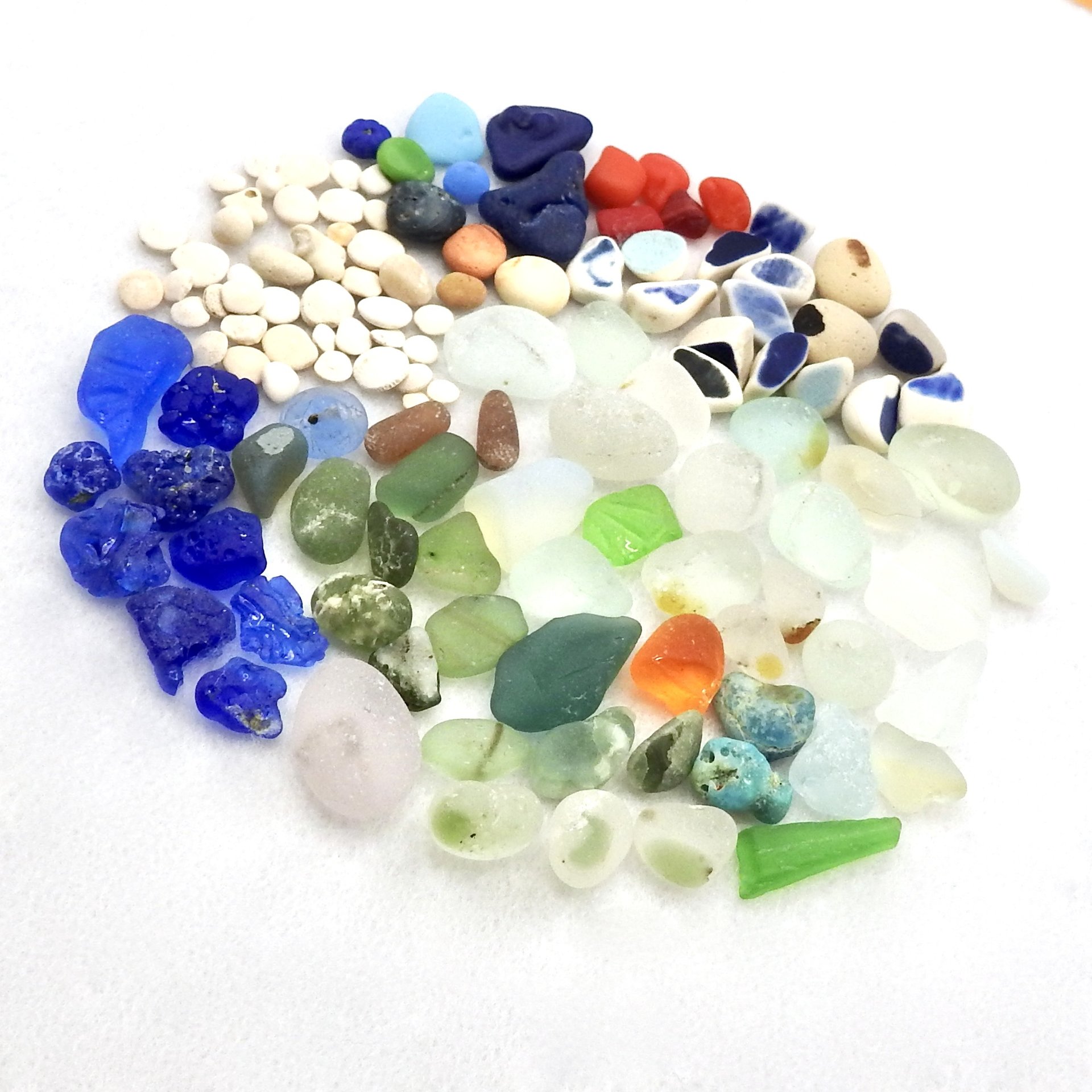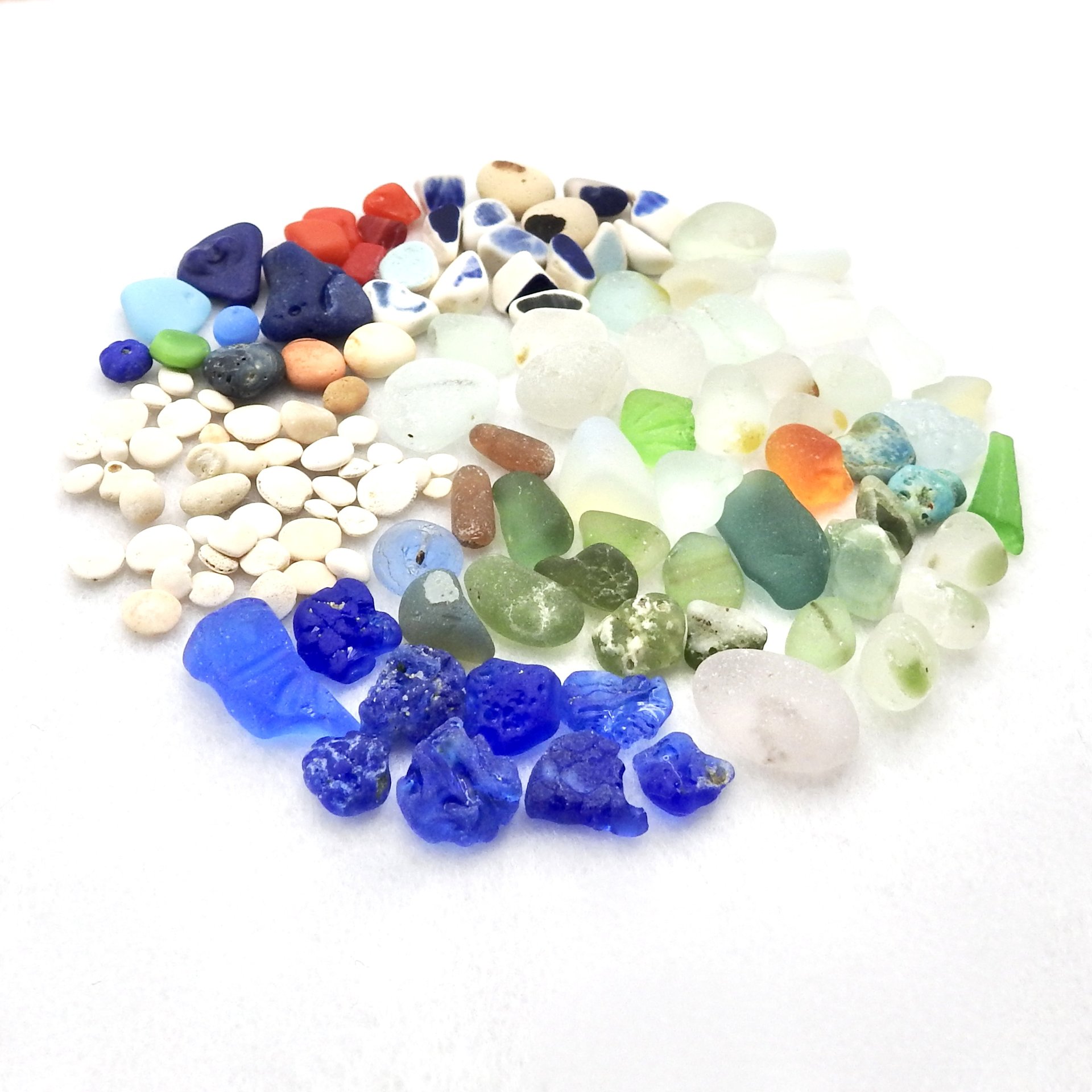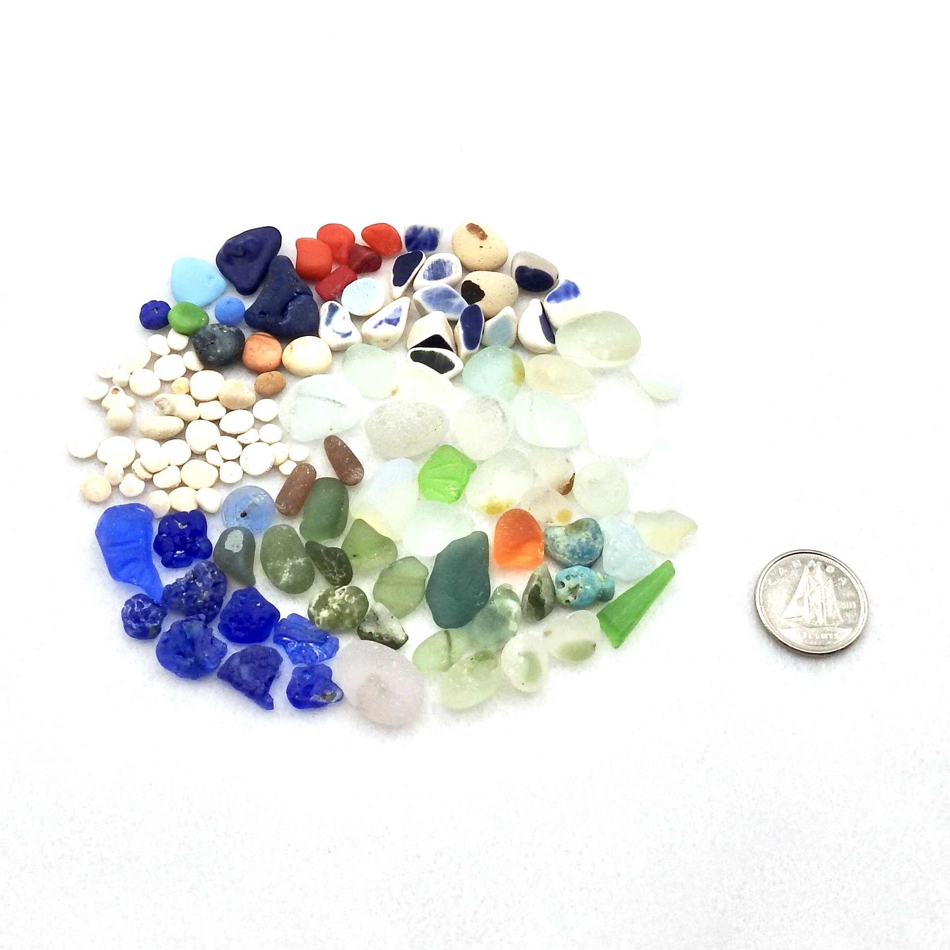 Extremely tiny to small genuine sea glass, set of 125 pieces of pottery, bonfire and other unusual beach finds.