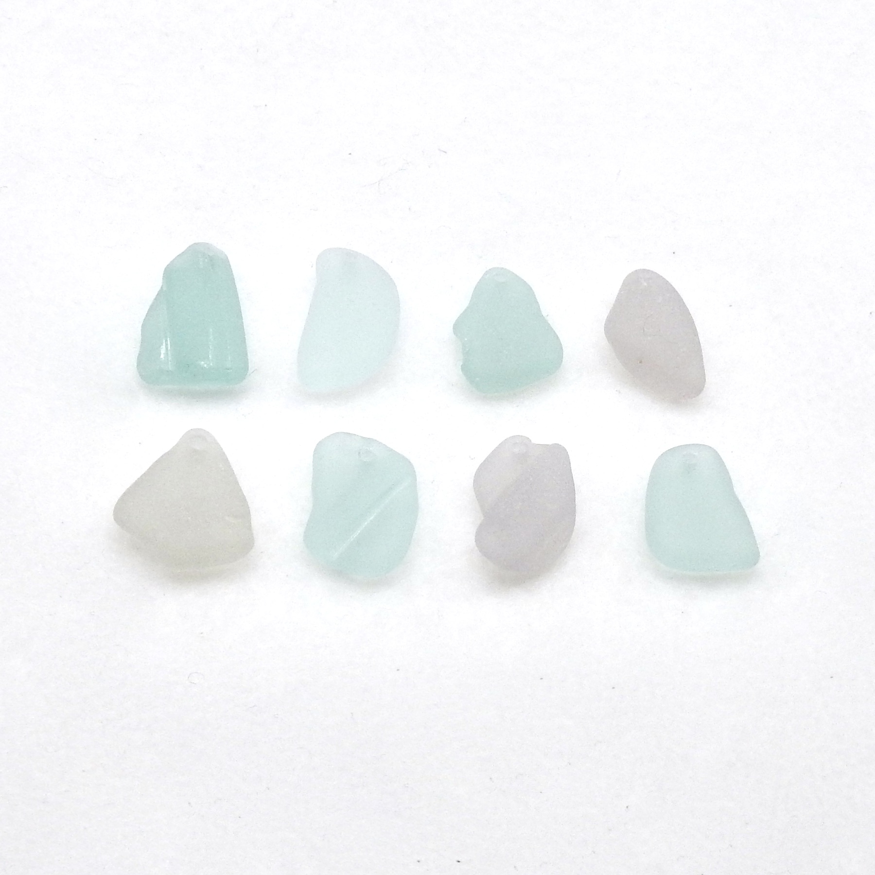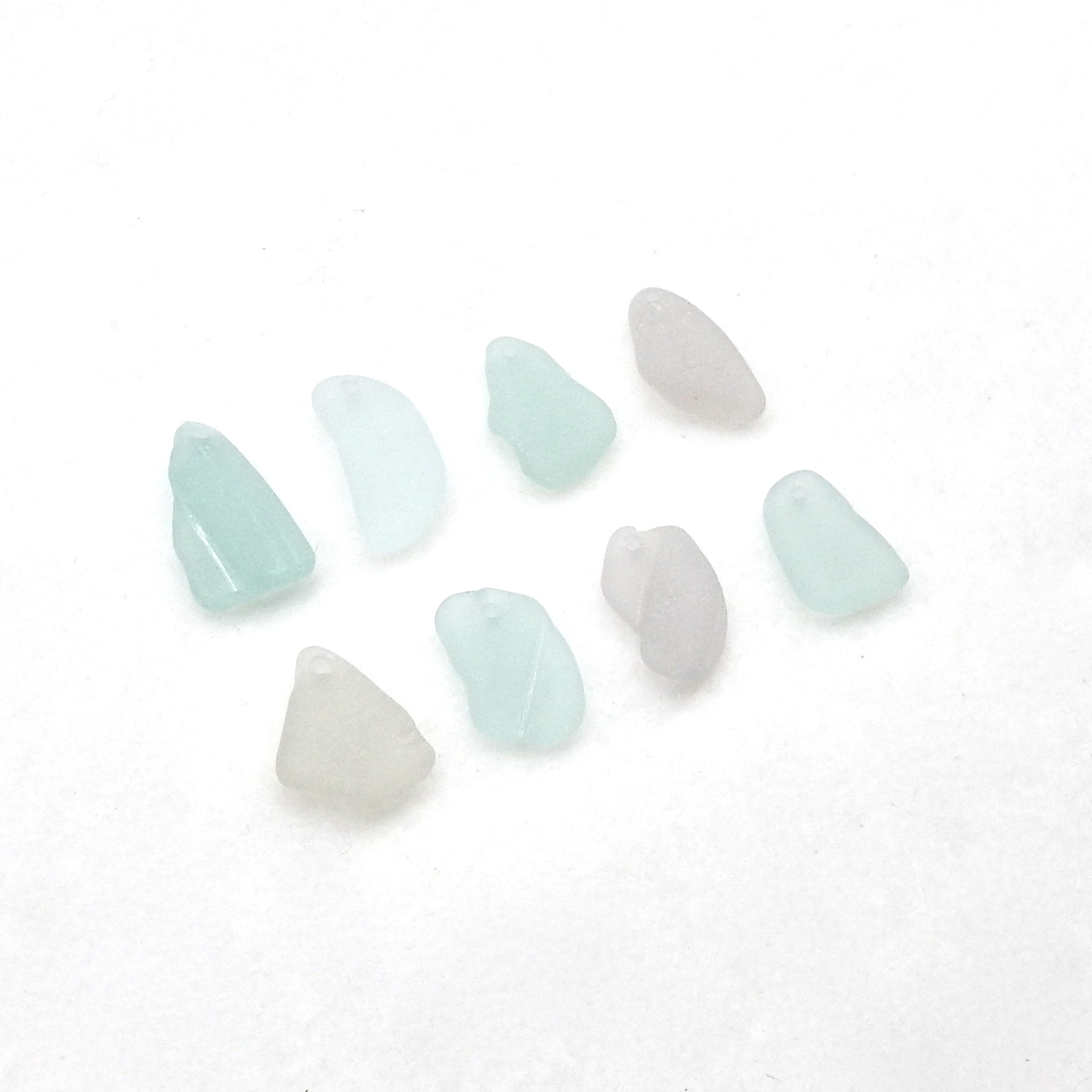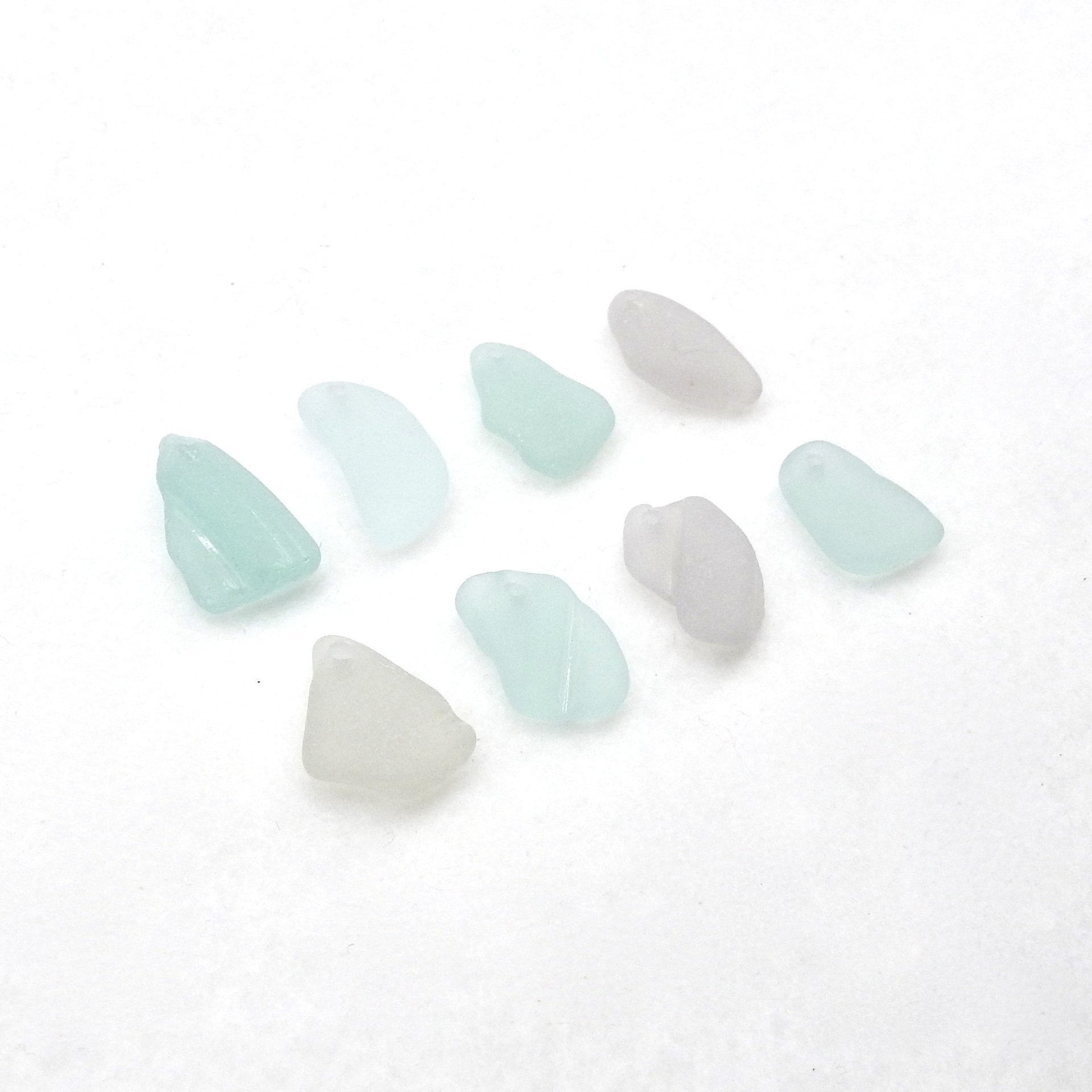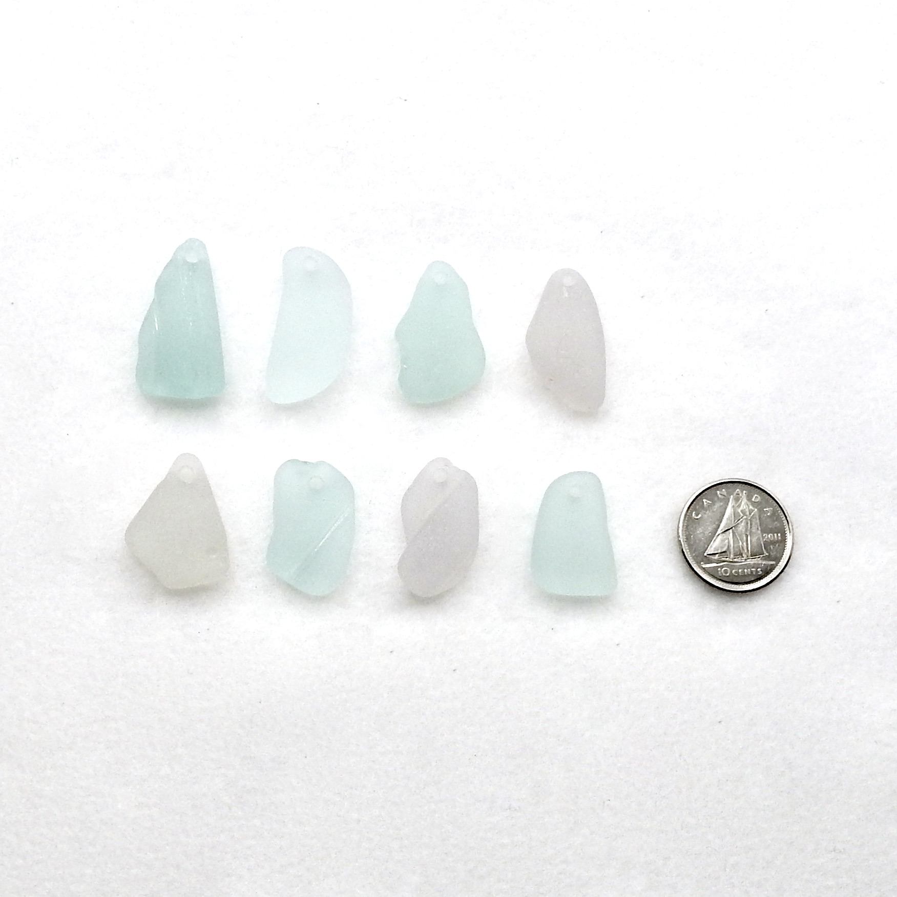 Genuine sea glass pendants, set of 8, in light pastel colours with top drilled holes for jewelry making or other beach themed crafts.