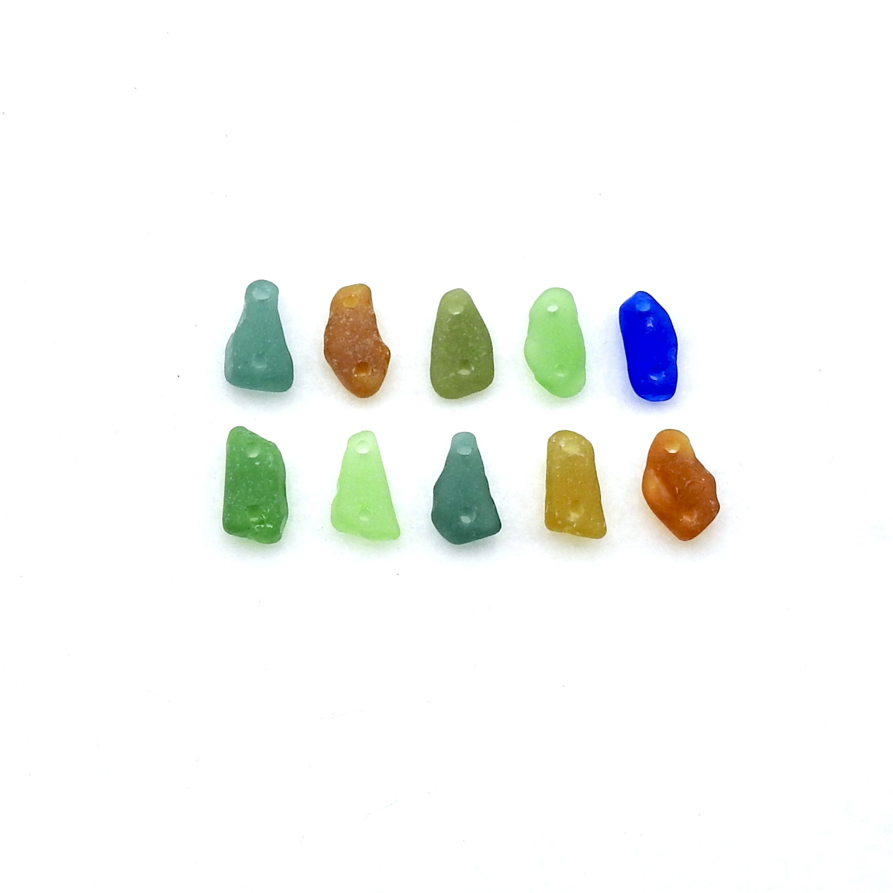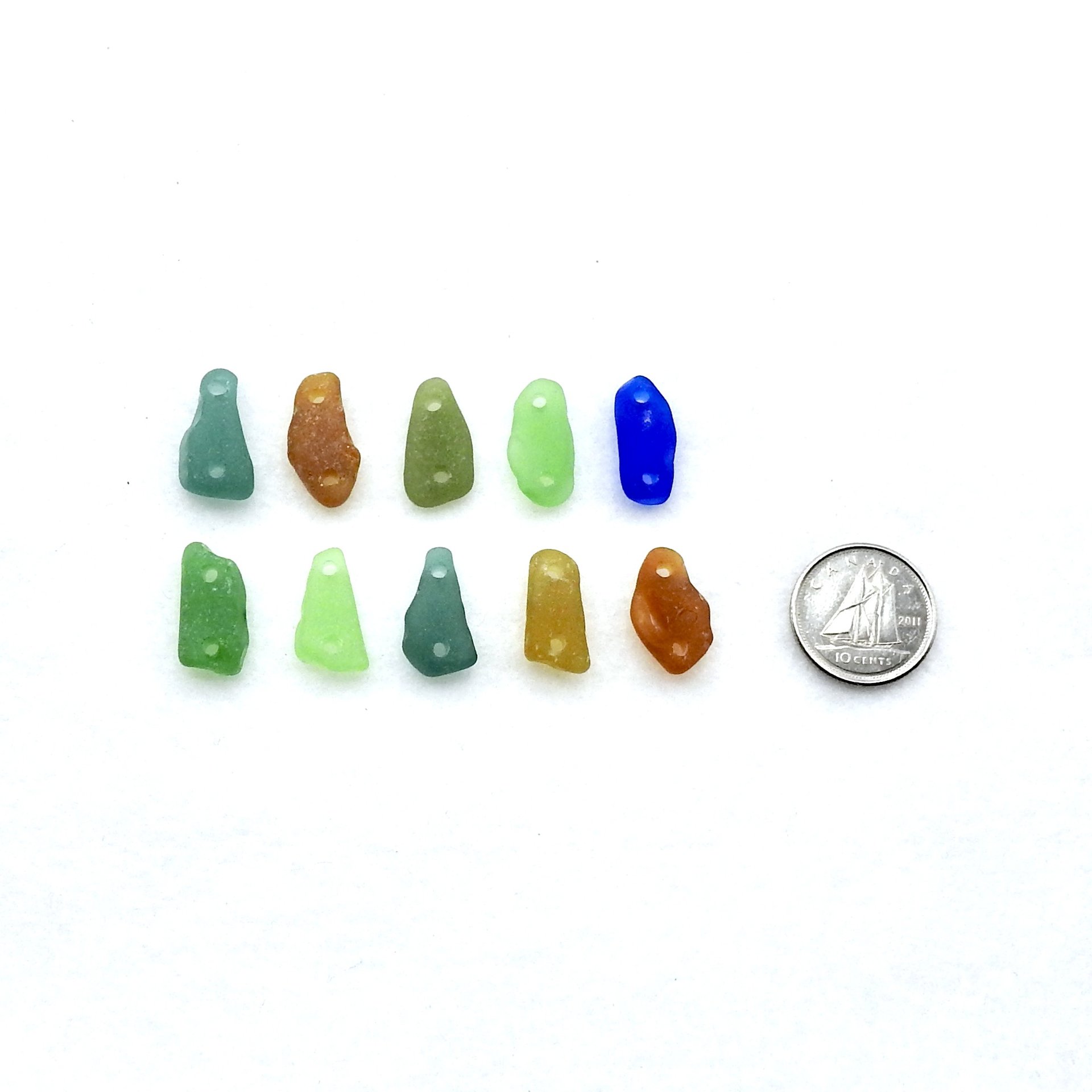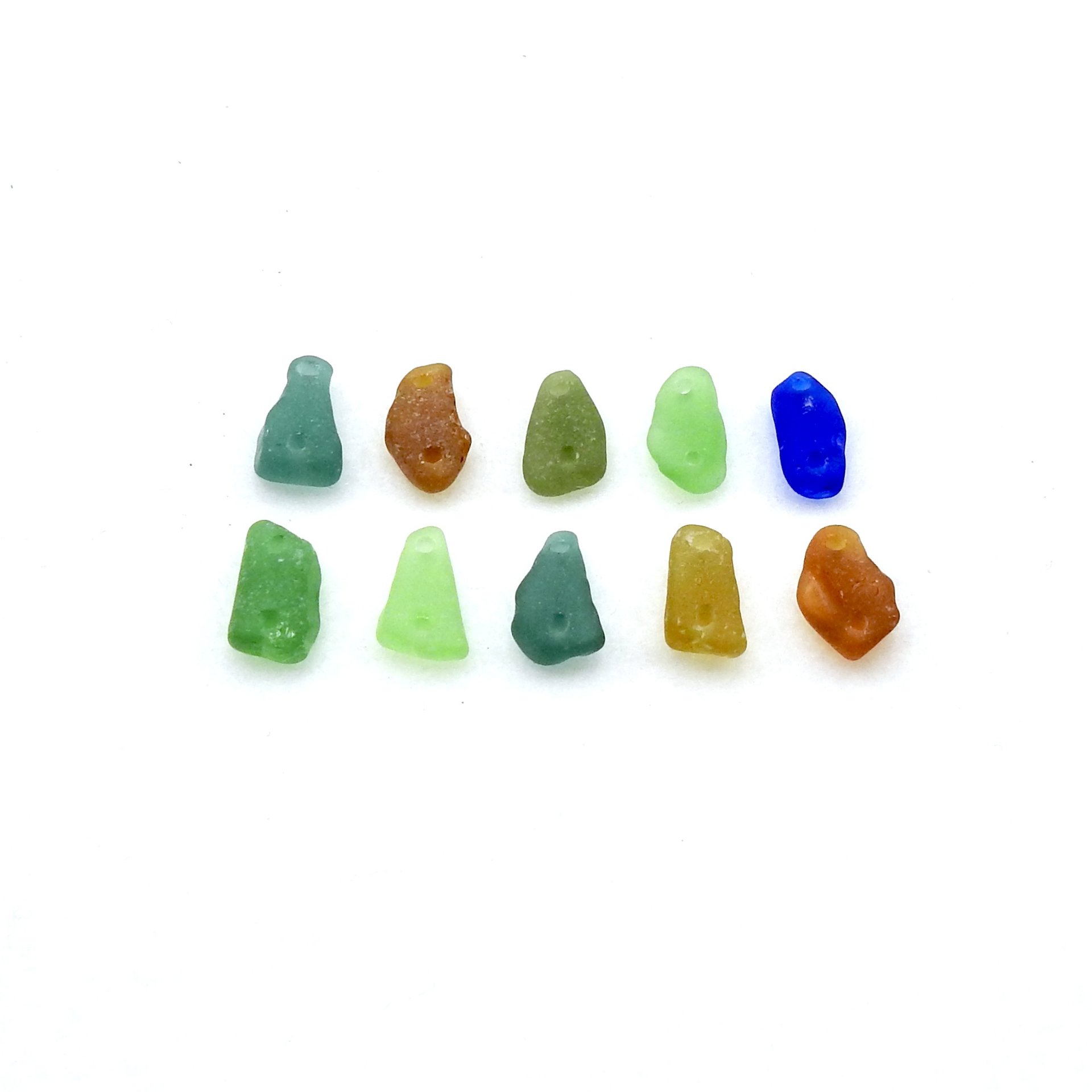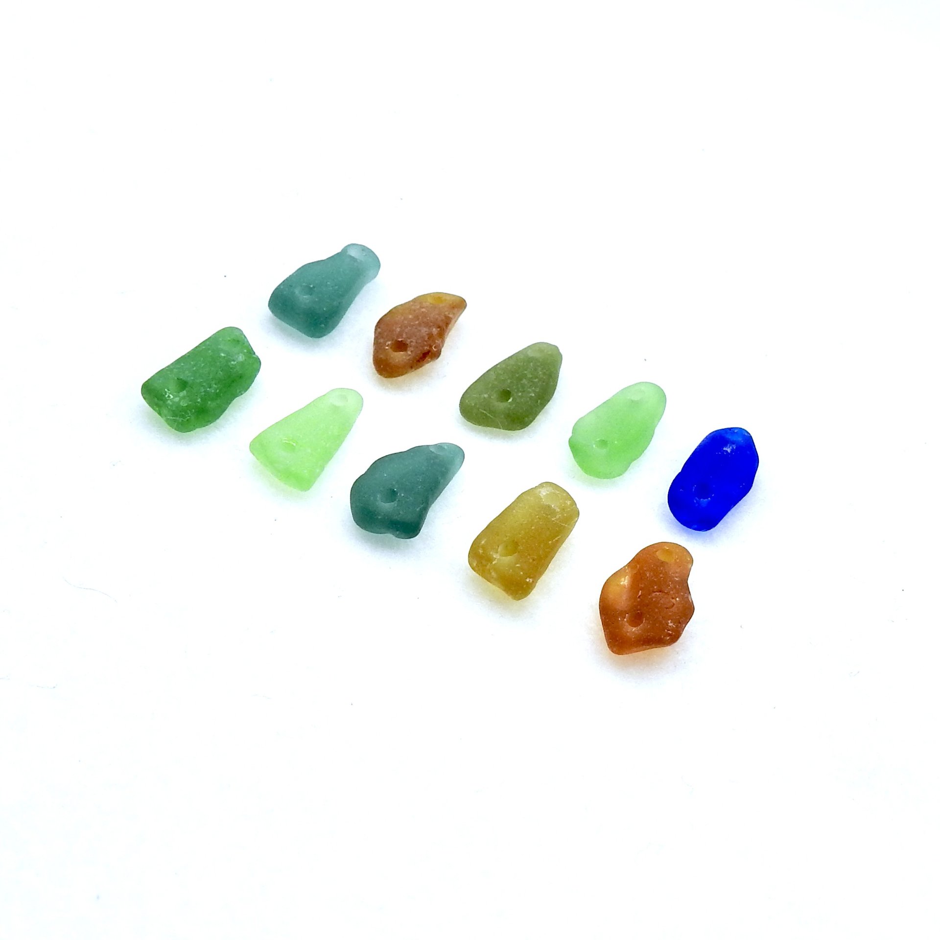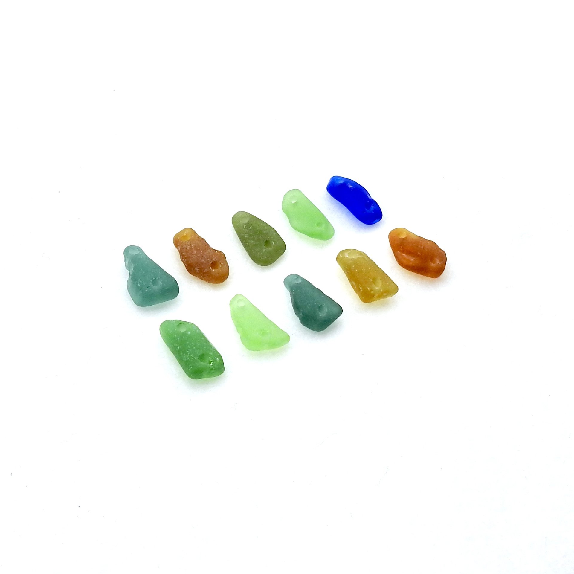 Tiny rectangle shaped sea glass beads, set of 10, in assorted colours with two drilled holes for jewelry making, sun catcher accents, sew on decoration or other beach themed crafts.
