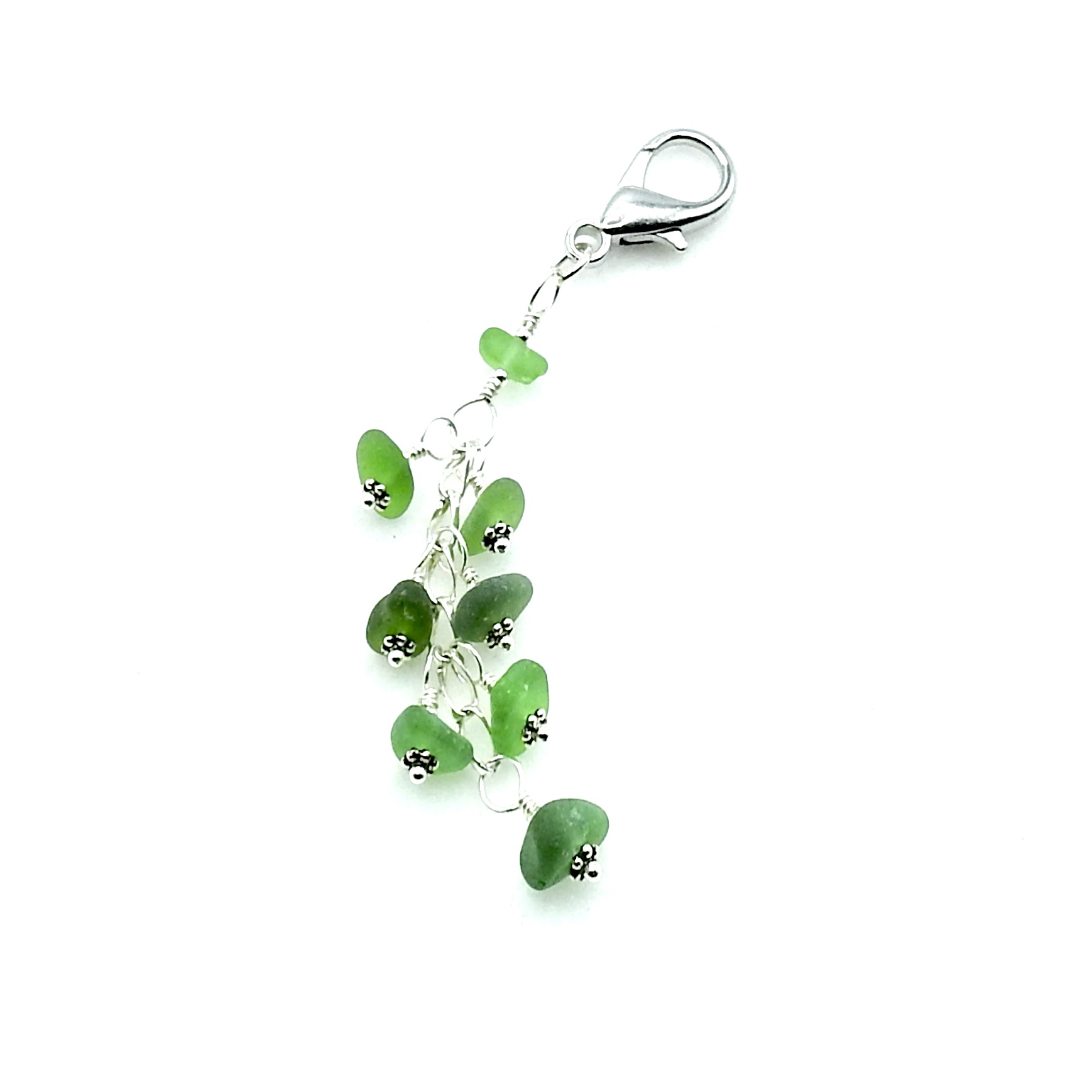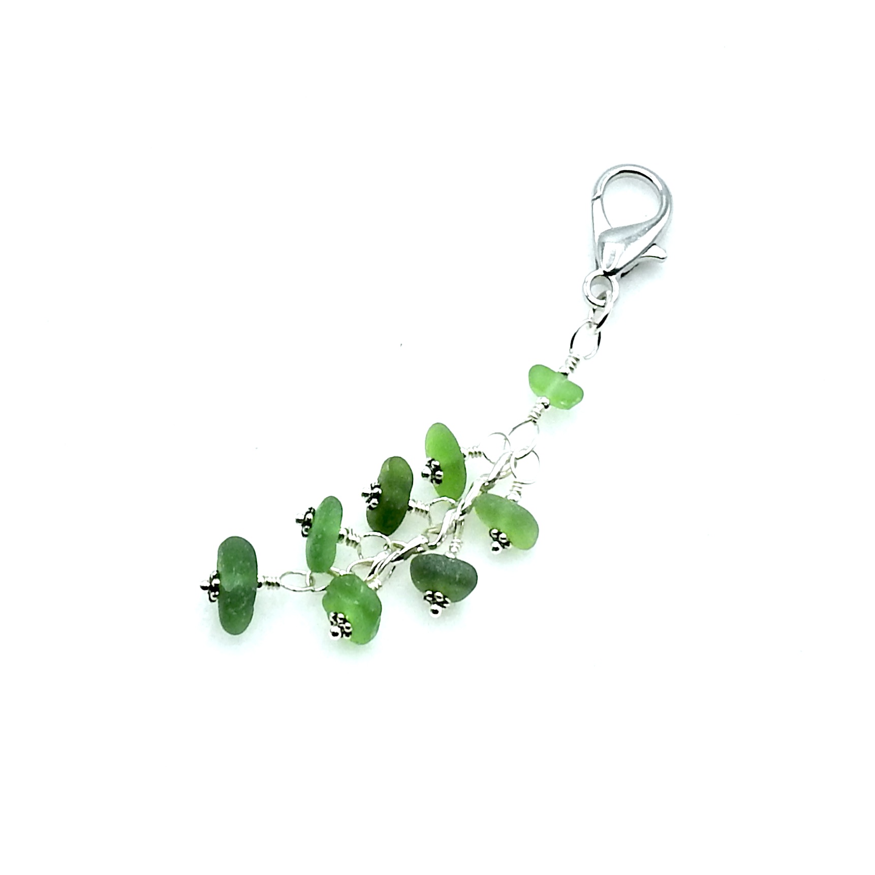A dainty clip on purse dangle or bag charm, handmade with genuine sea glass in shades of green. It could also be used as a zipper pull charm or could be attached to a keychain or backpack.