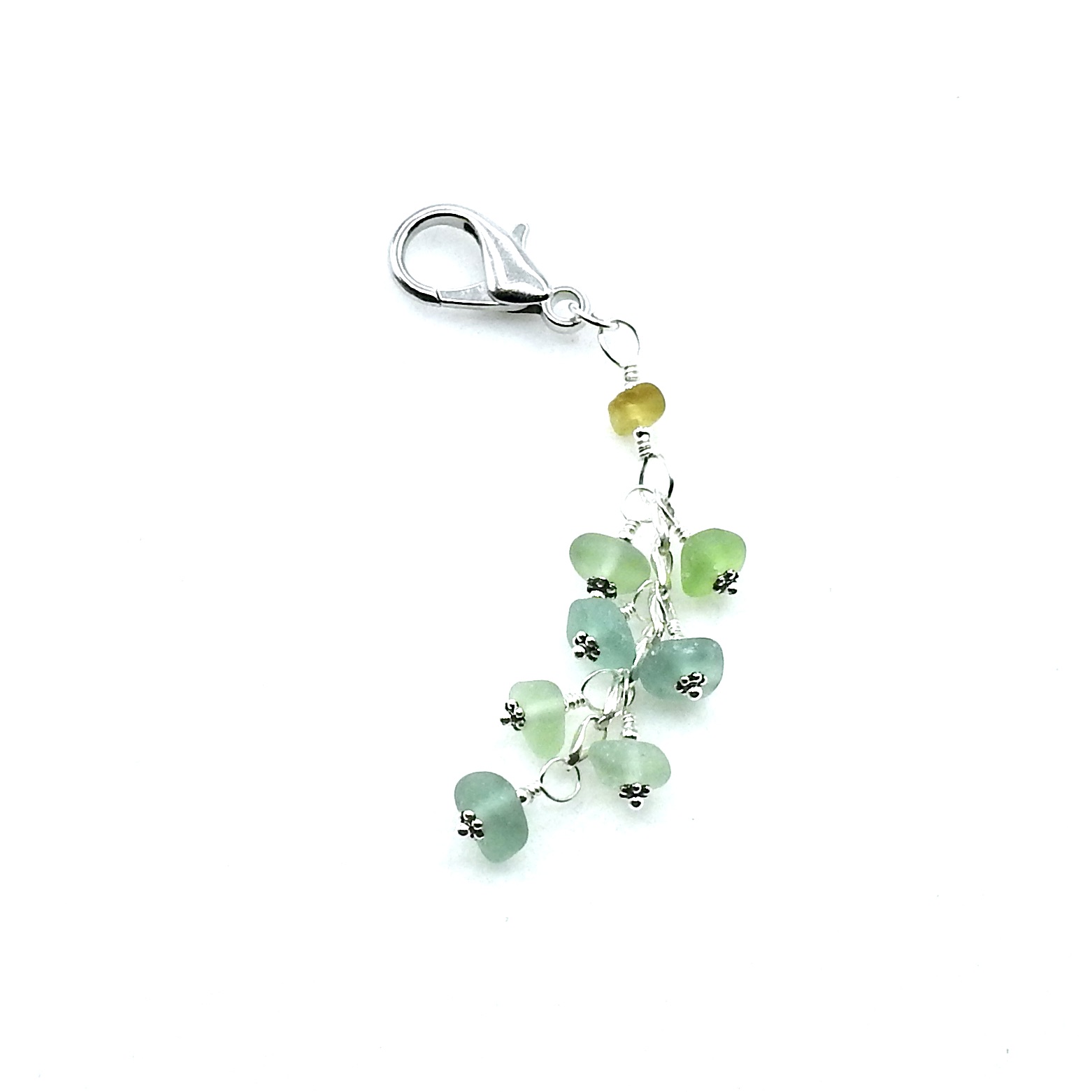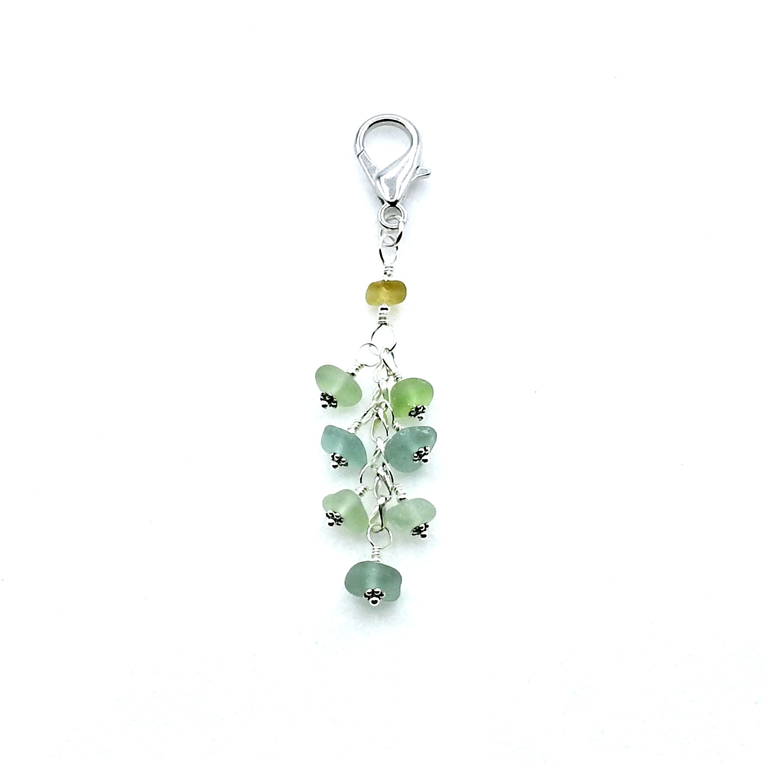A clip on charm dangle, handmade with genuine sea glass in a cluster style for bags, purses, backpacks or keychains.