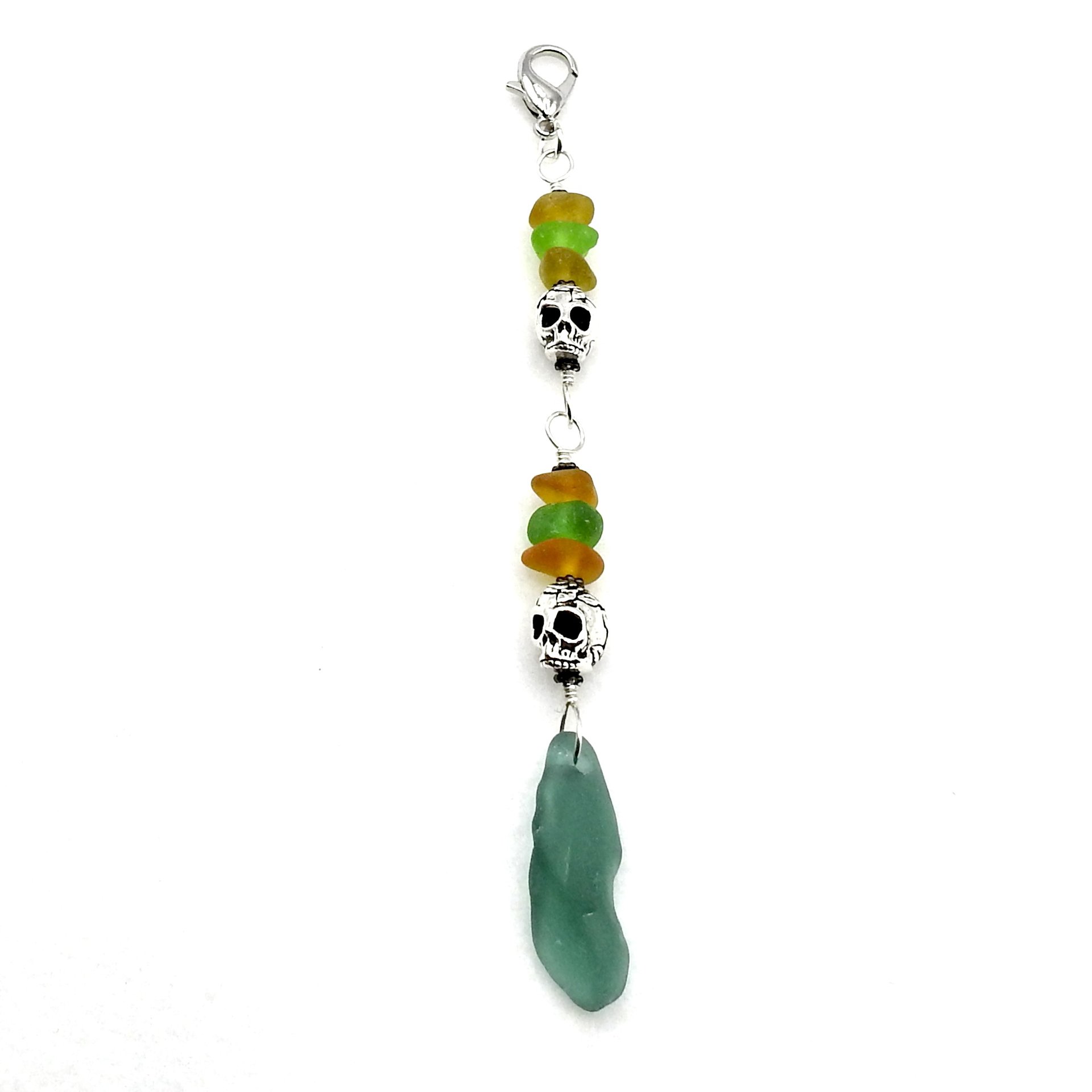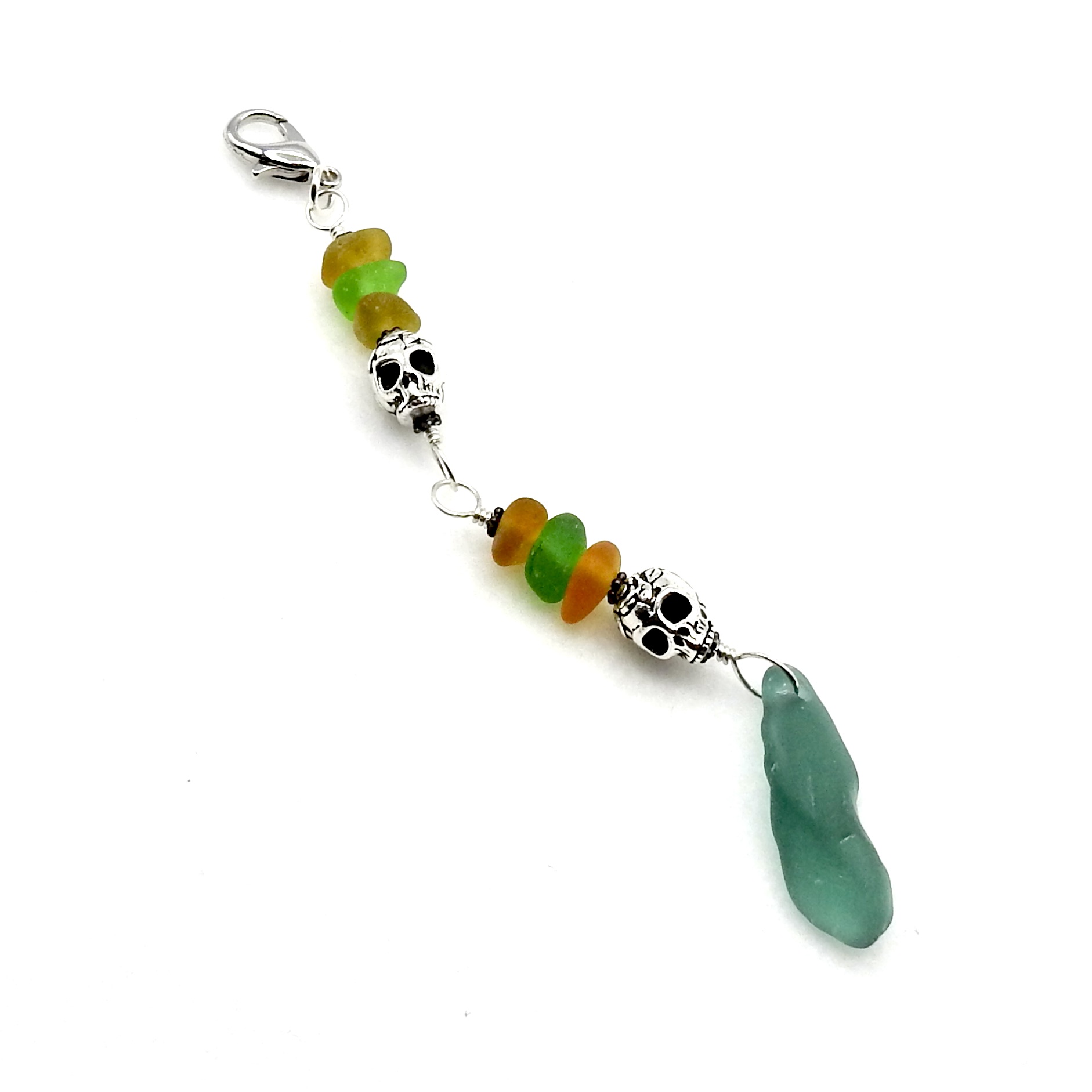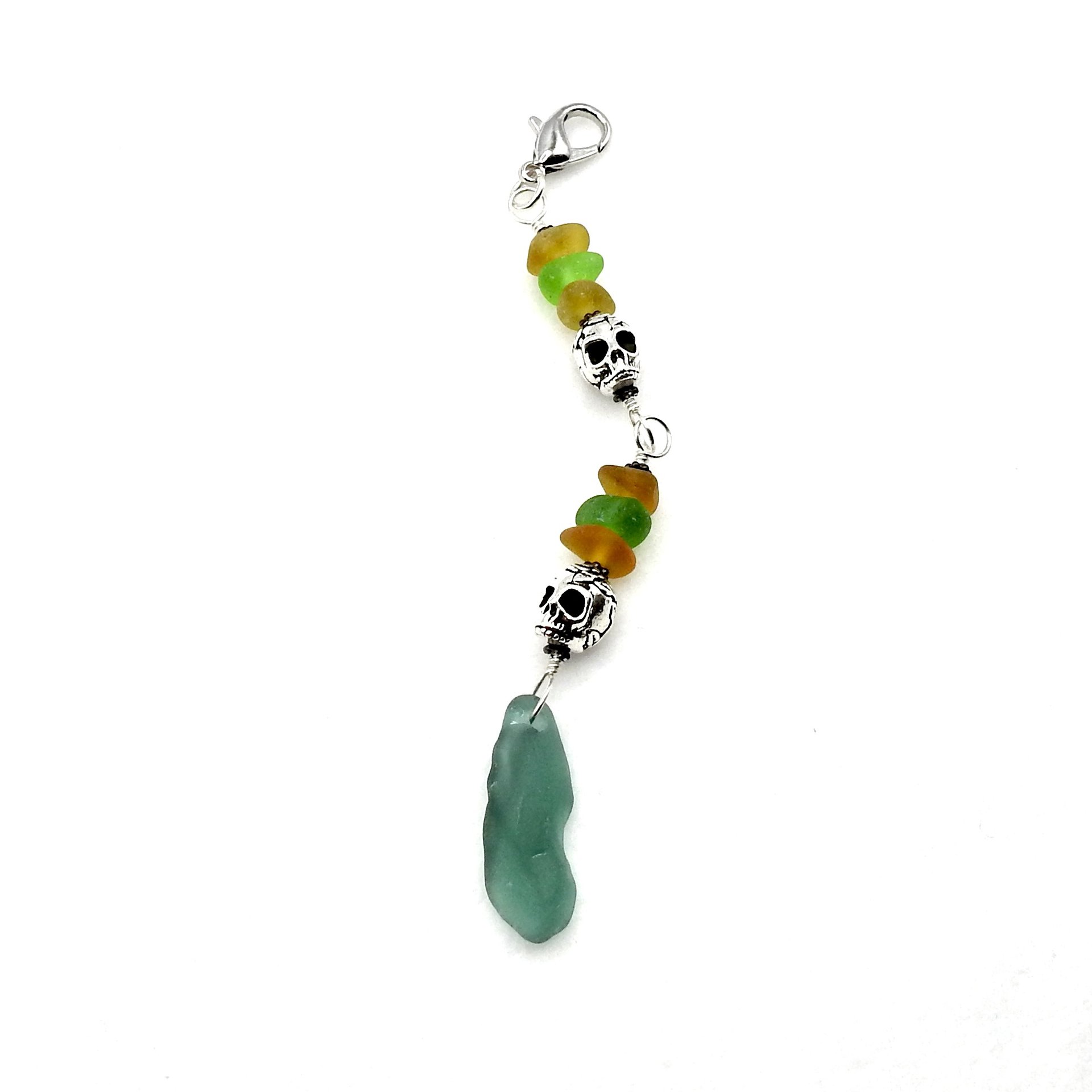 A clip on skull dangle zipper pull charm, handmade in Canada with genuine sea glass for keychains, jackets, purses, handbags or backpacks.