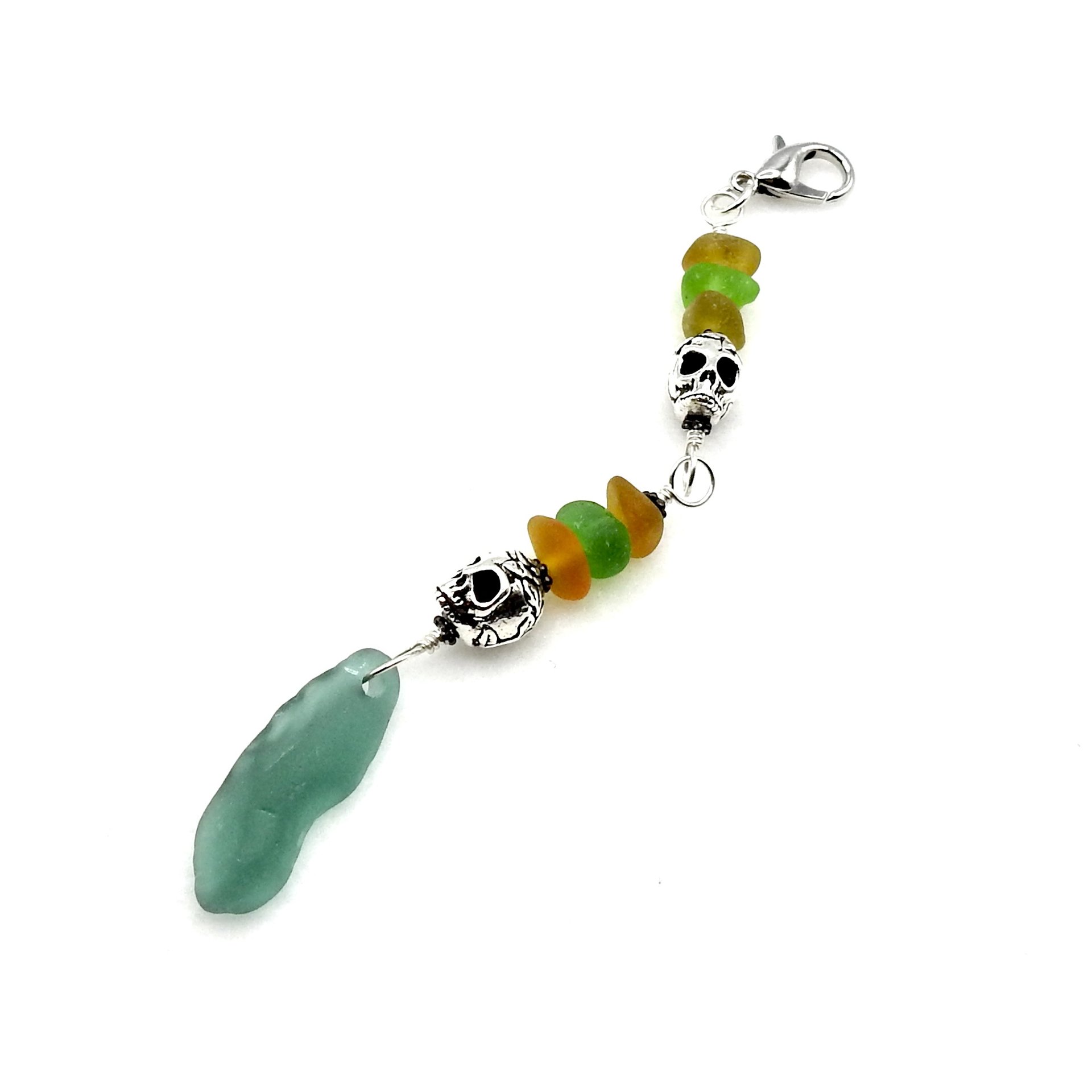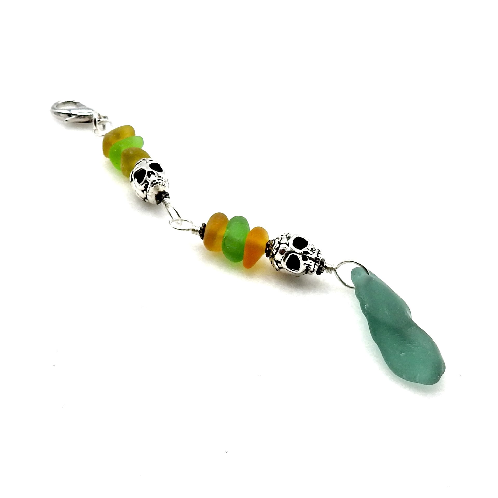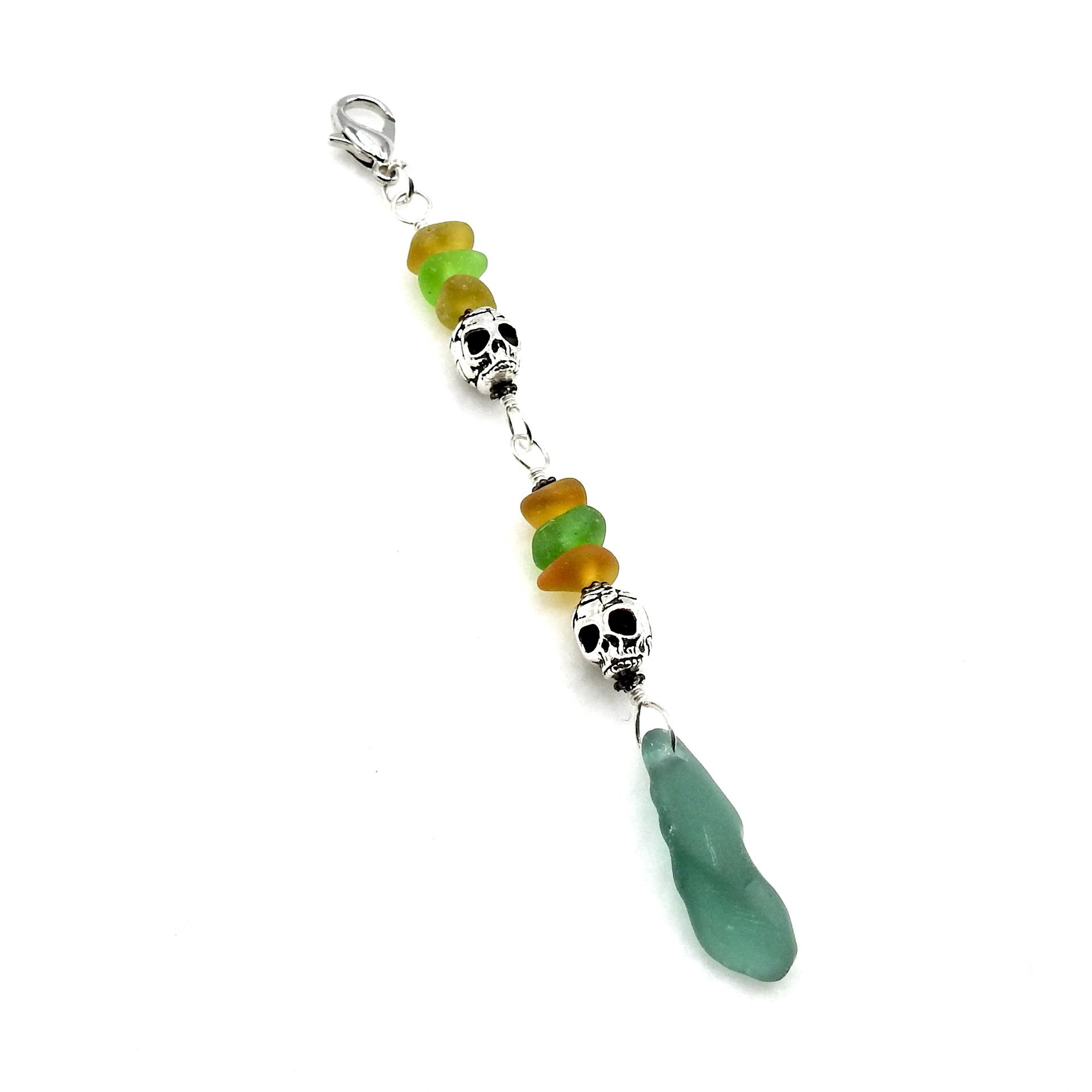 A clip on skull dangle zipper pull charm, handmade in Canada with genuine sea glass for keychains, jackets, purses, handbags or backpacks.
