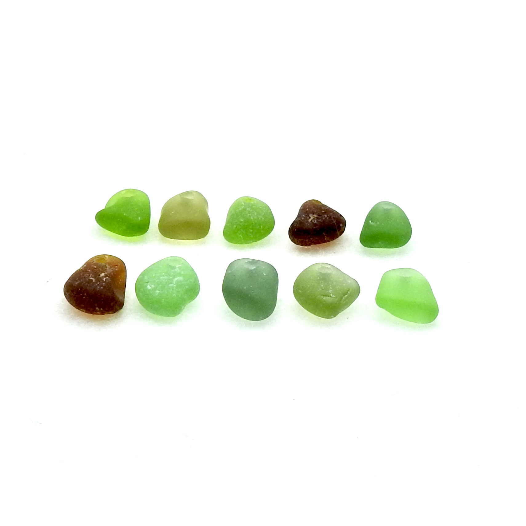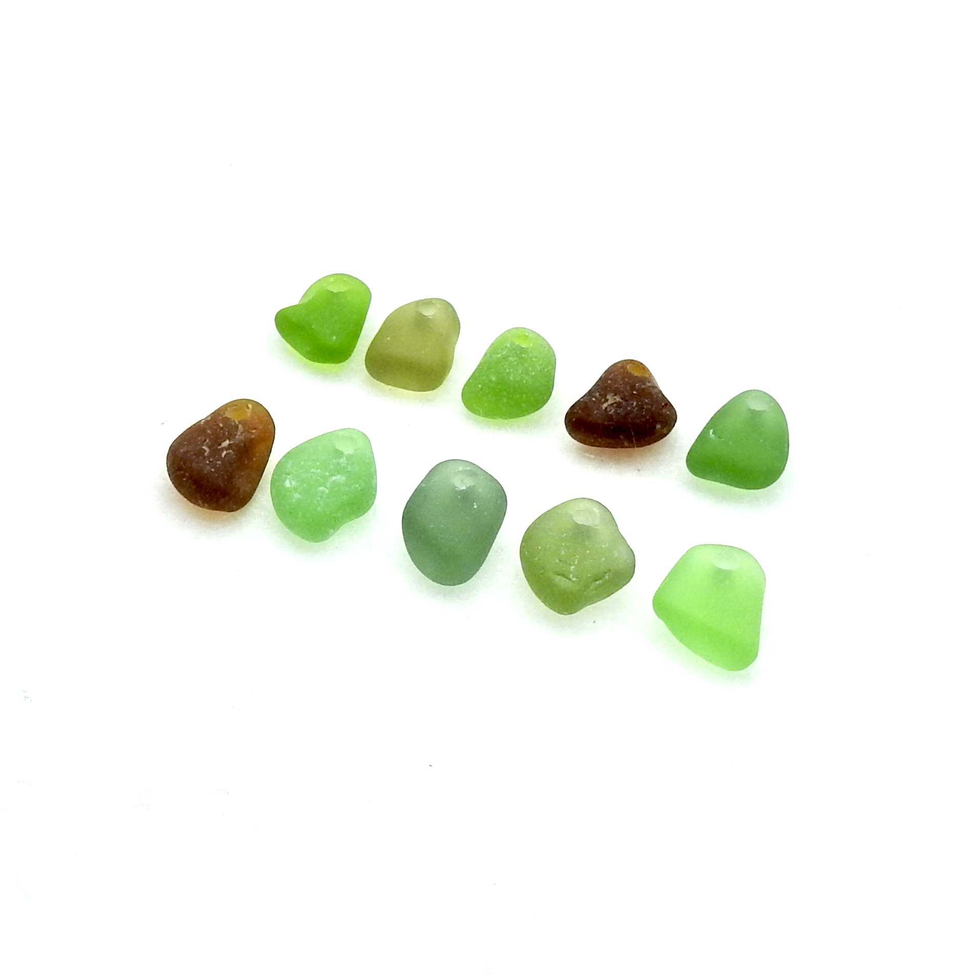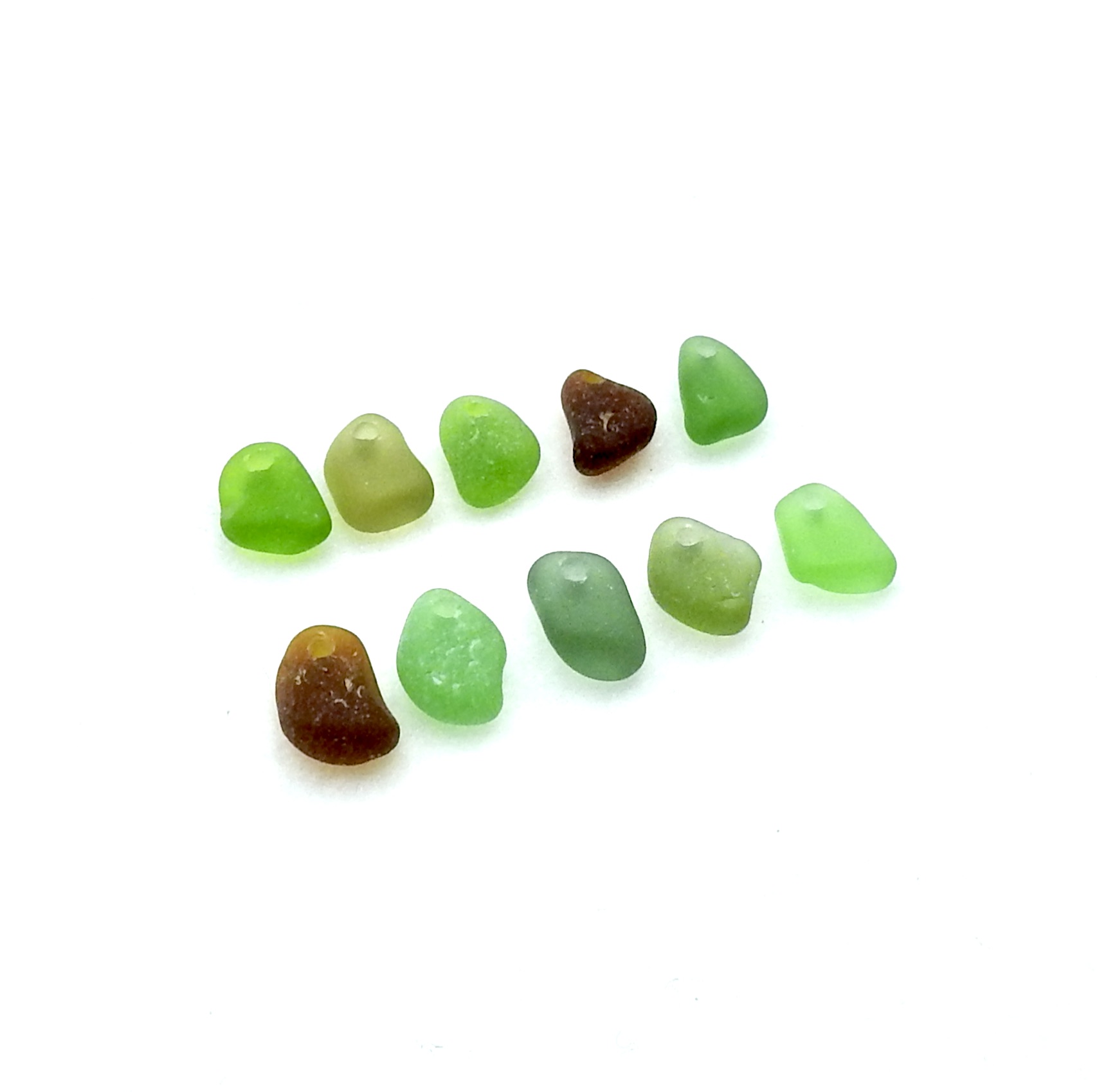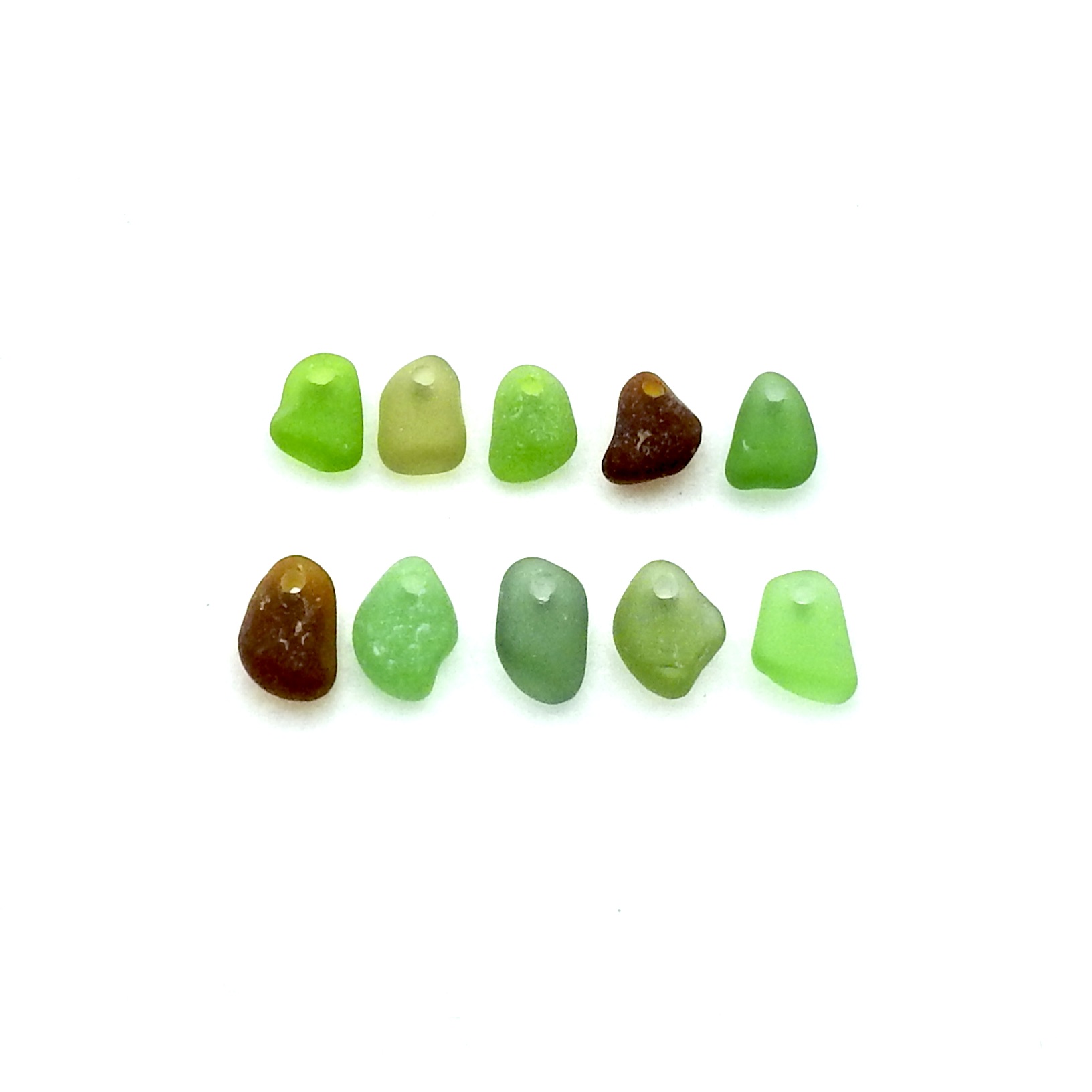 Genuine sea glass charms, set of 10, in earth tone colours of brown and green with top drilled holes for jewelry making or other beach themed crafts.