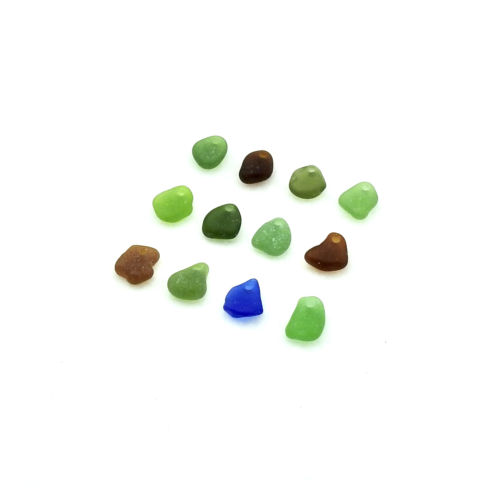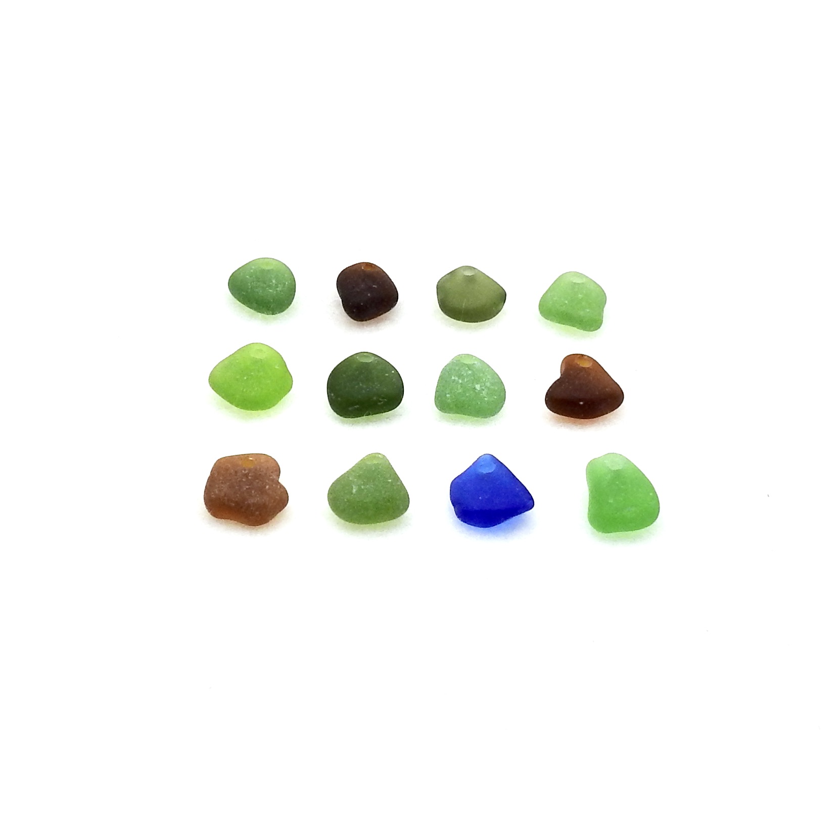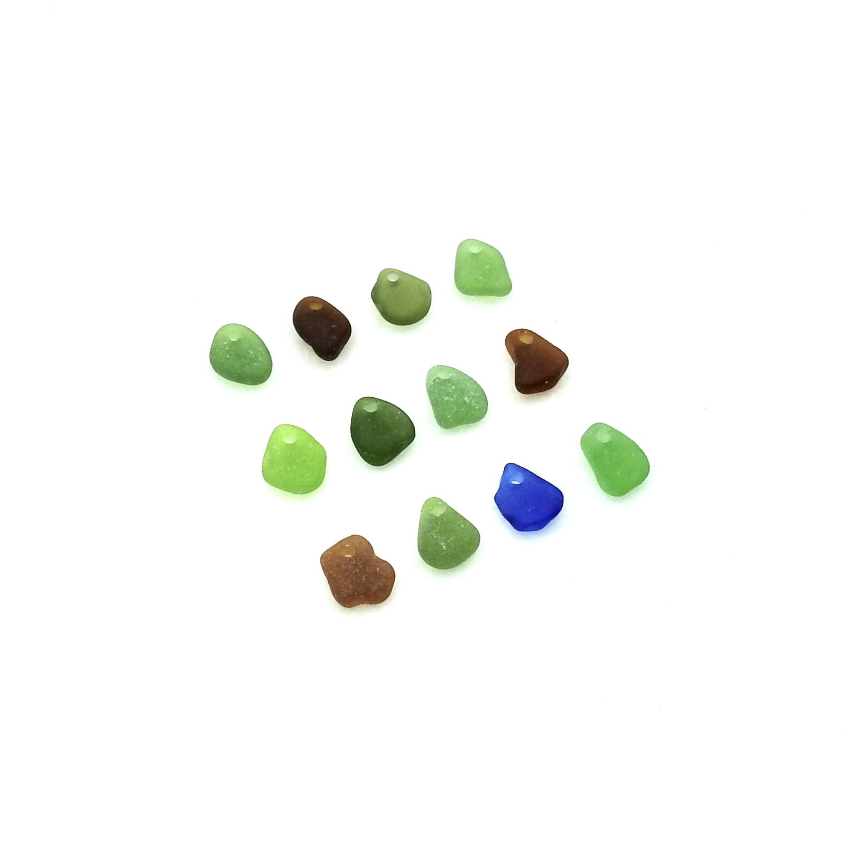 Small genuine sea glass charms, set of 12, in mixed colours with top drilled holes for jewelry making, sew on beads for fringe and decoration or other beach themed crafts.