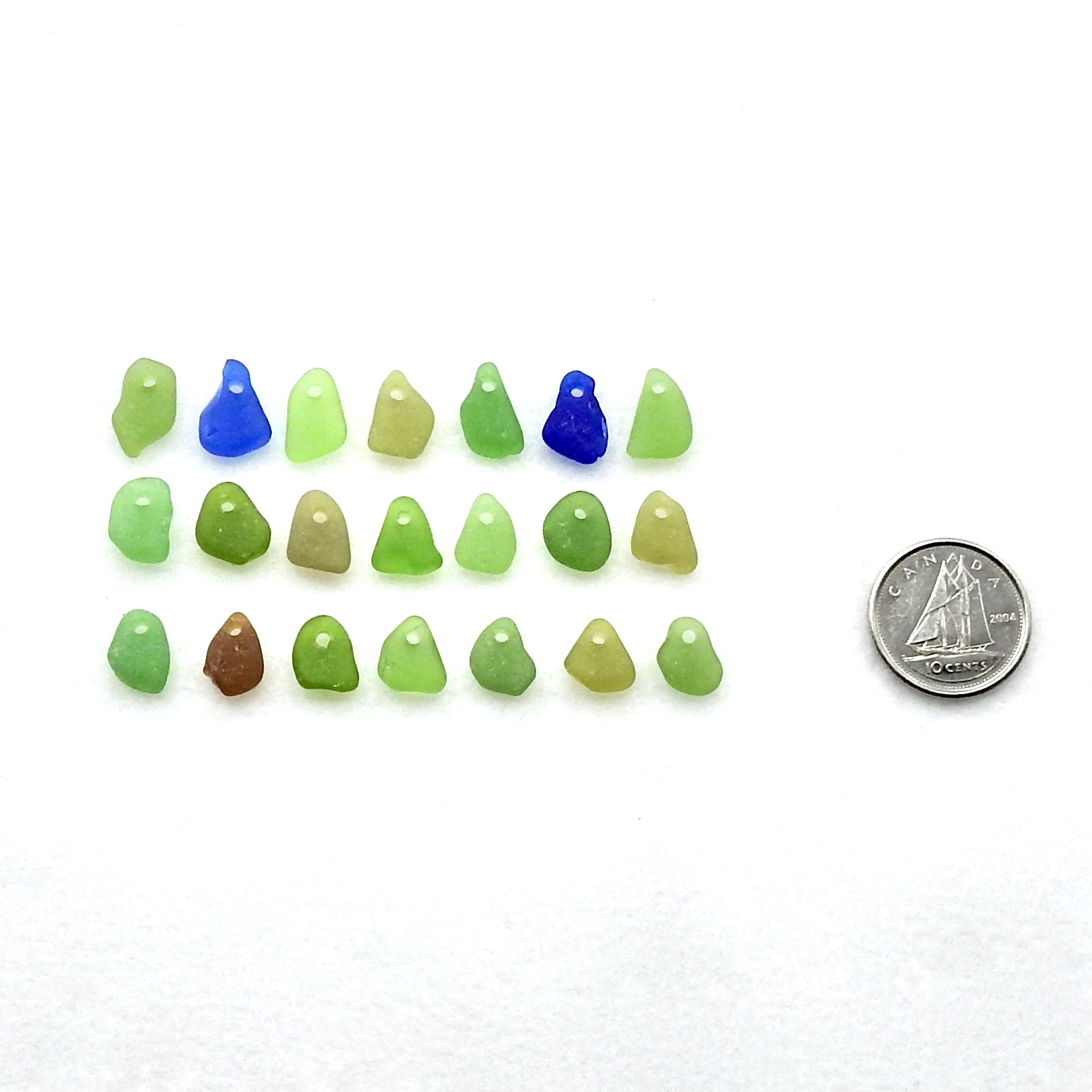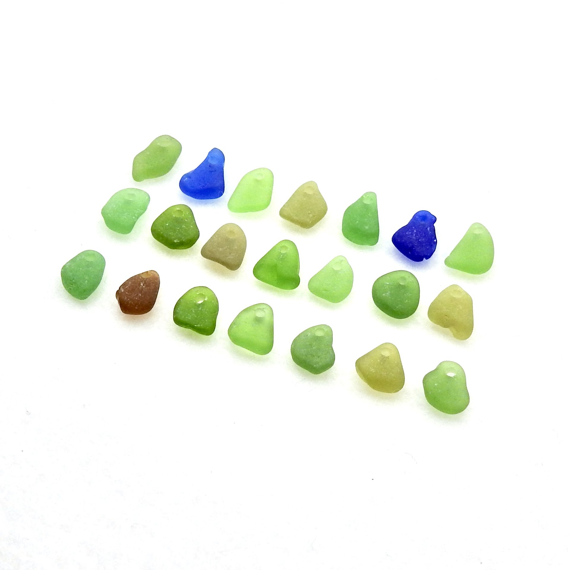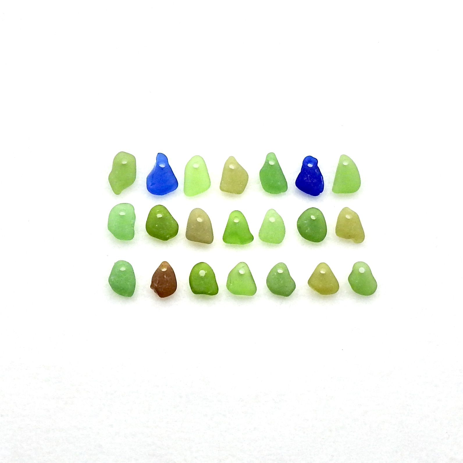 Tiny genuine sea glass charms, set of 21 in assorted colours, with top drilled holes for jewelry making, sew on or other beach themed crafts.