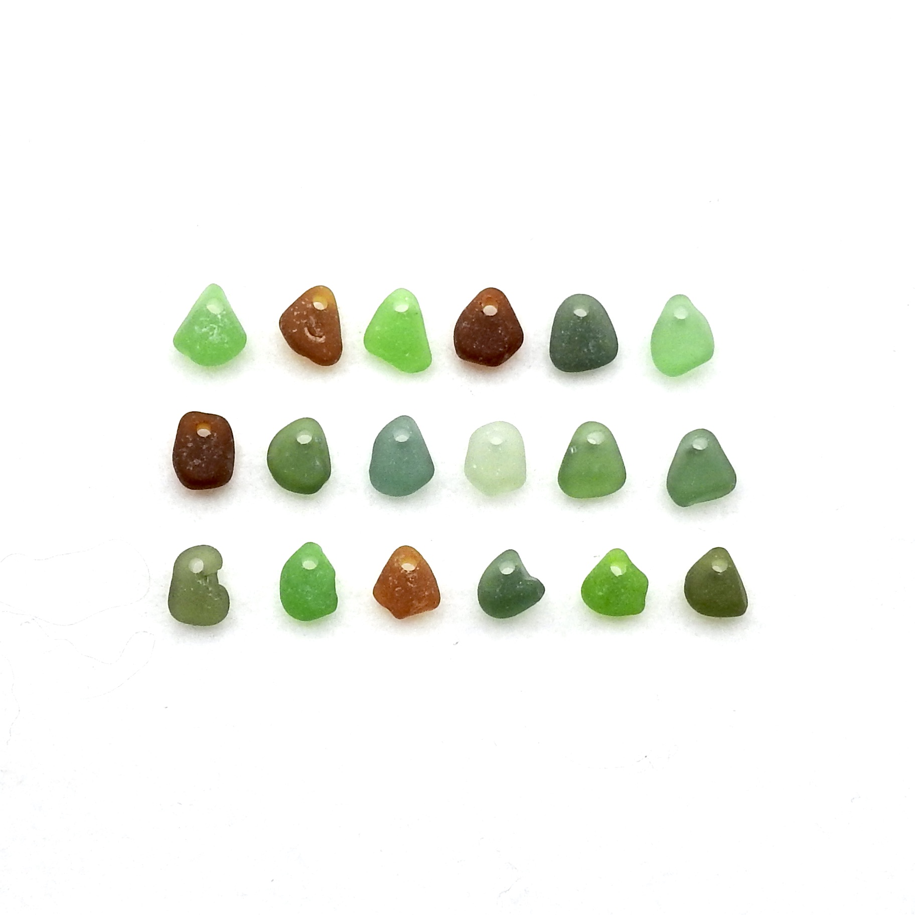 Real sea glass tiny to small charms in mixed colours, set of 18, with top drilled holes for jewelry making or other beached themed crafts.
