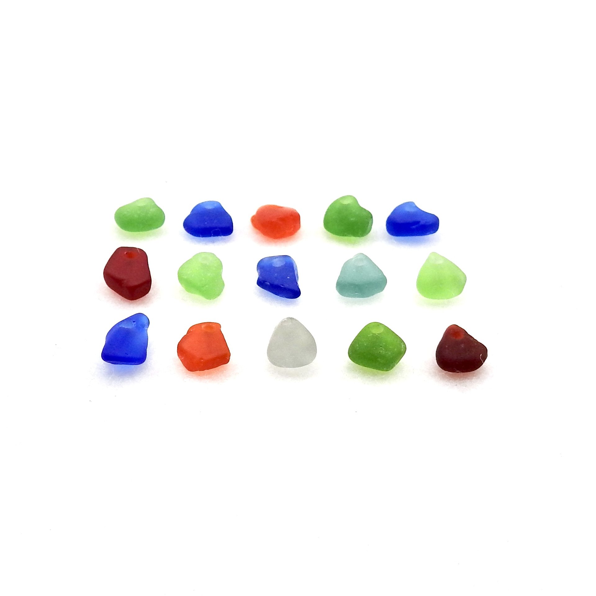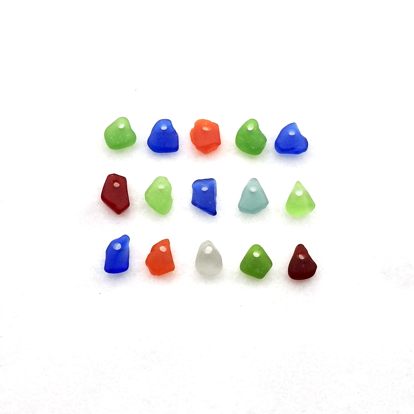 Tiny genuine sea glass charms, set of 15, with top drilled holes for jewelry making, sew on fringe or other beach themed crafts.