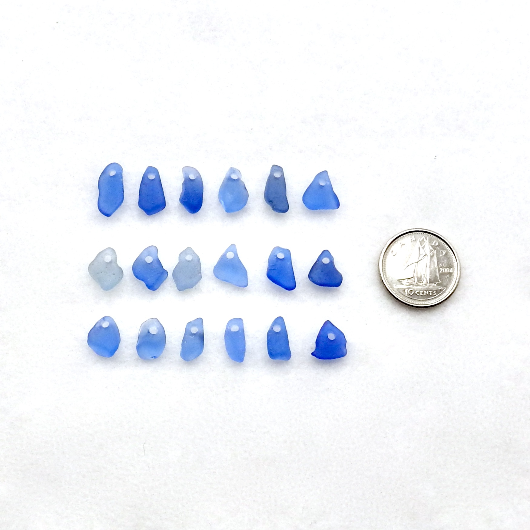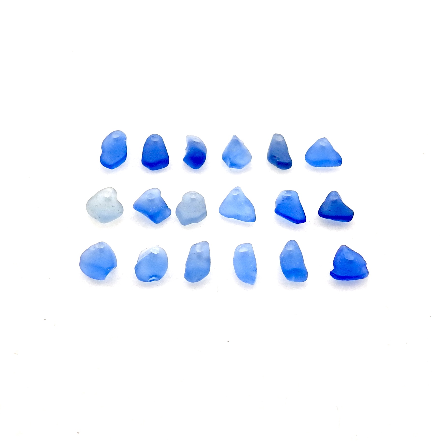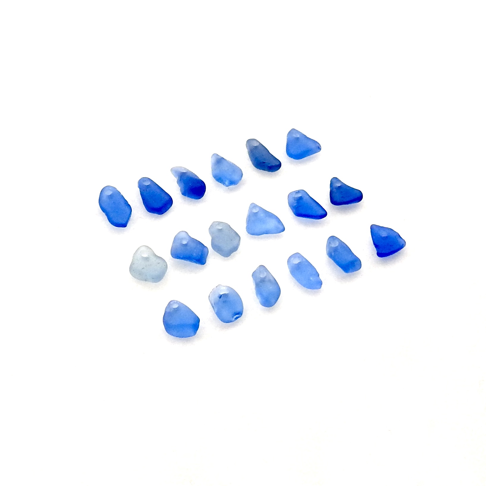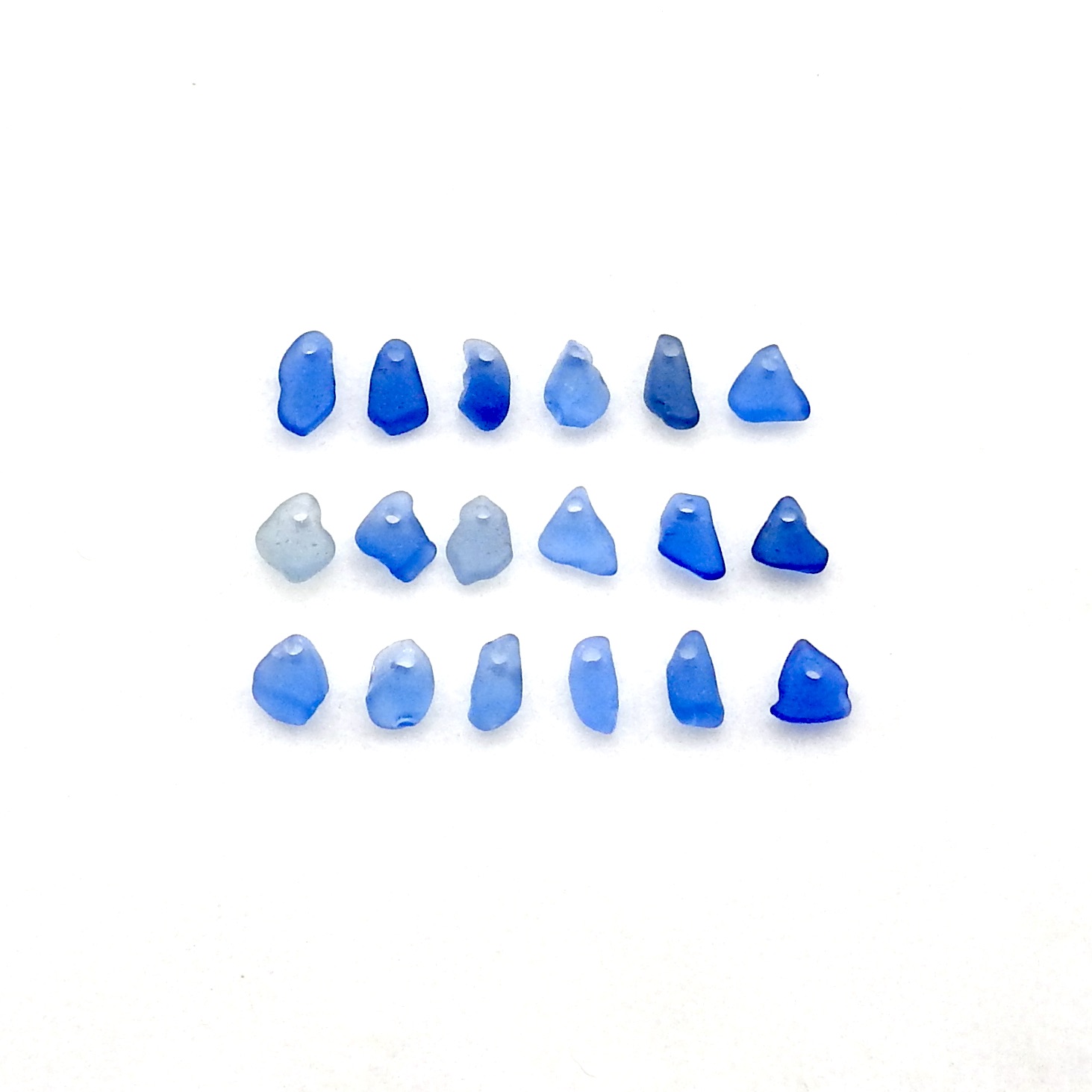 Very tiny genuine sea glass charms, set of 18, in shades of cornflower blue with top drilled holes for jewelry making, sew on fringe or other beach themed crafts.