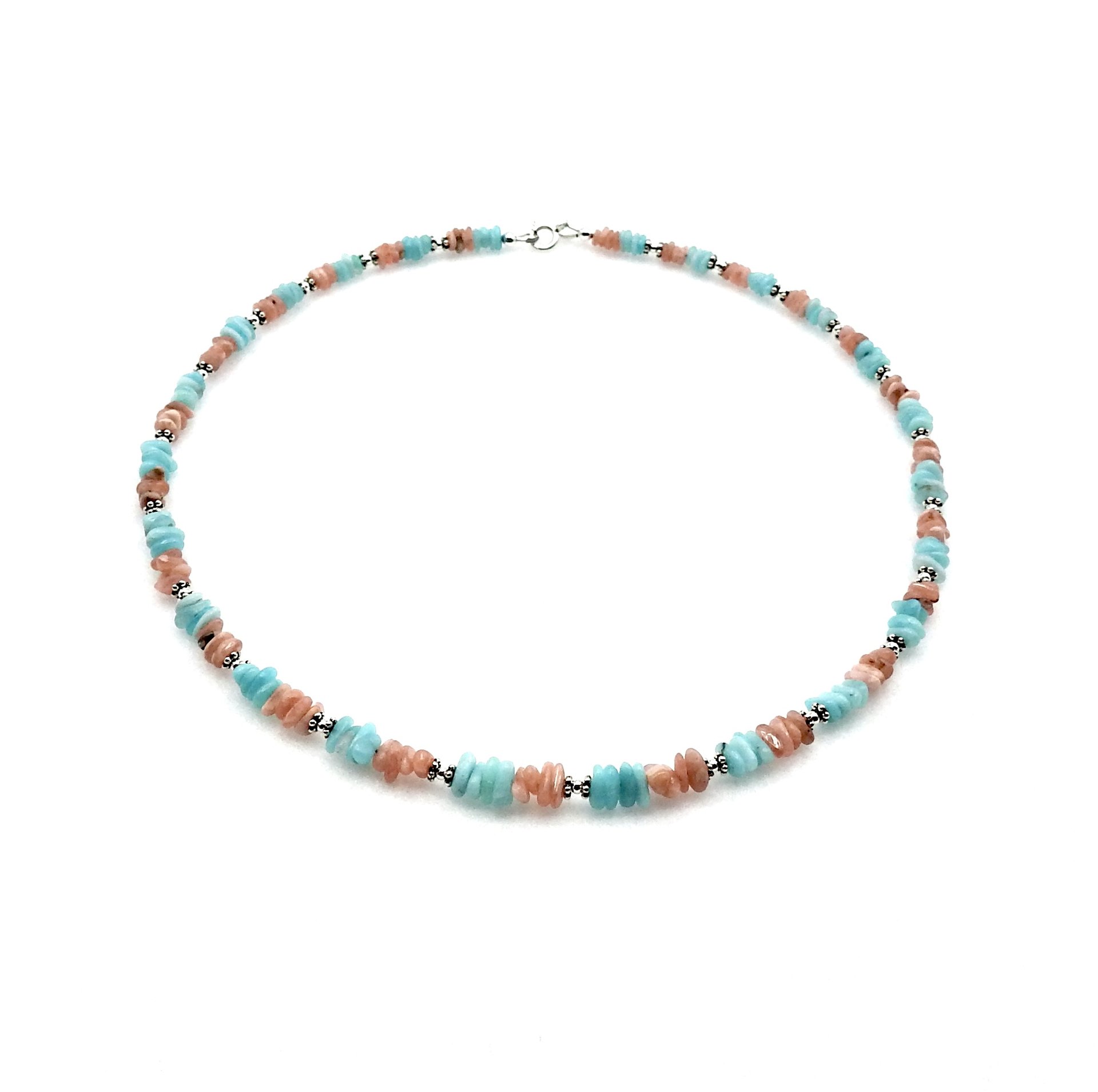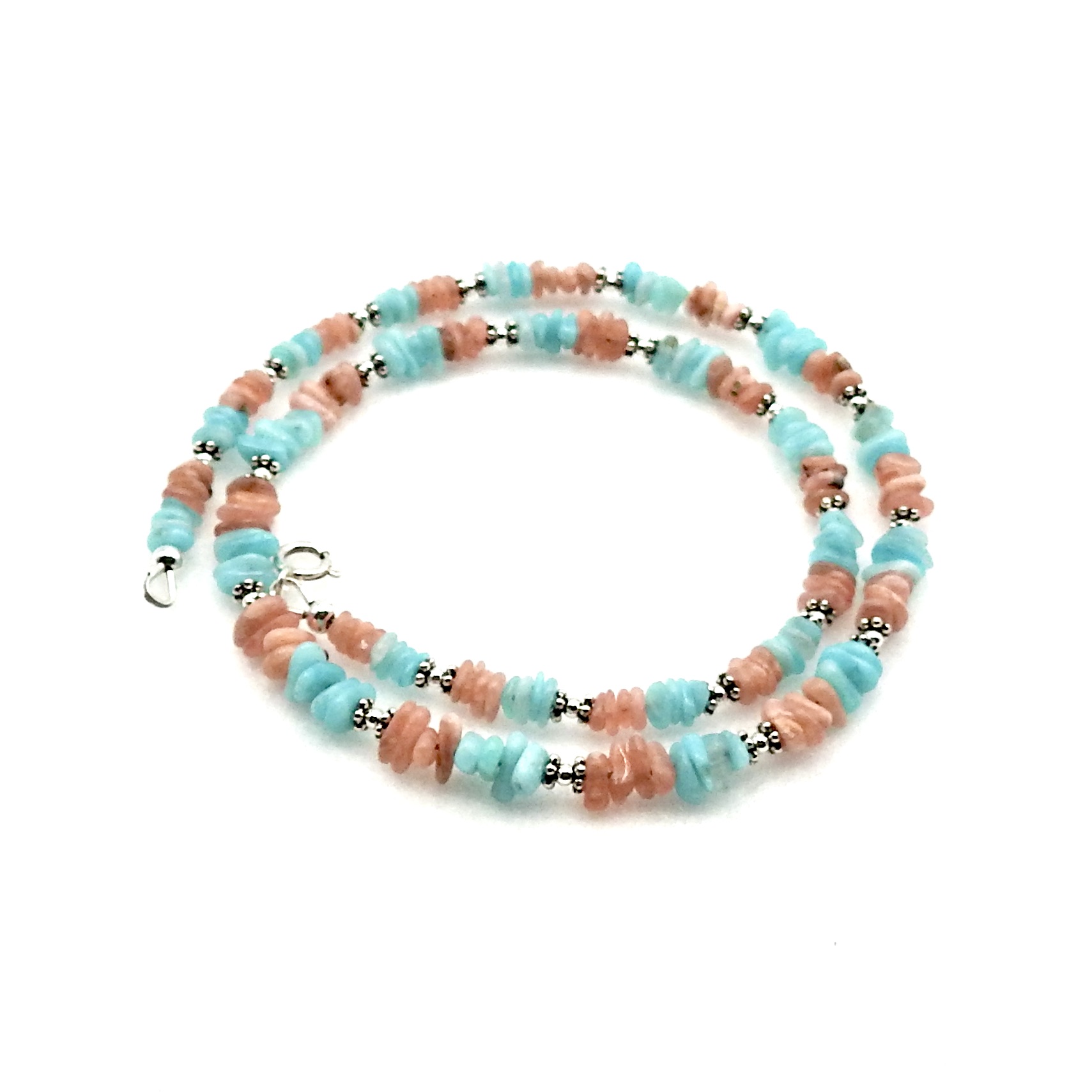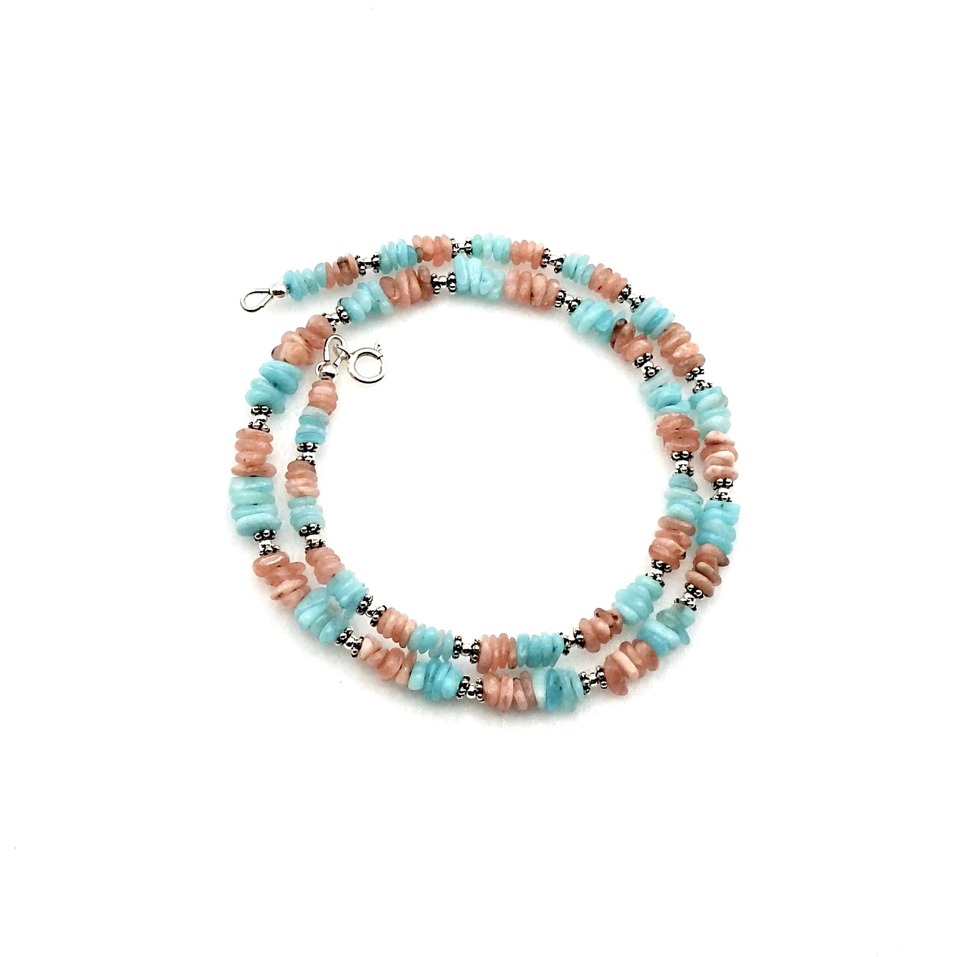 This blue and coral colour jewelry is handcrafted with tiny amazonite and rhodochrosite gemstone beads.